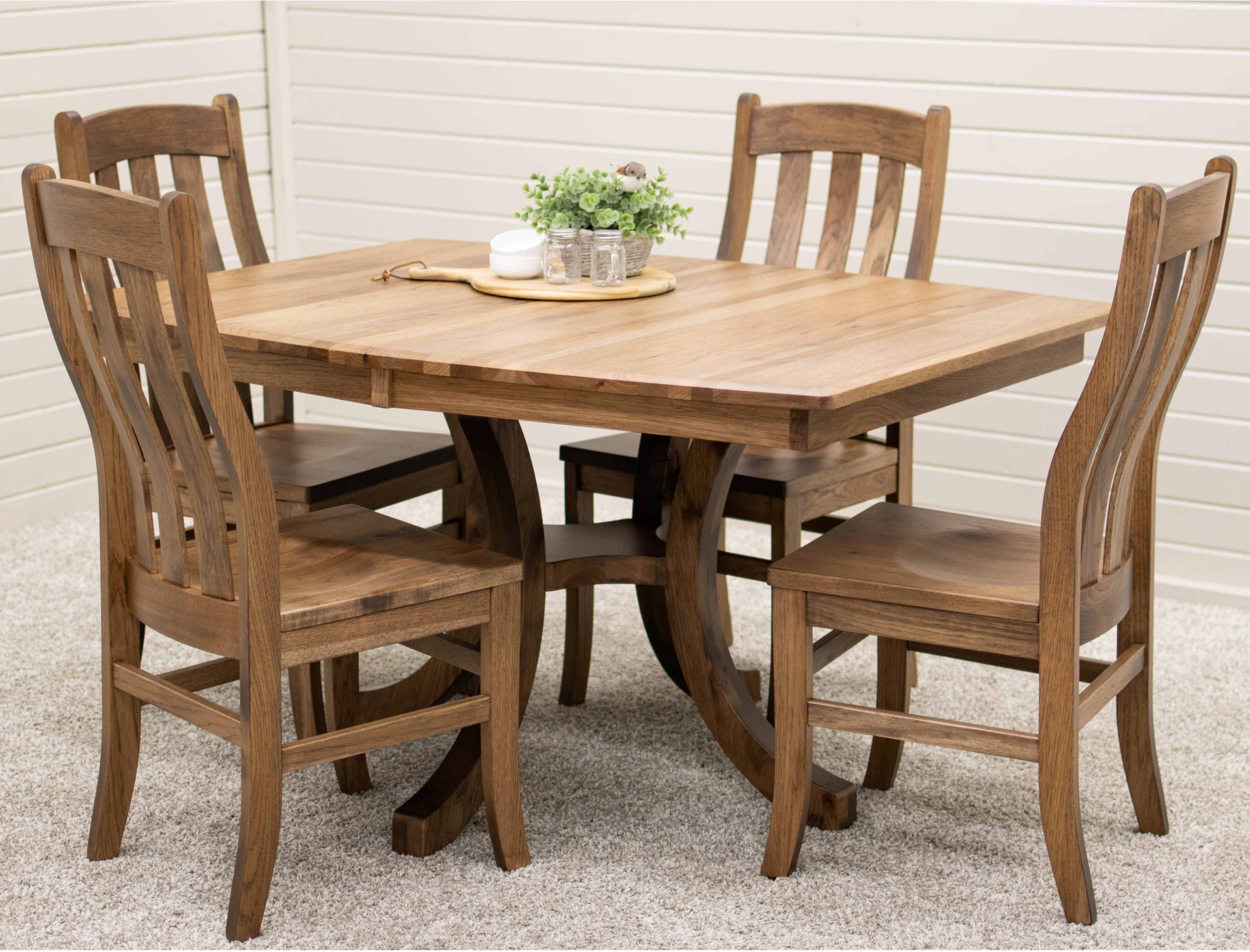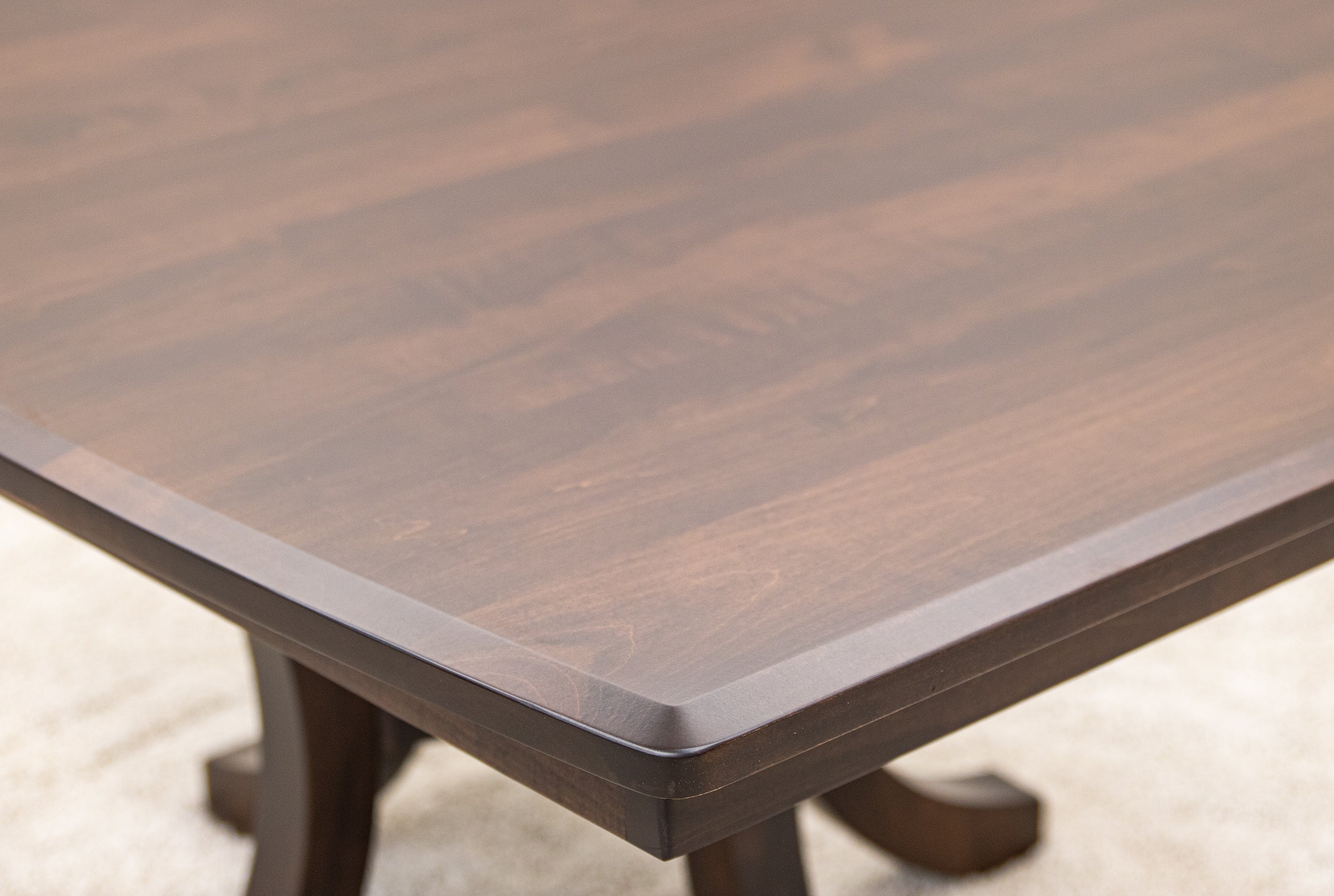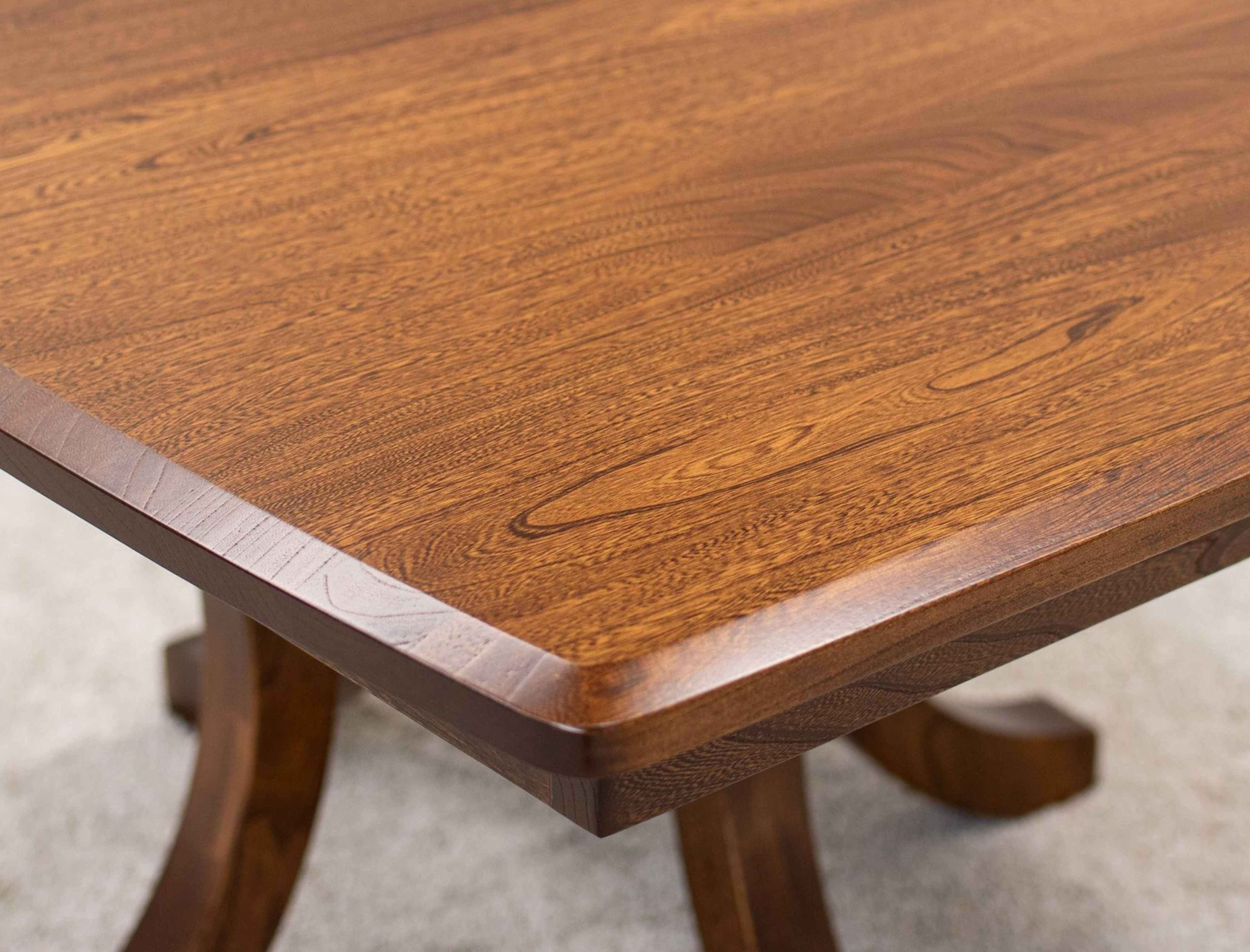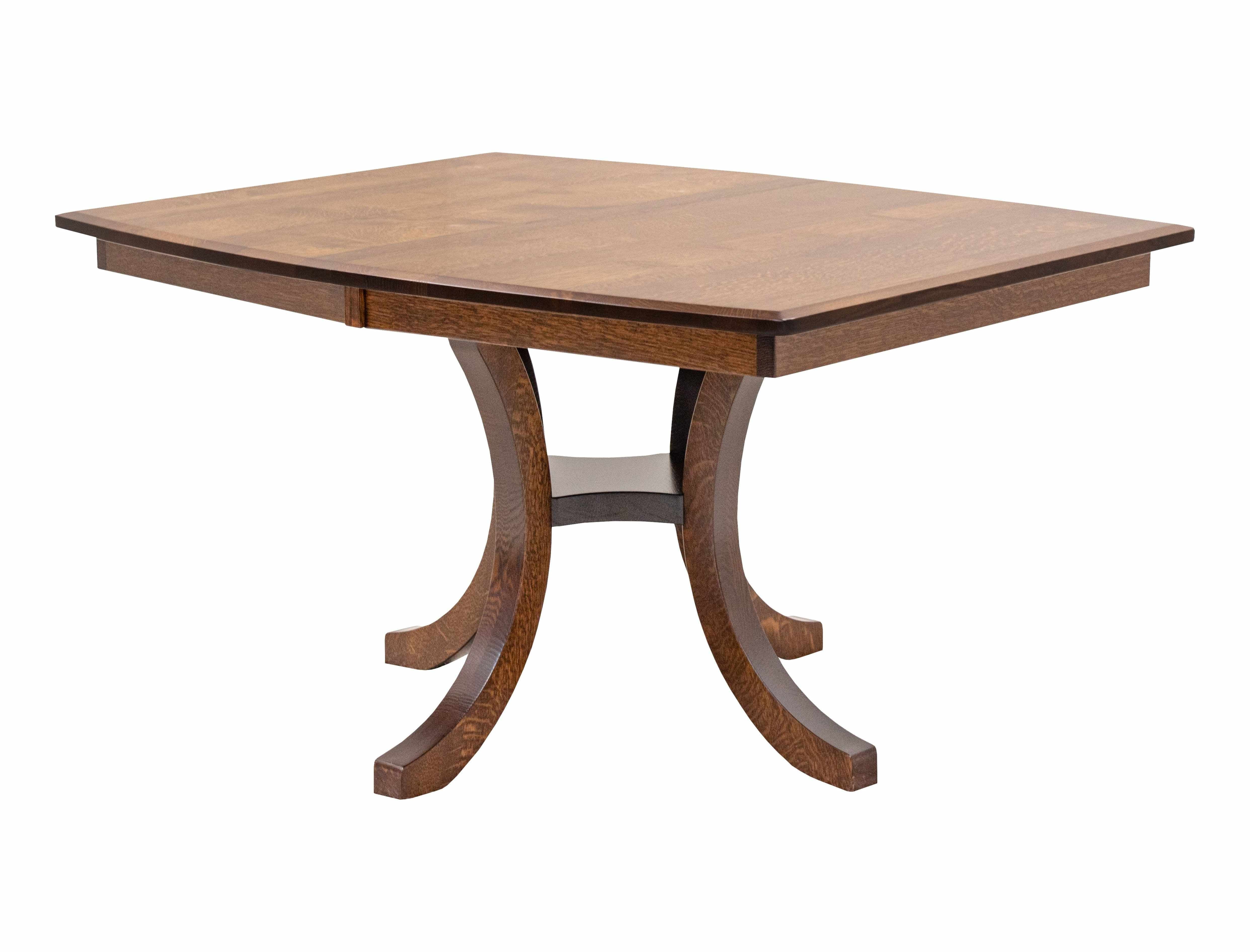 The Carlisle Single Pedestal Extending Dining Table features a solid 1" thick top and a bevel edge. The Amish dining table has self-storing leaves and it extends easily with gear slides. The grain runs lengthwise on a table without leaves The grain runs widthwise on a table with leaves. For more info, contact us at Dutch Craft Furniture.
