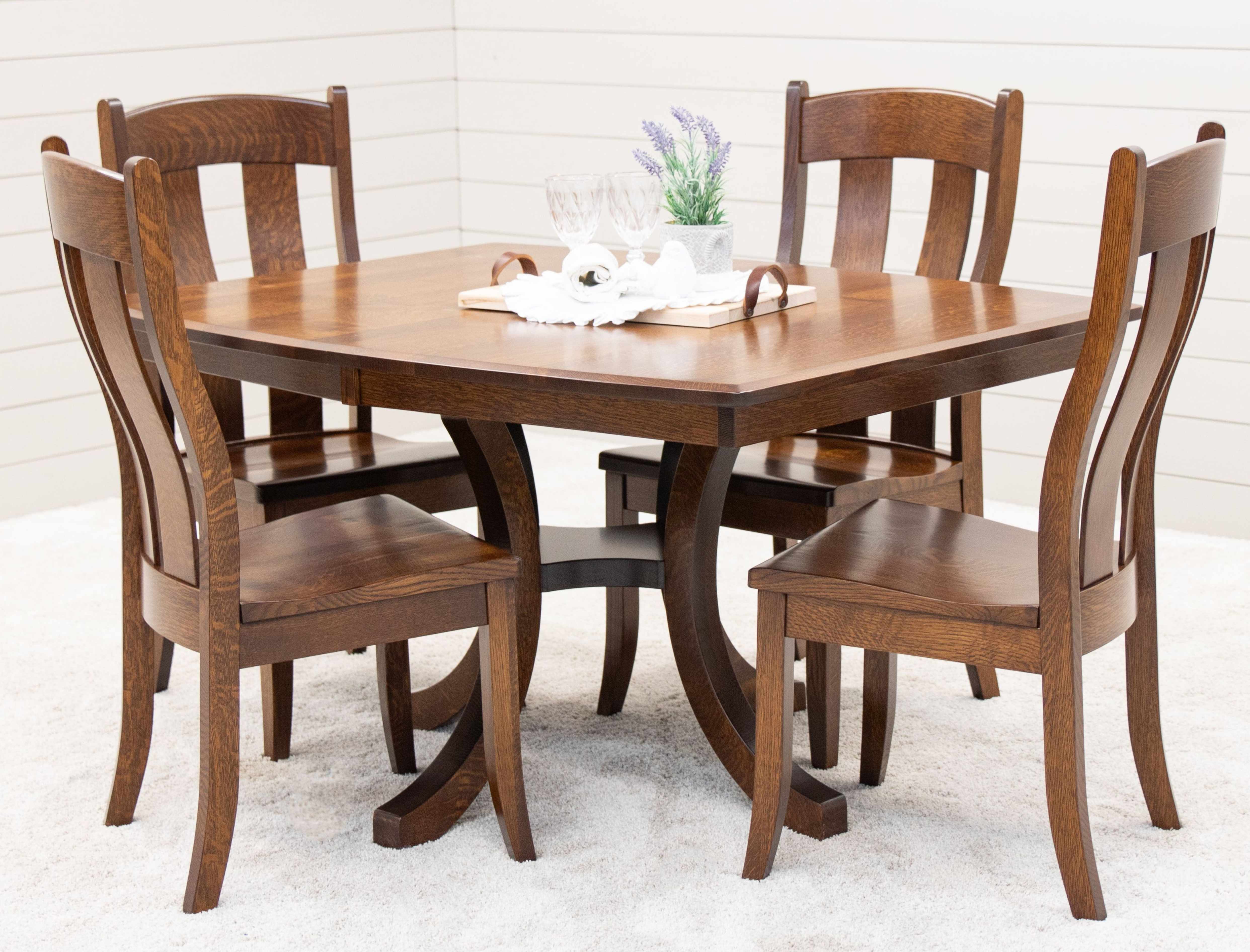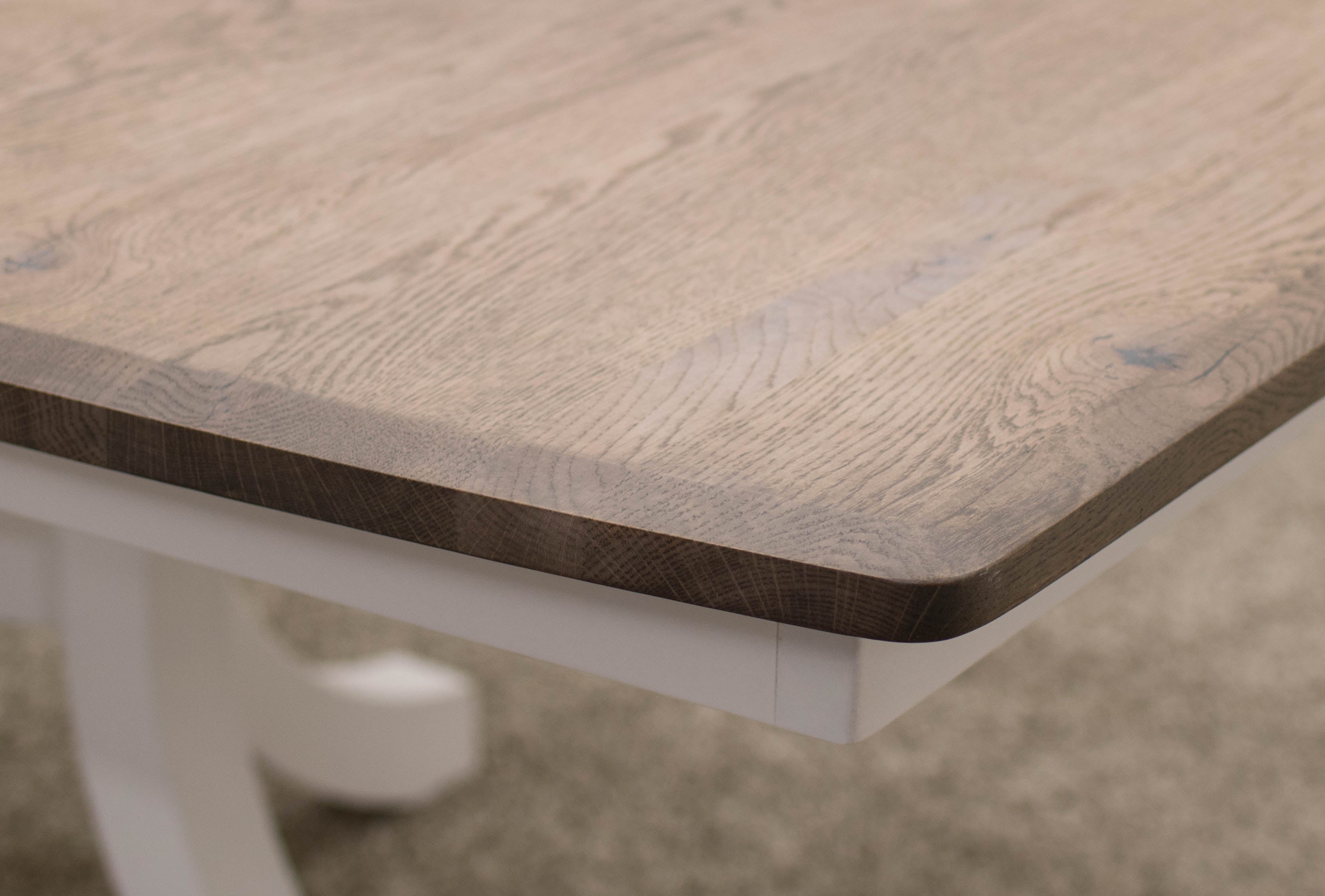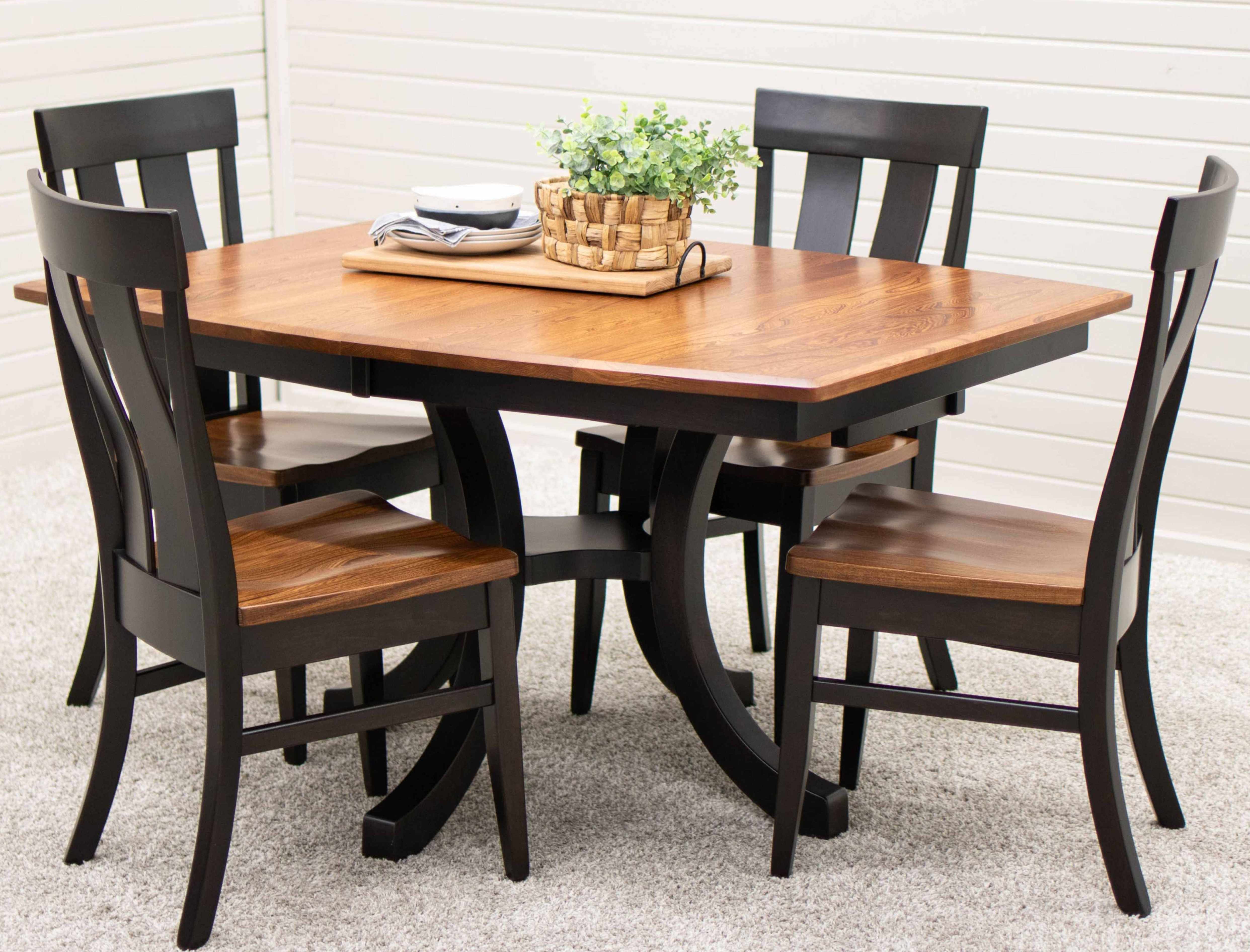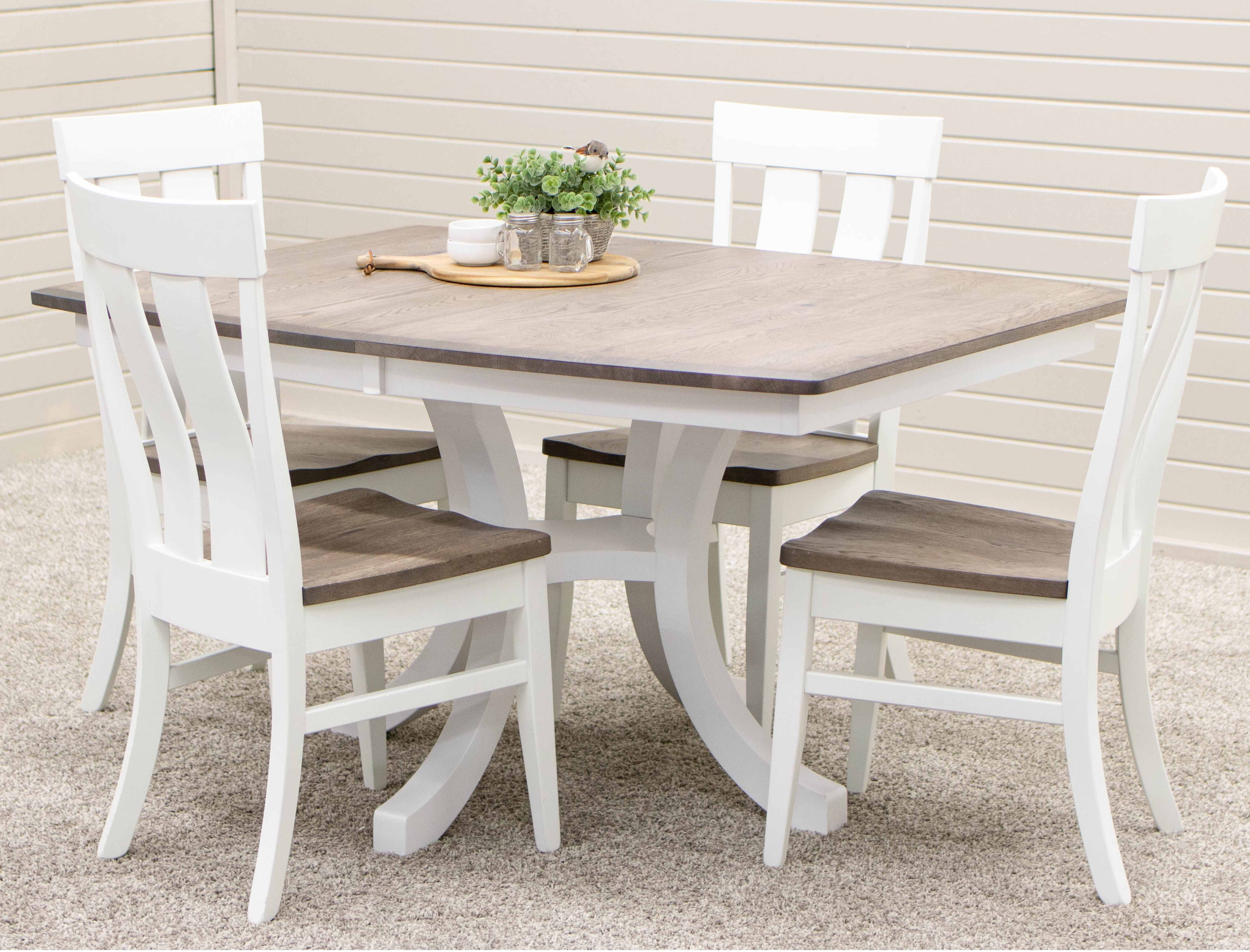 The Carlisle Single Pedestal Extending Dining Table features a solid 1" thick top and a bevel edge. The Amish dining table has self-storing leaves and it extends easily with gear slides. The grain runs lengthwise on a table without leaves The grain runs widthwise on a table with leaves. For more info, contact us at Dutch Craft Furniture.