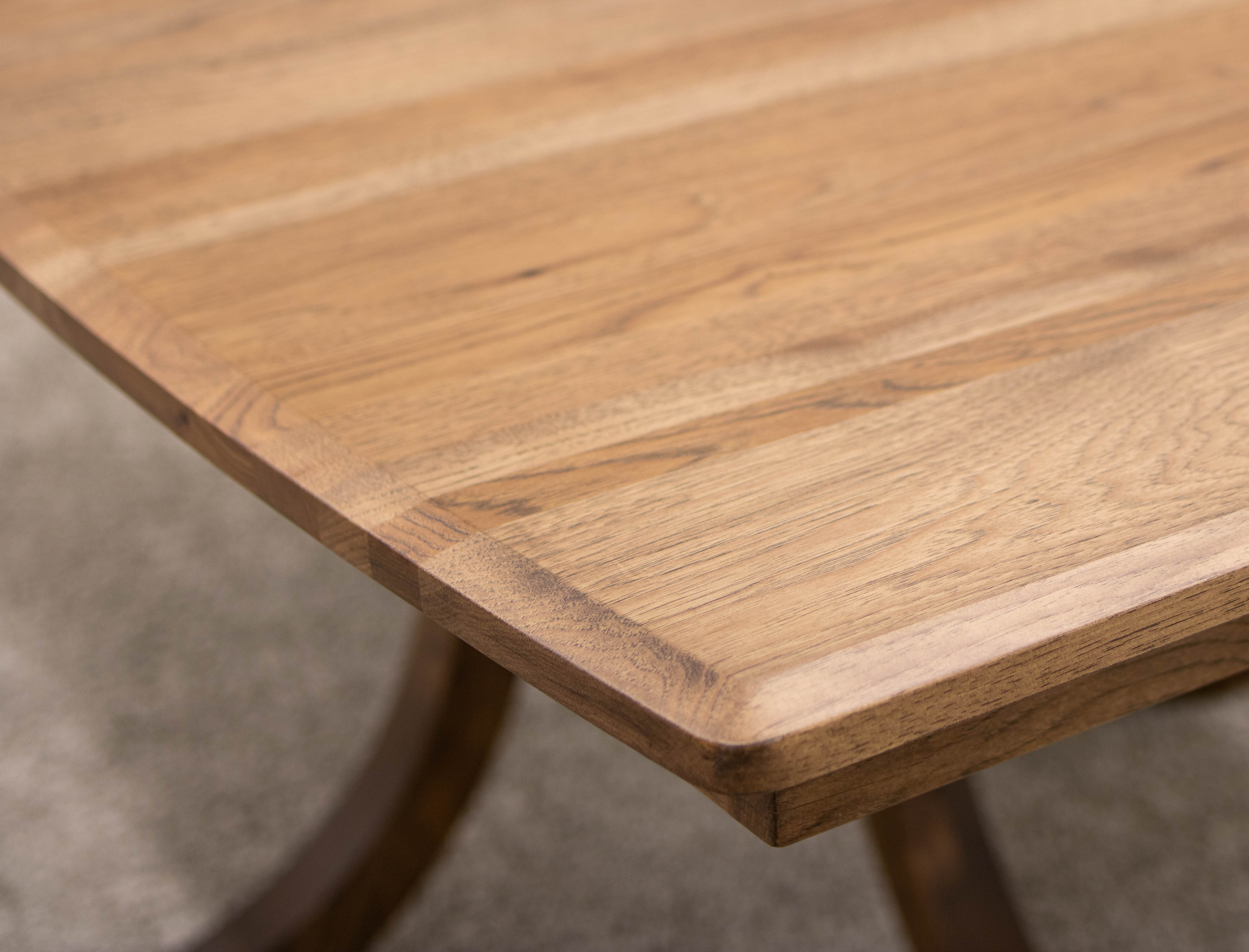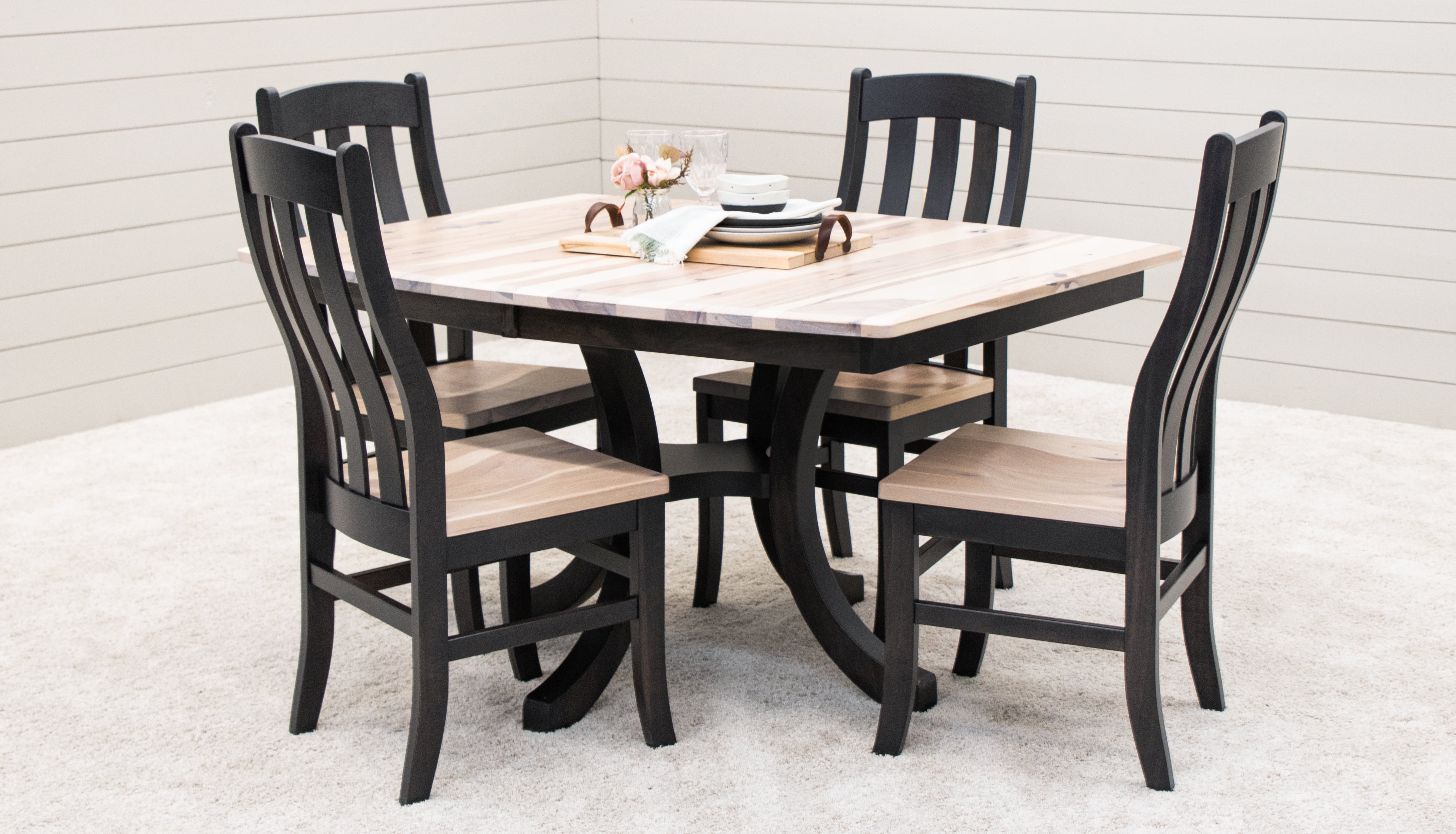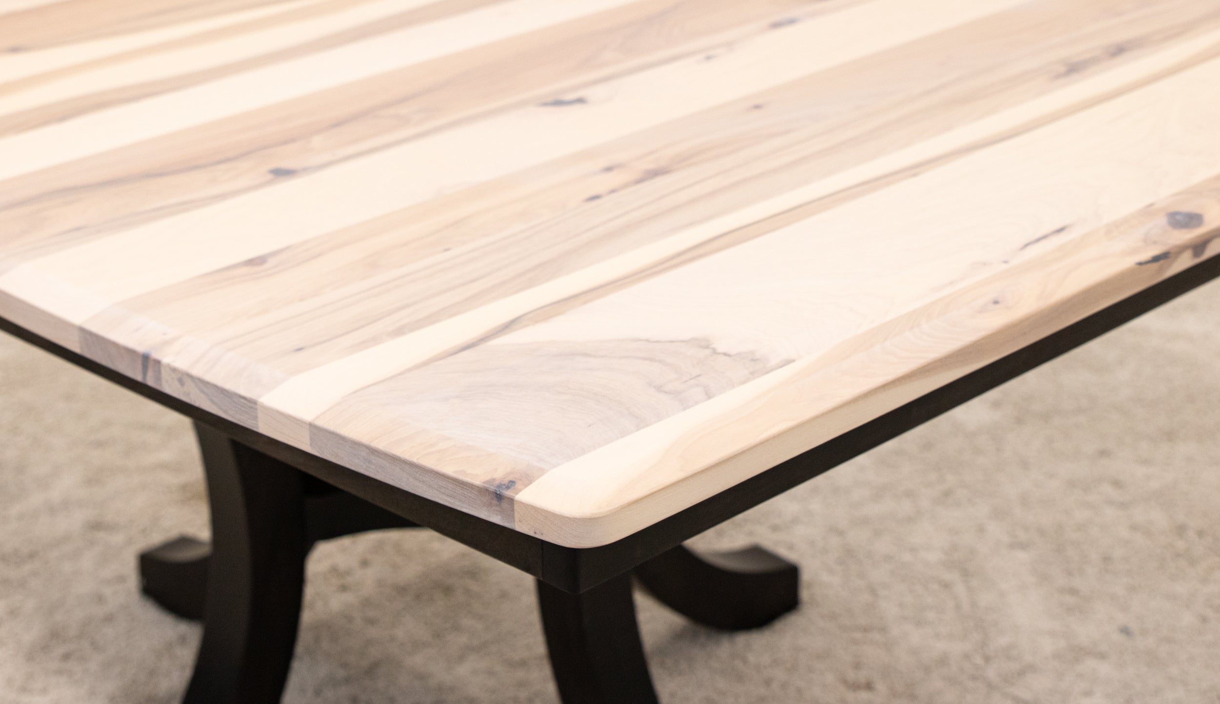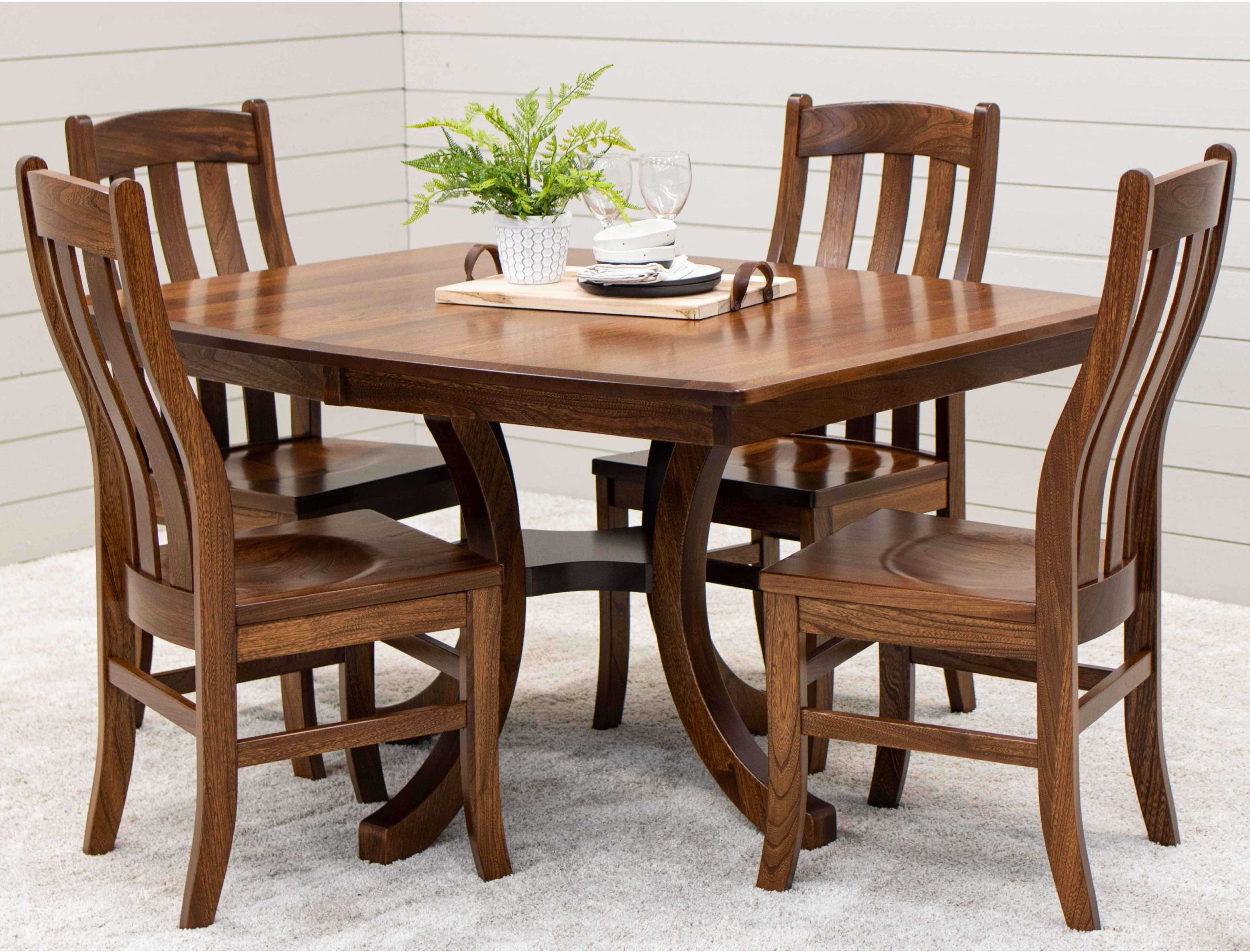The Carlisle Single Pedestal Extending Dining Table features a solid 1" thick top and a bevel edge. The Amish dining table has self-storing leaves and it extends easily with gear slides. The grain runs lengthwise on a table without leaves The grain runs widthwise on a table with leaves. For more info, contact us at Dutch Craft Furniture.