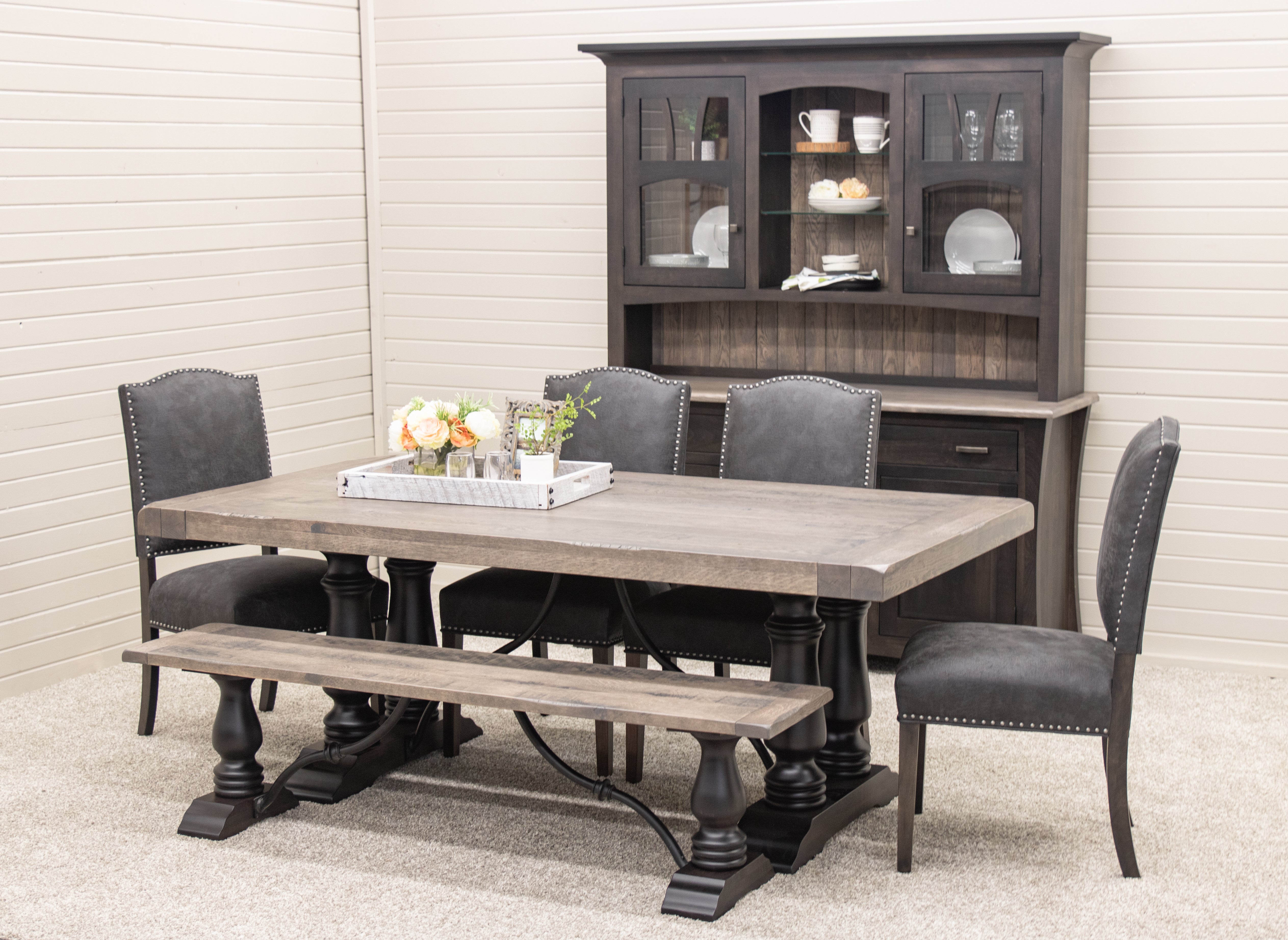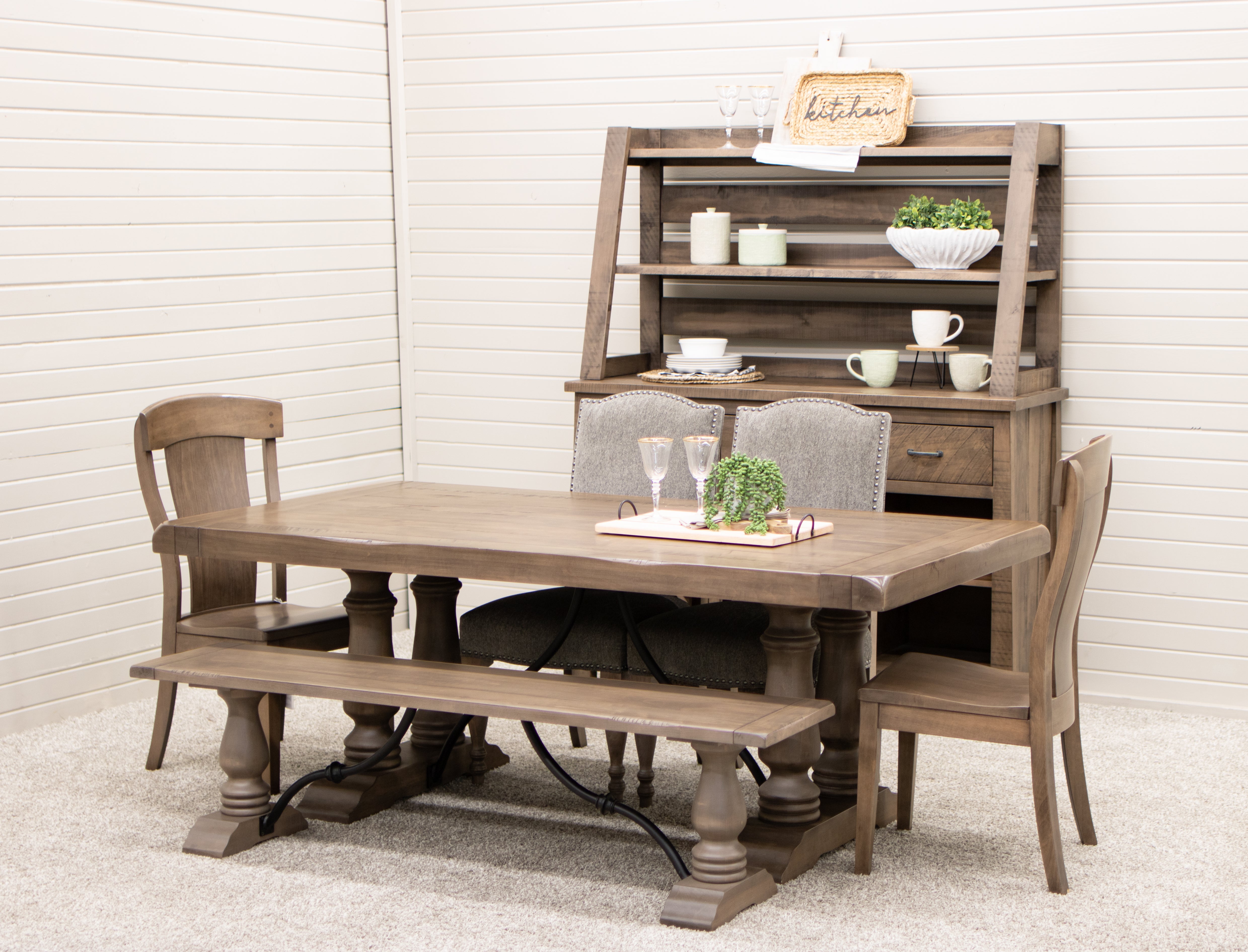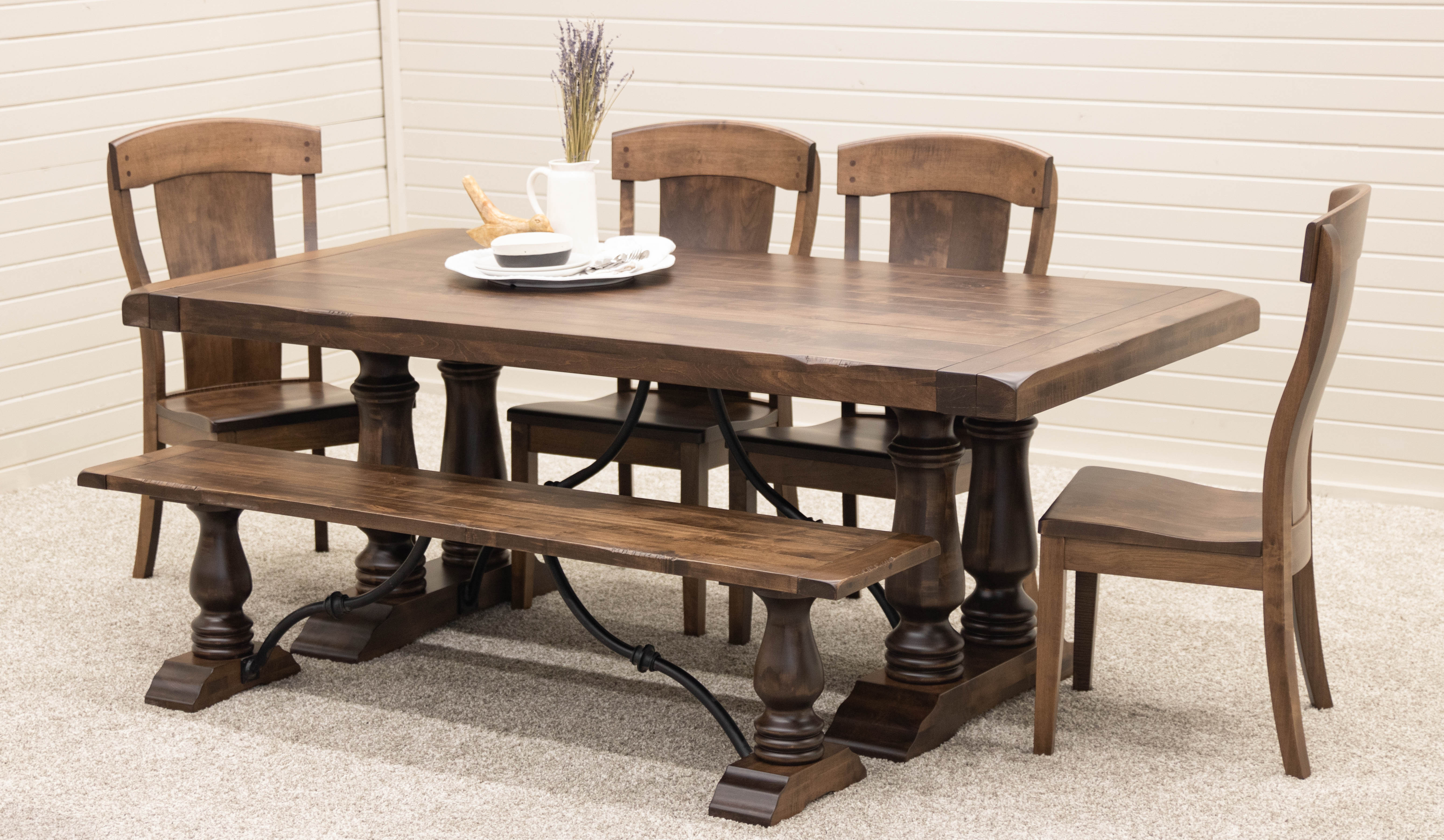 Introducing the Alexandria dining collection from Dutch Craft Furniture, a timeless set crafted for style and functionality. The table base features locally welded iron accents and intricate details in the turned pedestals that exhibit exceptional craftsmanship. The table is finished with a thick Settler’s plank-style top with a light distress. The breadboard ends of the tabletop extend to add 18” leaves, making it easy to host family dinners. The Alexandria dining table set includes a matching bench, which is available in a solid option or with leaves to extend like the table. We also display various complementary chair styles, including the Shreveport and Millbridge upholstered dining chairs. The Alexandria dining collection is beautiful in any hardwood option. Browse our gallery for inspiration and view various stain colors on the set in Maple, Red Oak, and White Oak.