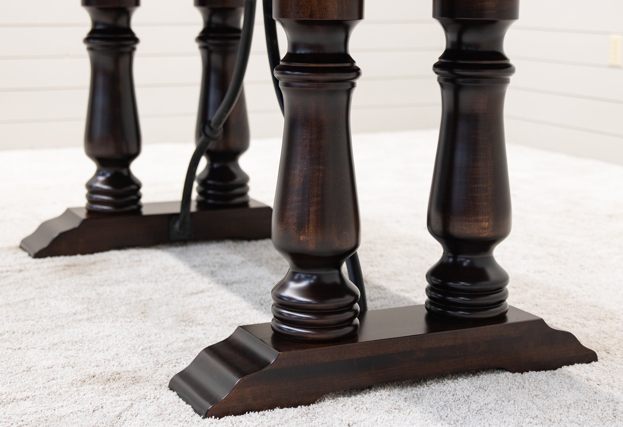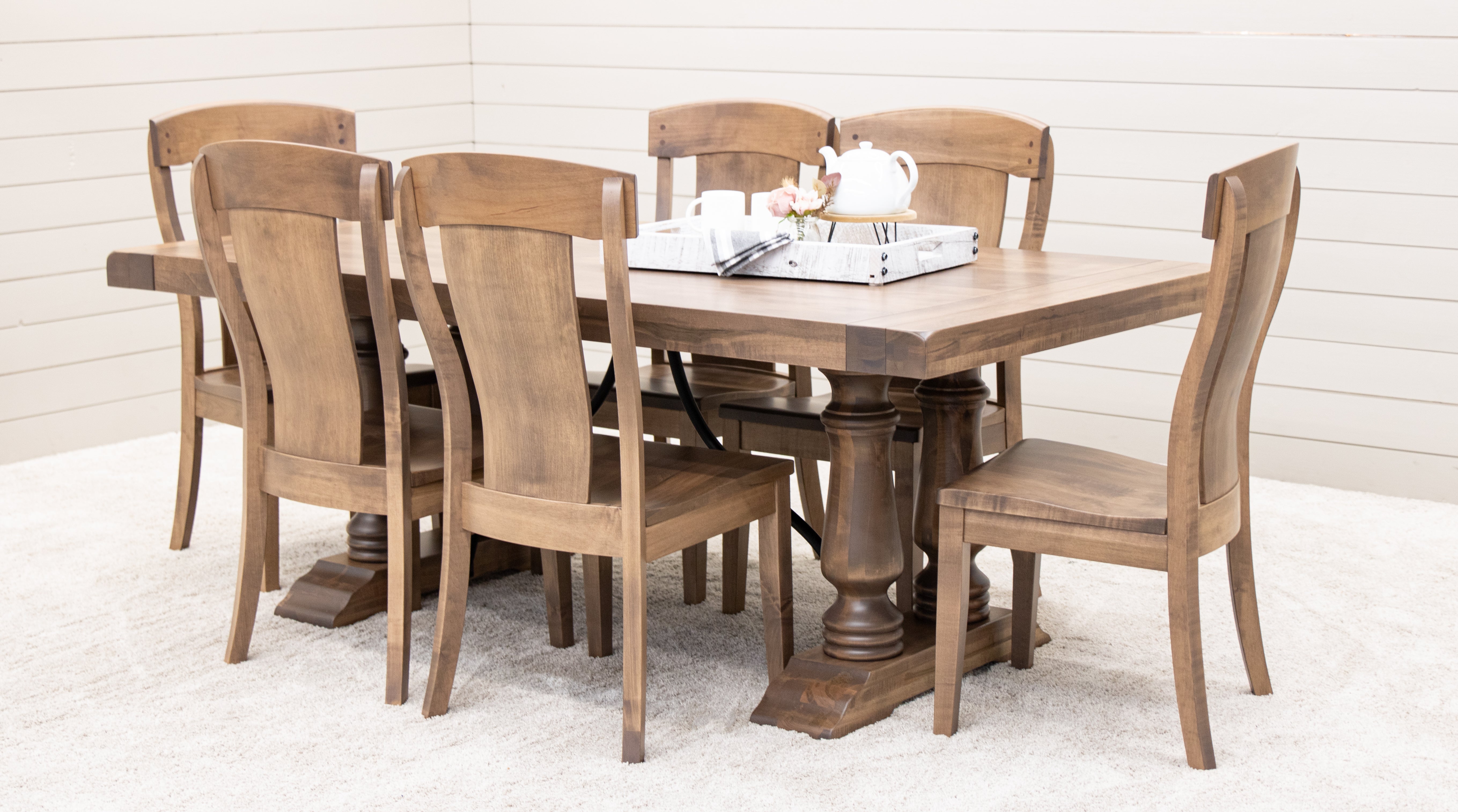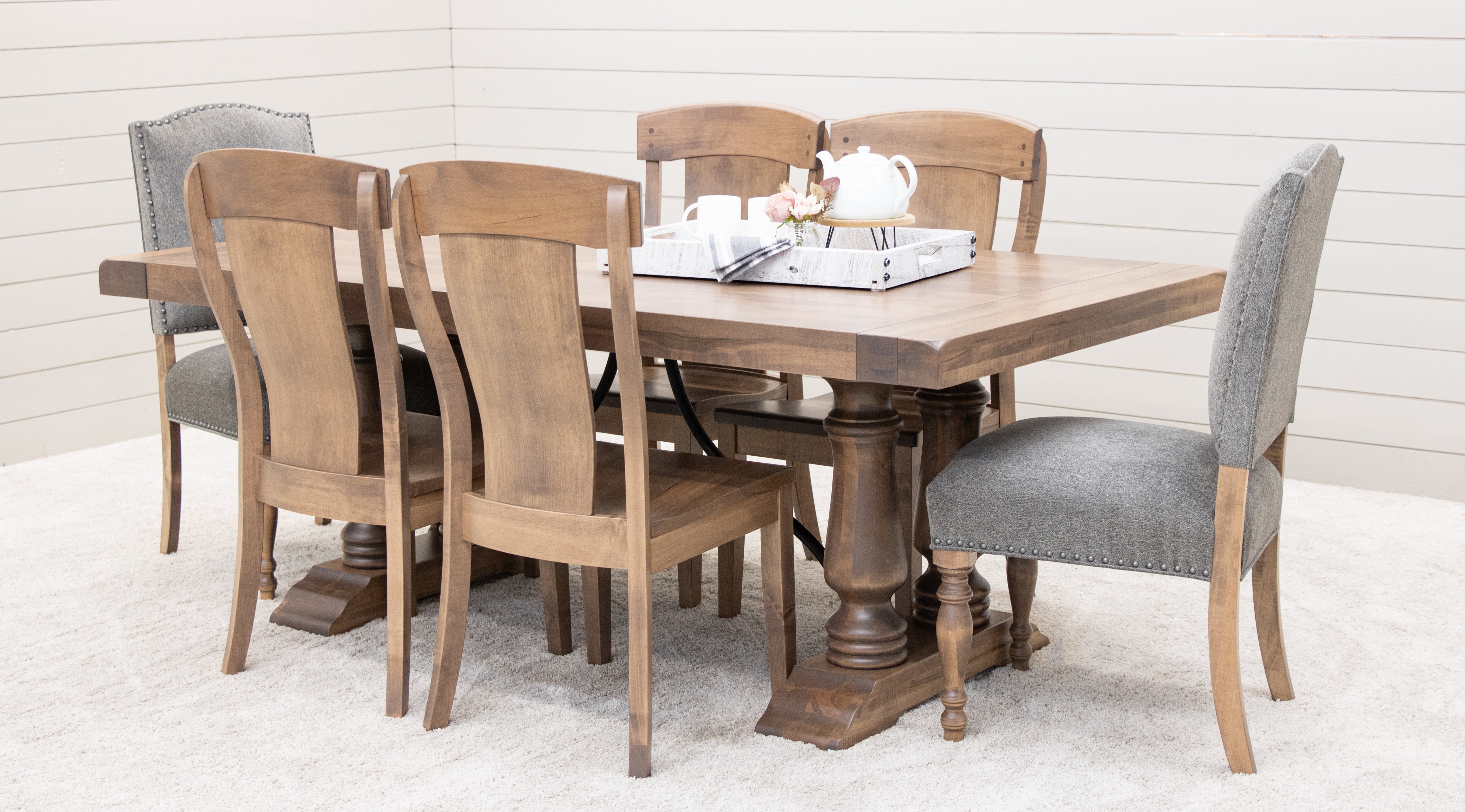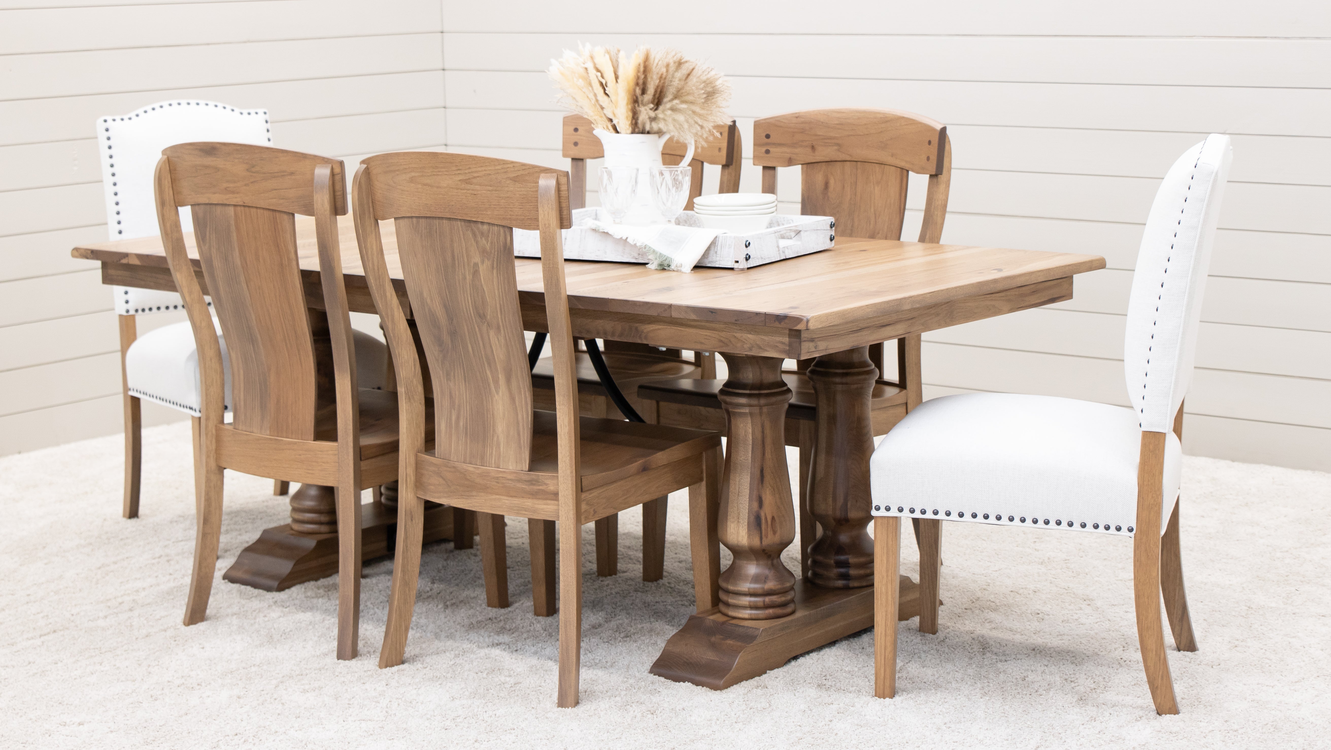 Introducing the Alexandria dining collection from Dutch Craft Furniture, a timeless set crafted for style and functionality. The table base features locally welded iron accents and intricate details in the turned pedestals that exhibit exceptional craftsmanship. The table is finished with a thick Settler’s plank-style top with a light distress. The breadboard ends of the tabletop extend to add 18” leaves, making it easy to host family dinners. The Alexandria dining table set includes a matching bench, which is available in a solid option or with leaves to extend like the table. We also display various complementary chair styles, including the Shreveport and Millbridge upholstered dining chairs. The Alexandria dining collection is beautiful in any hardwood option. Browse our gallery for inspiration and view various stain colors on the set in Maple, Red Oak, and White Oak.
