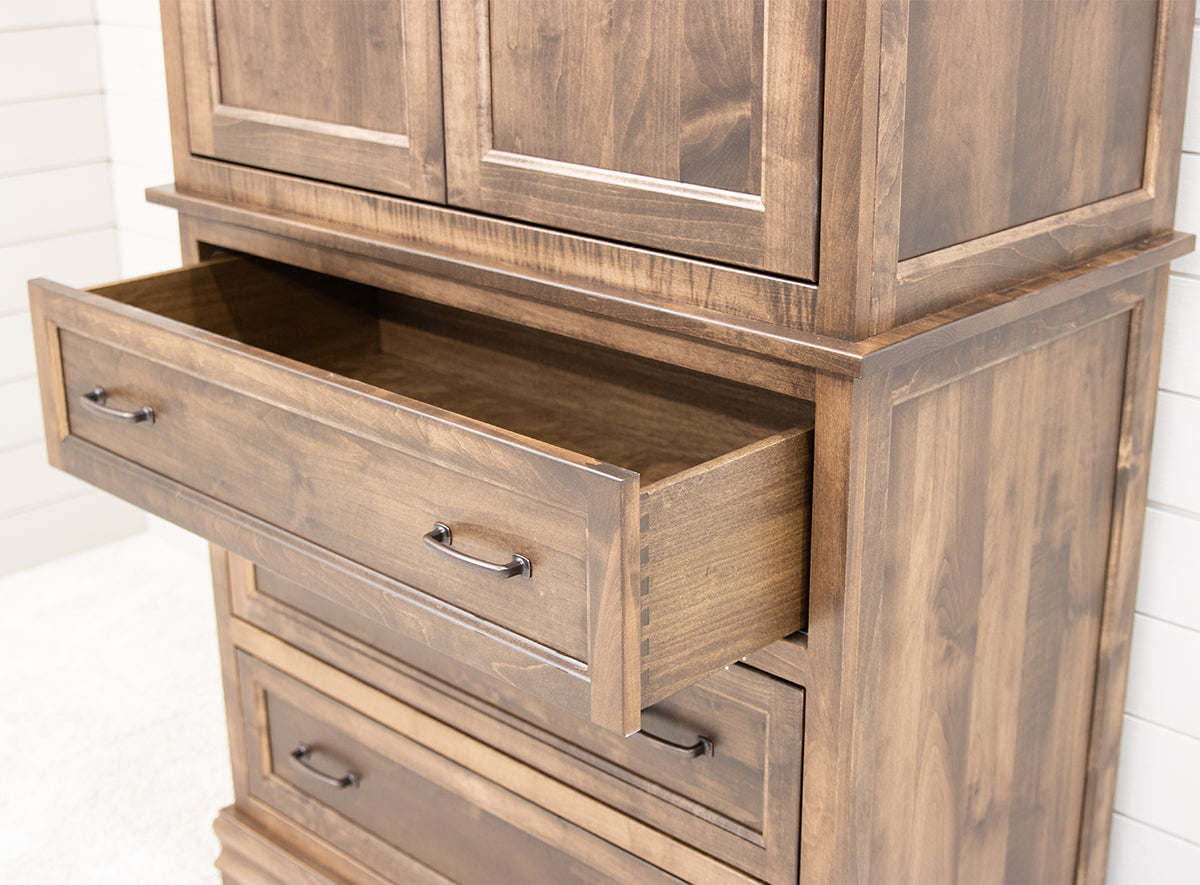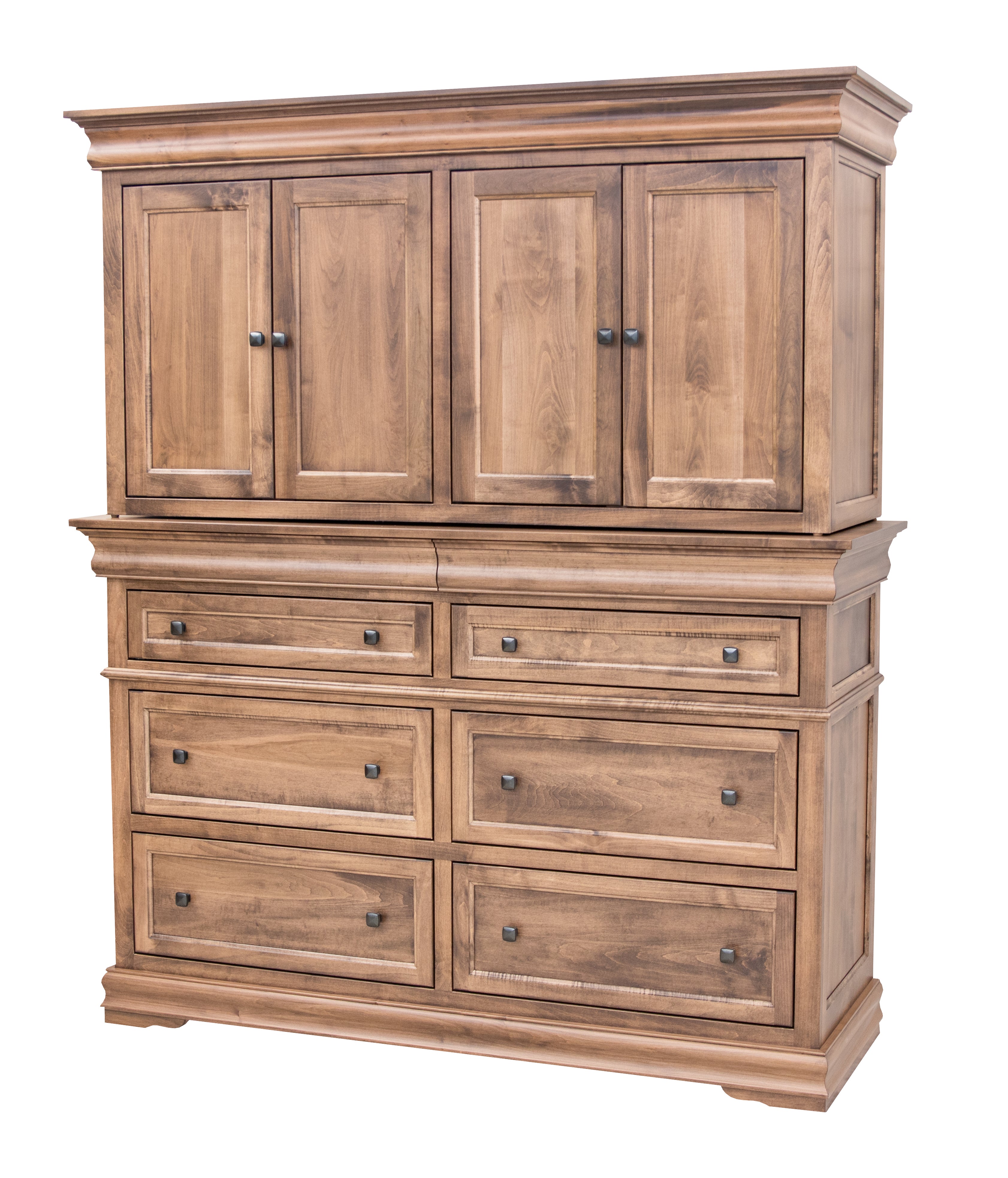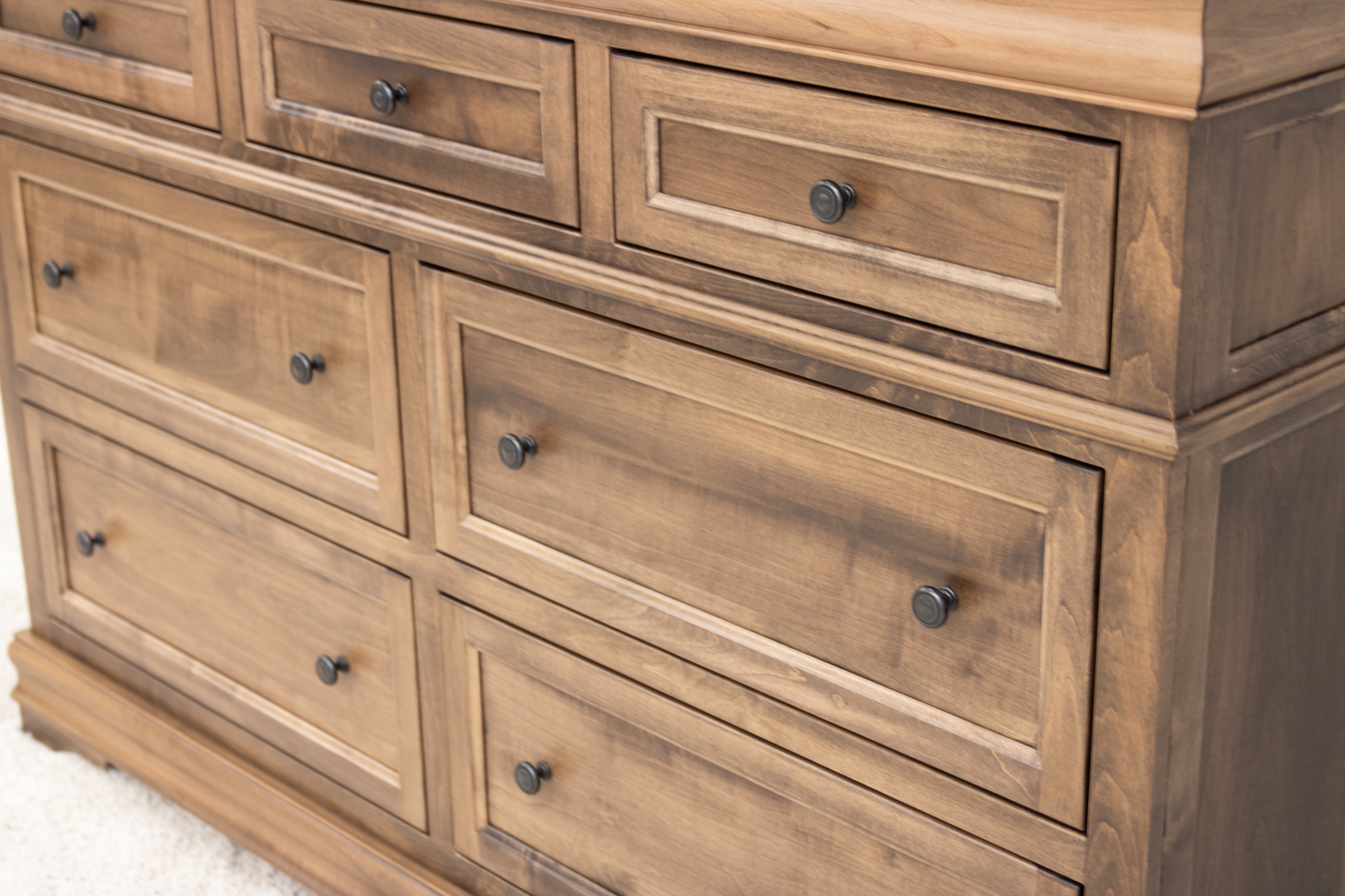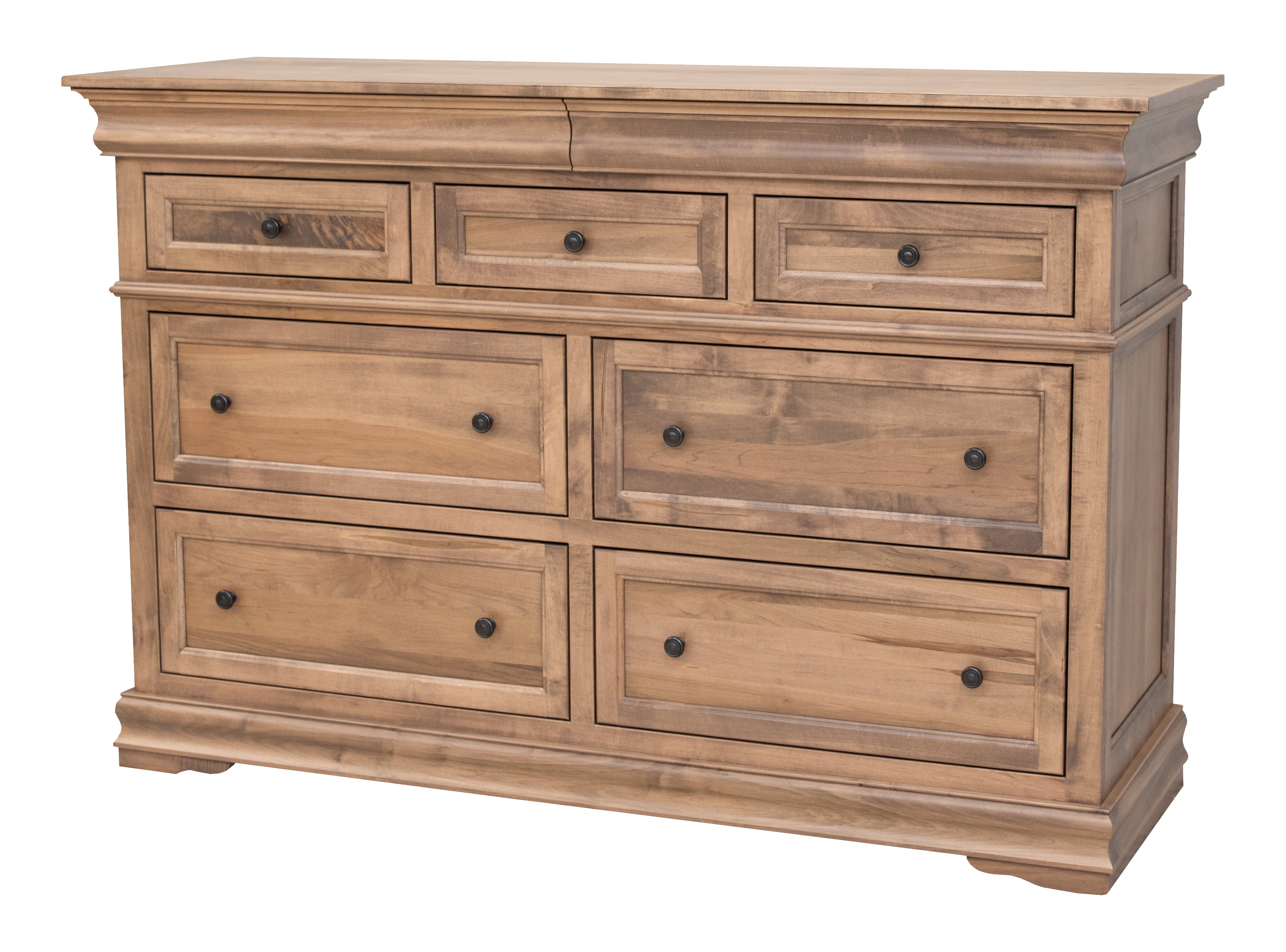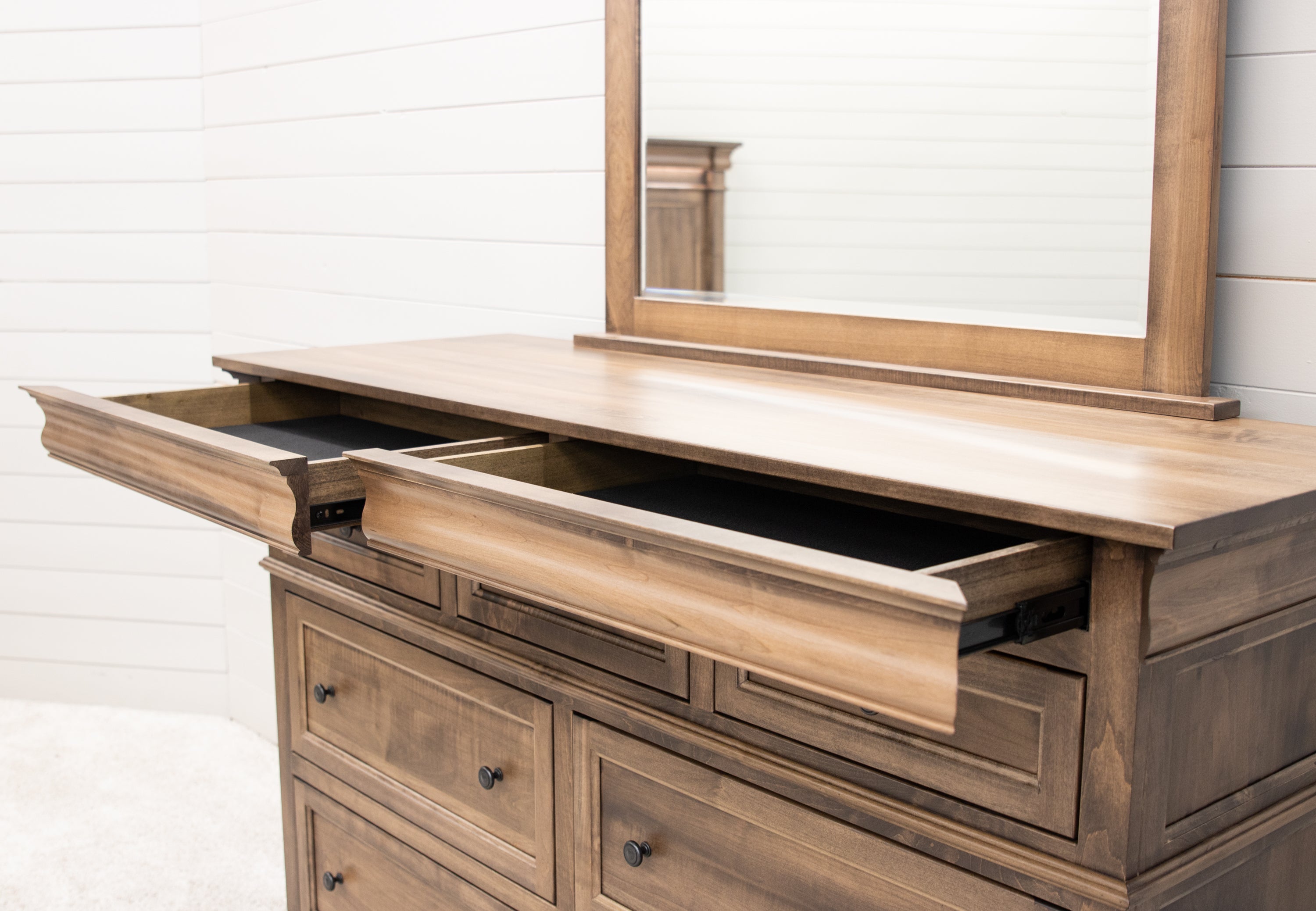 The Belmont Tall Dresser is available in several standard sizes, with or without the mirror. When used without a mirror, we often custom size the dresser to accommodate a TV mounted on the wall above.