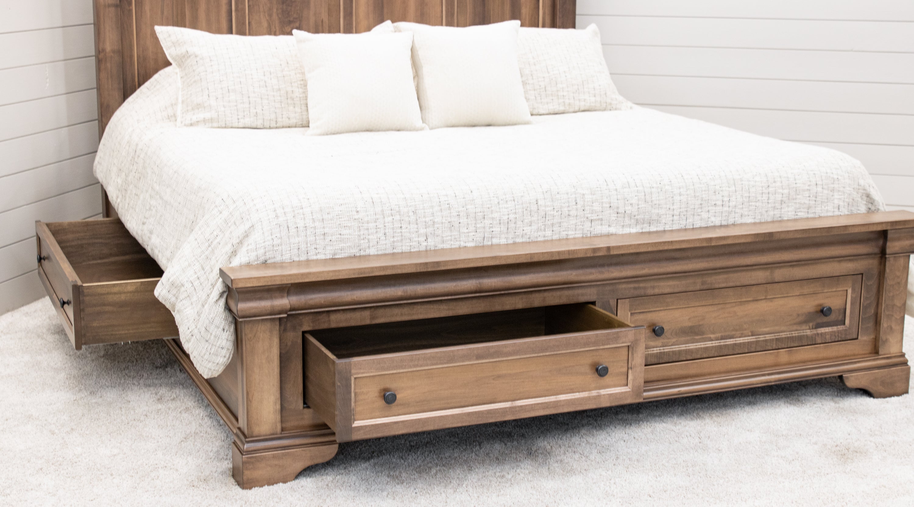 For beds built without the storage drawer platform, there are several footboard options available. We offer a taller footboard that matches the style of the headboard. A custom low footboard without drawers is also available upon request.