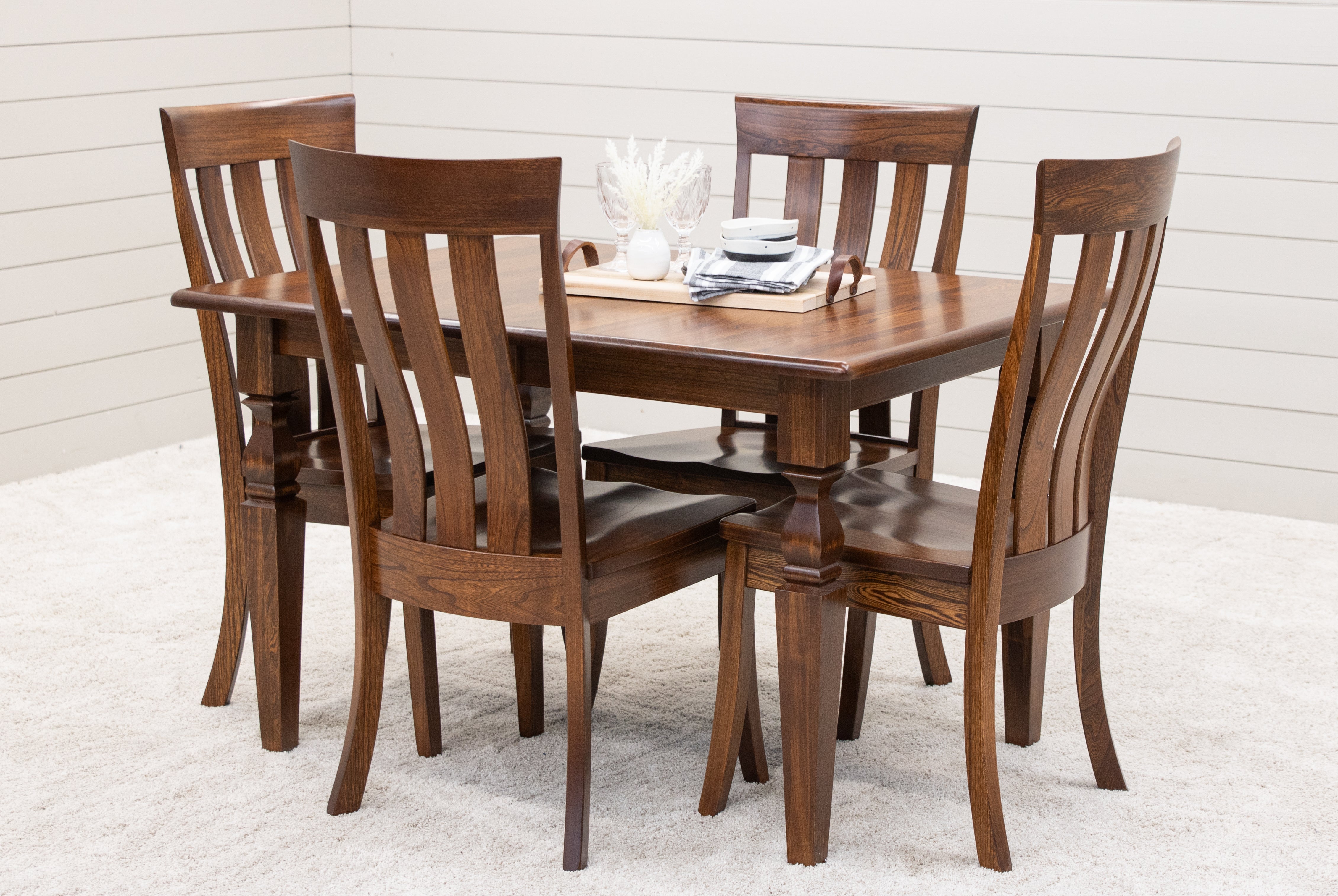 Every dining table is available in your choice of wood type and stain color. Wood options include Red or White Oak, Maple, Cherry, Hickory, Elm, and Walnut wood.