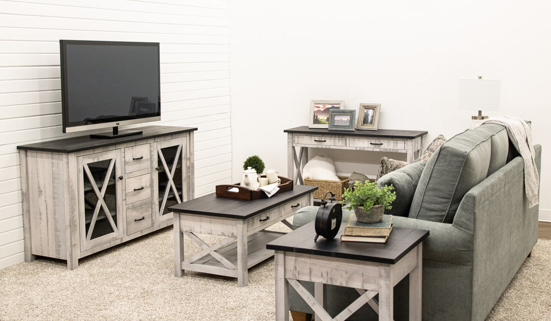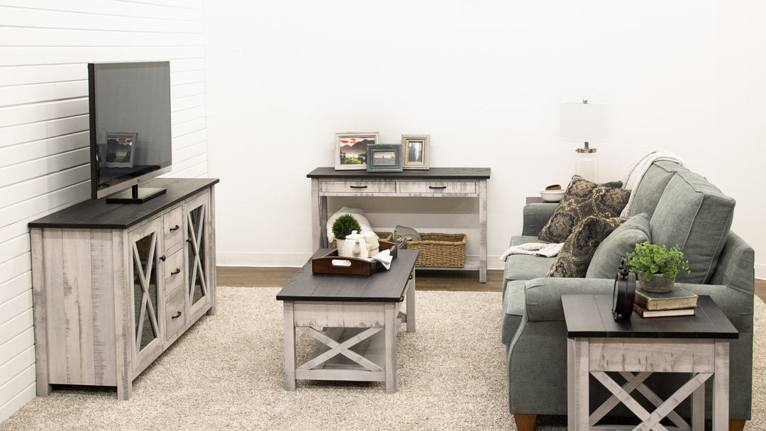 The Cambria collection features lightly distressed tops, X-style bases and square legs.