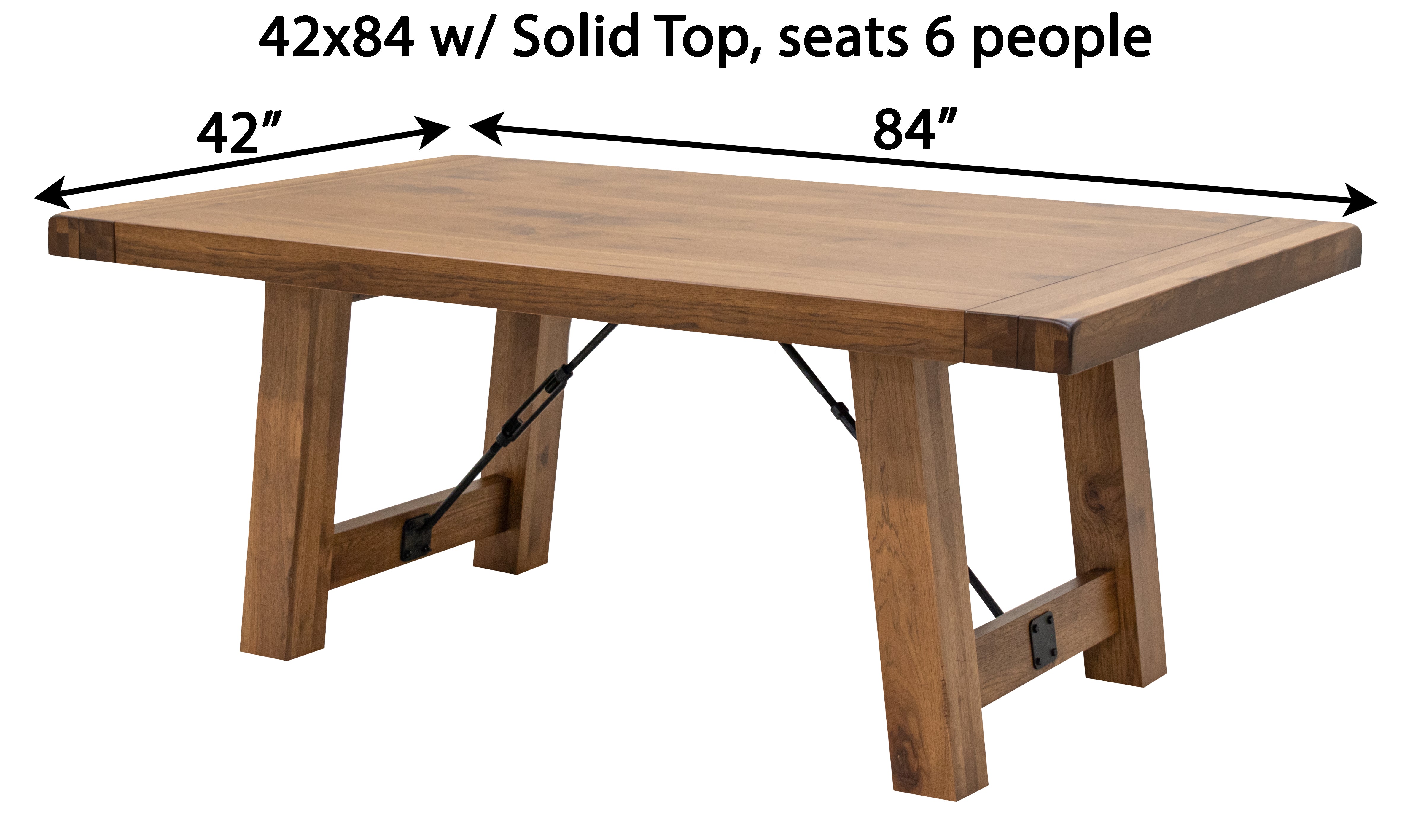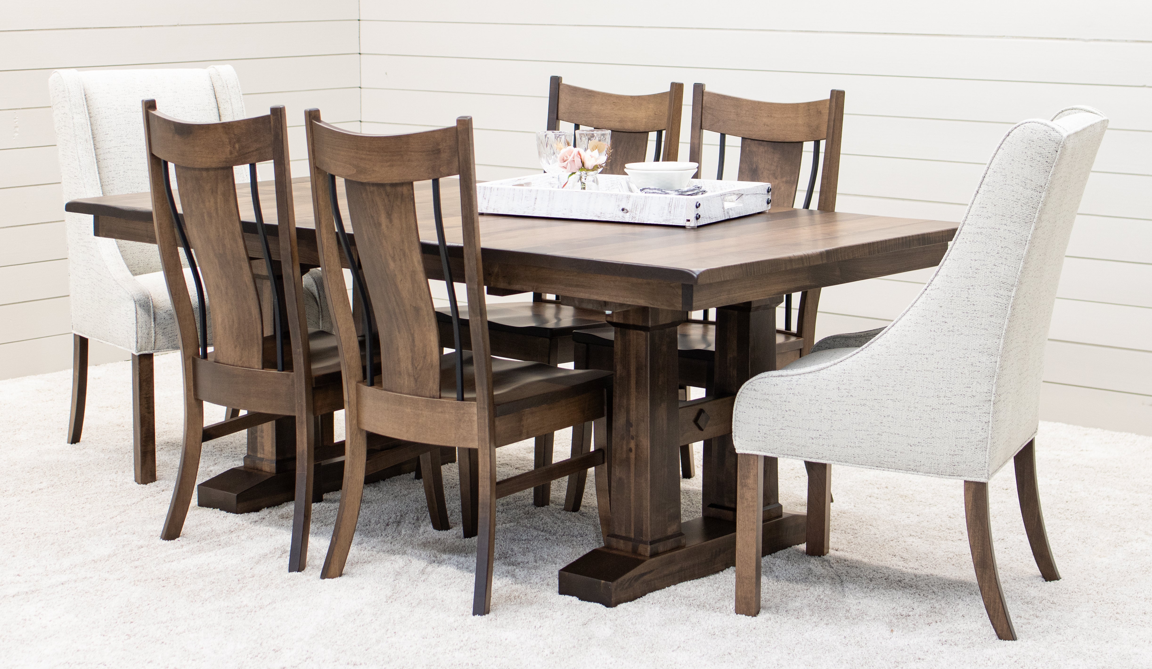 Every dining table is available in your choice of wood type and stain color. Wood options include Red or White Oak, Maple, Cherry, Hickory, Elm, and Walnut wood.