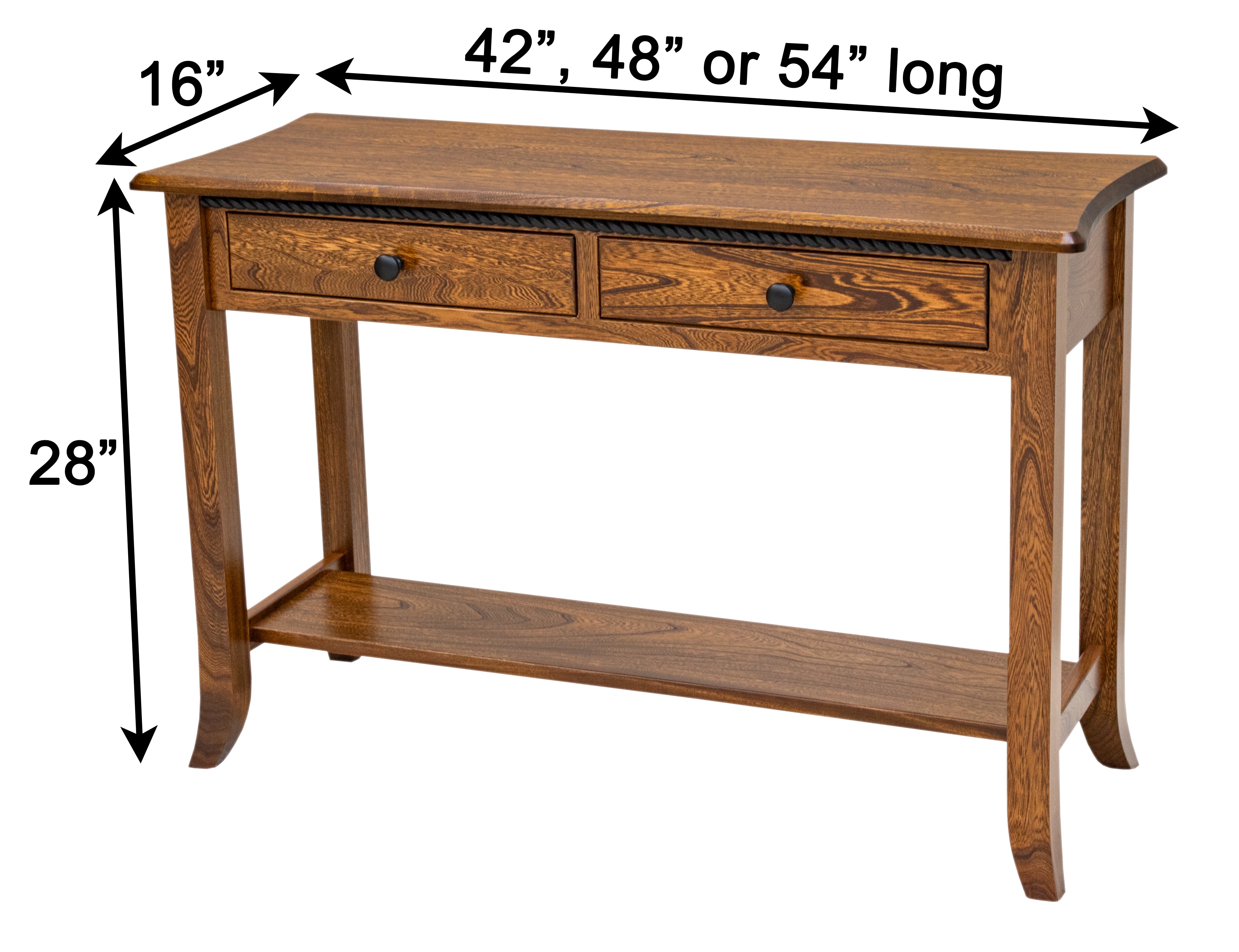 The Plymouth Open Sofa Table features flared legs, a beveled top, and black rope trim under the top. The sofa table is Amish-made and handcrafted in Ohio. Order this piece in your choice of wood and color. For more details, contact a member of our team.