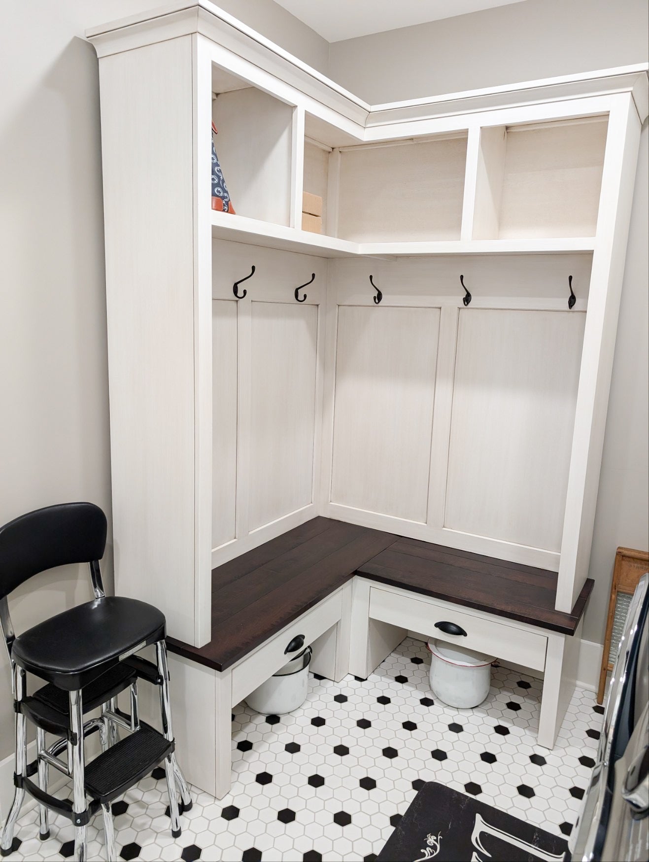Other common layout modifications include adding goblet hangers inside the top cabinet to display stemware. Requesting extra lights along the inside of the glass doors adds extra brightness inside the cabinet. The back of the top cabinet is visible through the glass doors, use it to add personal style. We offer shiplap backs and often feature the back of the hutch in contrasting color.