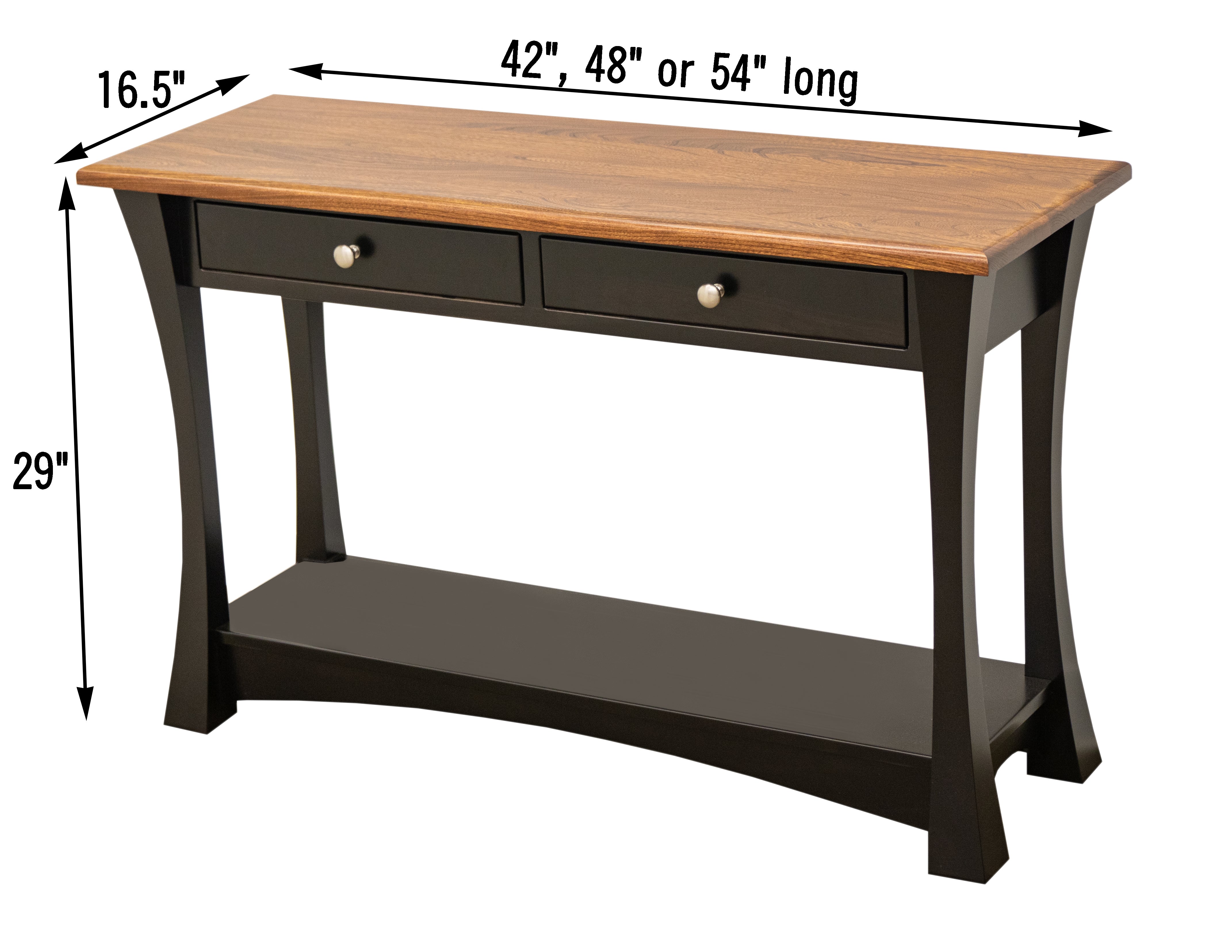The Brooklyn Sofa Table features curved legs and rounded edges along the top. The solid wood piece is built by Amish craftsman in Ohio. The open sofa table can be ordered in your choice of wood and color. For more information, contact a member of our team.