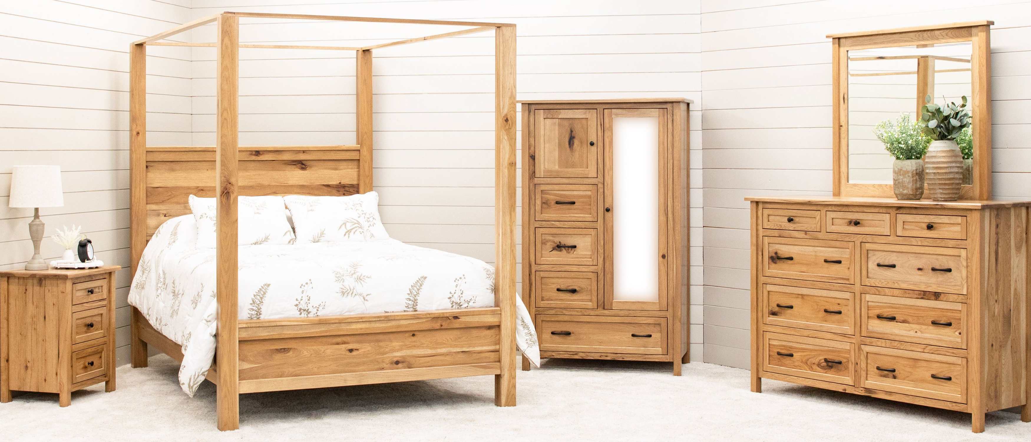 All Amish bedroom furniture is available in Hickory wood. Custom made bedroom furniture allows you to choose the wood you like. Find a bed style that matches your vision and order it in solid Hickory wood. Choose any dresser, chest of drawers, nightstand, armoire or chiffonier to match, all in solid Hickory wood.