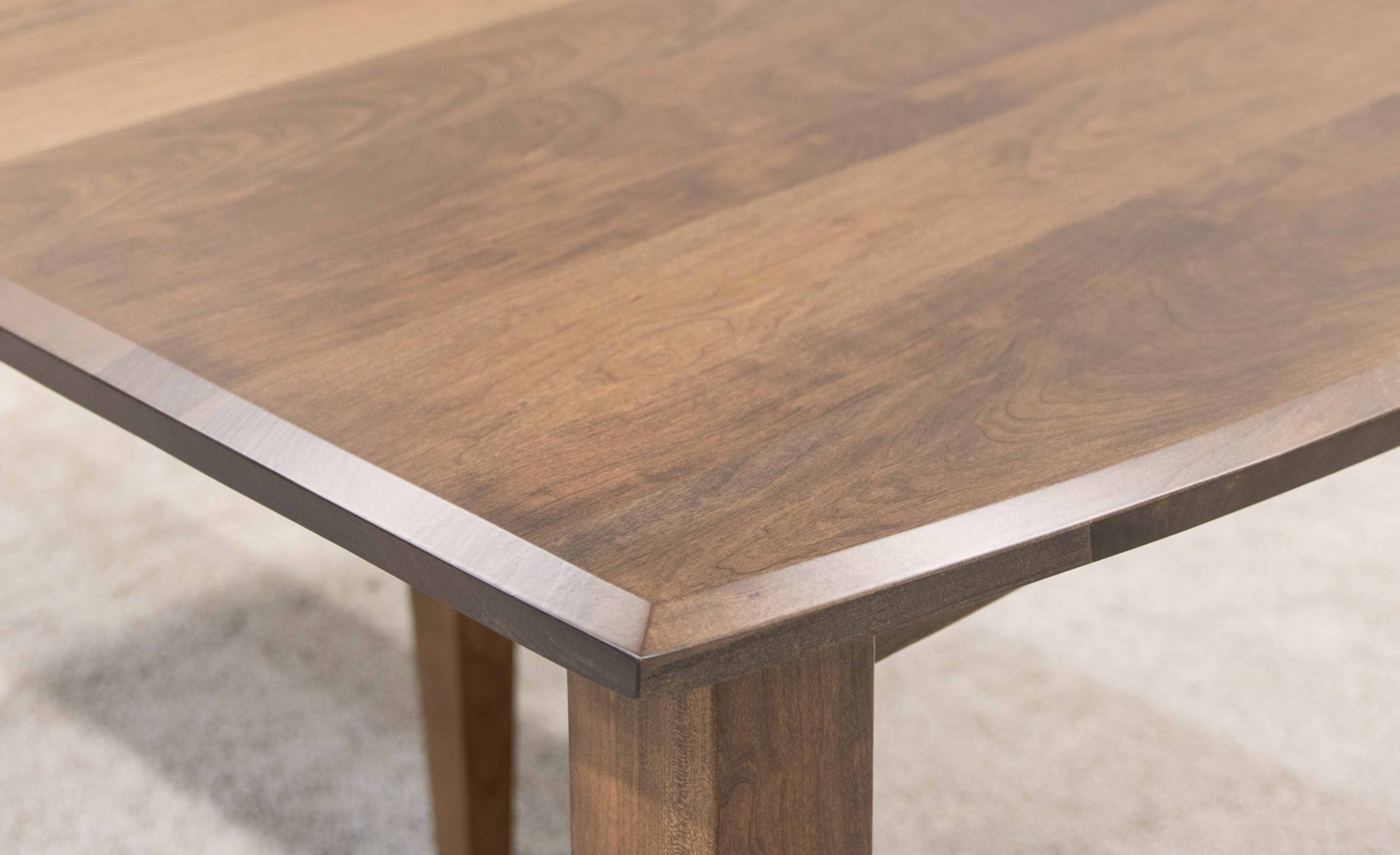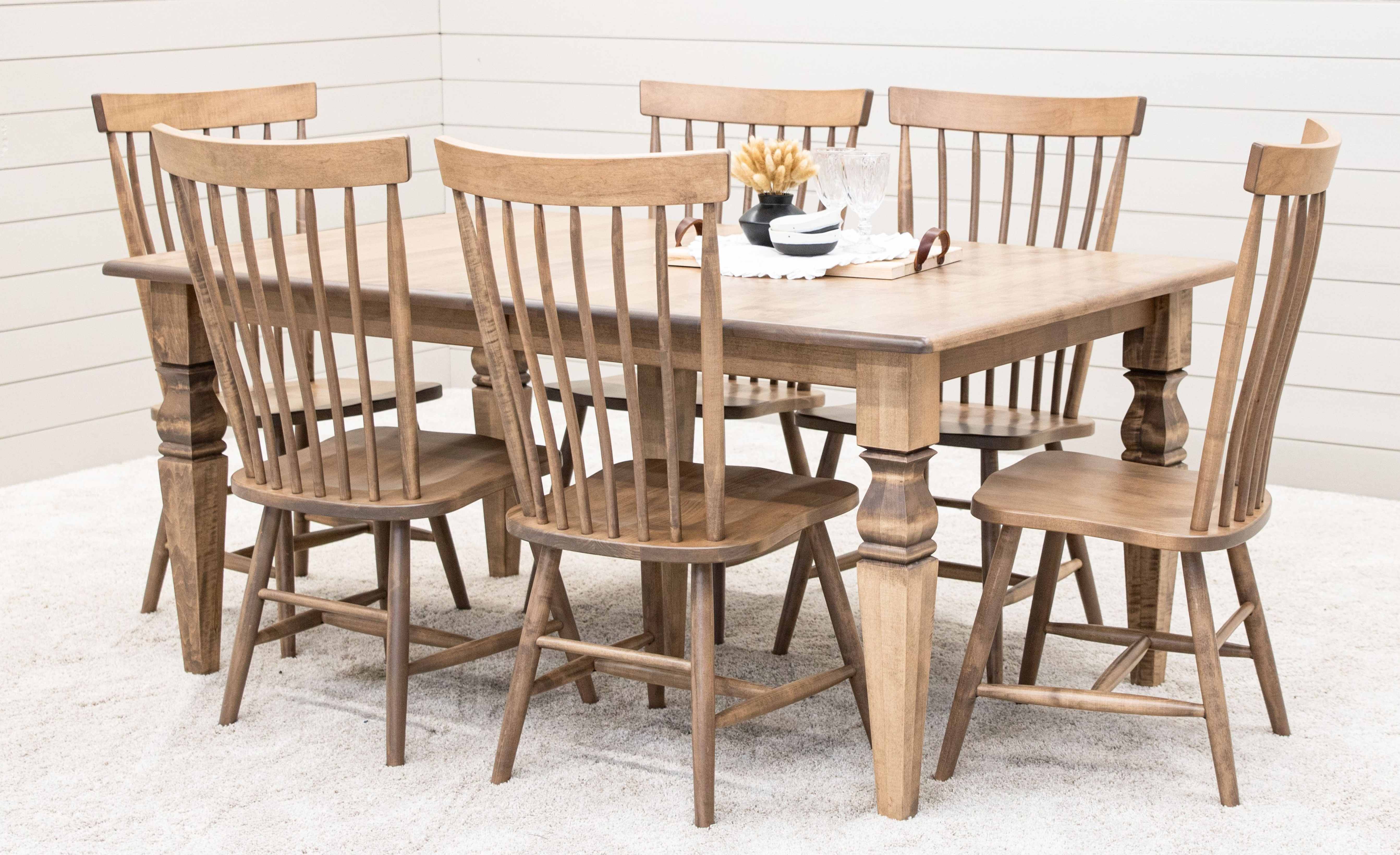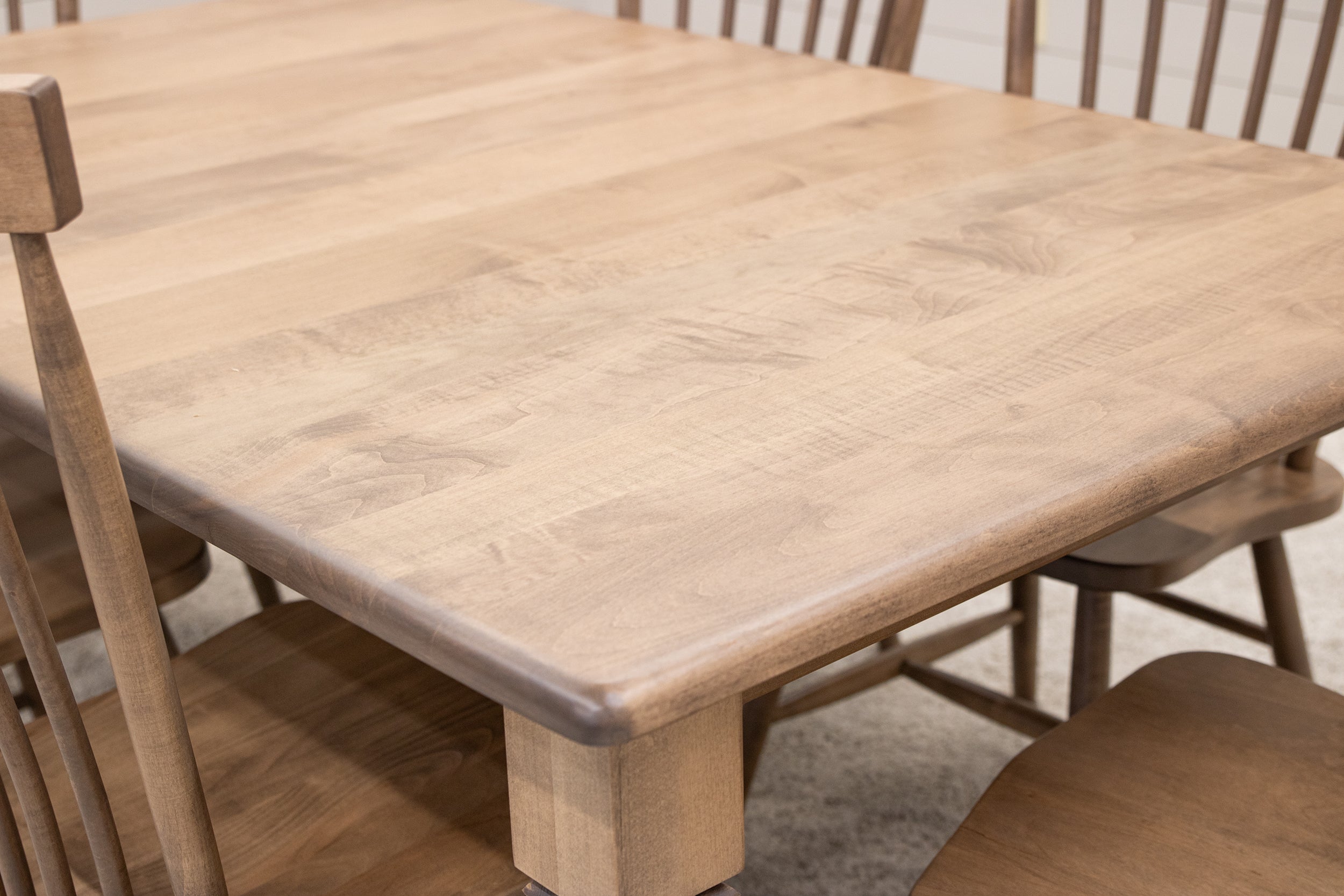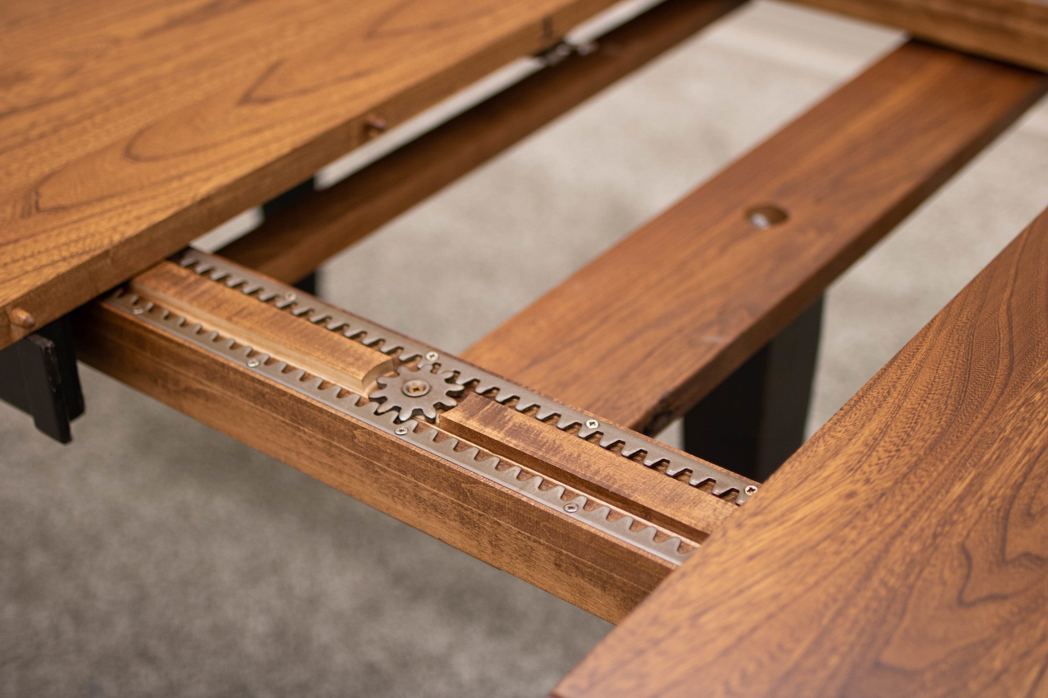 The Classic Turned Shaker Cam Extending Dining Table features a 1" thick top made with solid wood. The Amish dining table has self-storing leaves and it extends easily with gear slides. The grain runs lengthwise on a table without leaves. The grain runs widthwise on a table with leaves. For more info, contact us at Dutch Craft Furniture.
