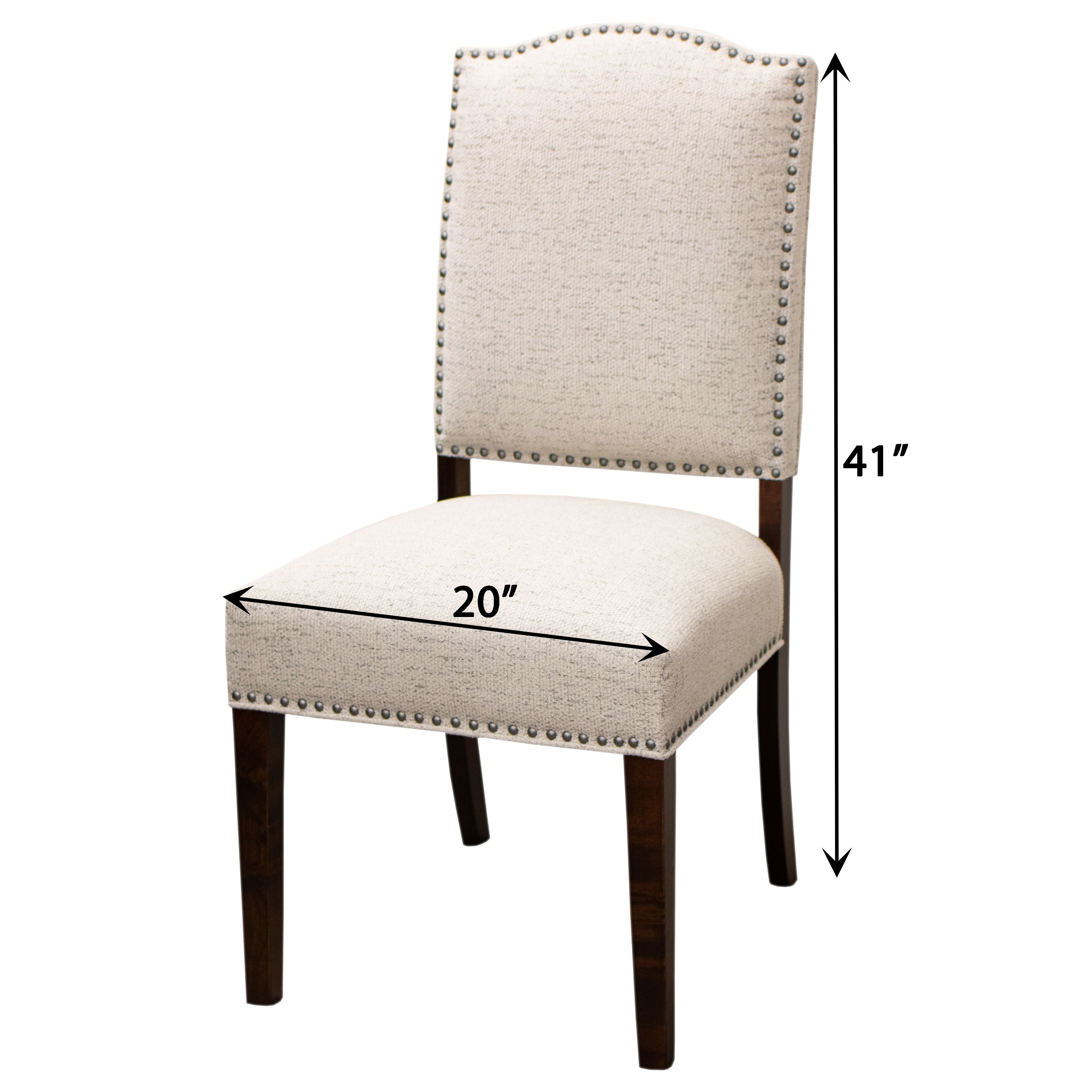 Dutch Craft Furniture offers the Emerson Upholstered Side Dining Chair with a curved top board and complementing nail head trim, adding formality to your dining room. The classic shaker legs make it easy to pair the dining chair with many table styles. This Amish made chair can be ordered in your choice of fabric or faux leather and wood base. When purchasing this chair as part of a dining set, the legs will automatically match your table.