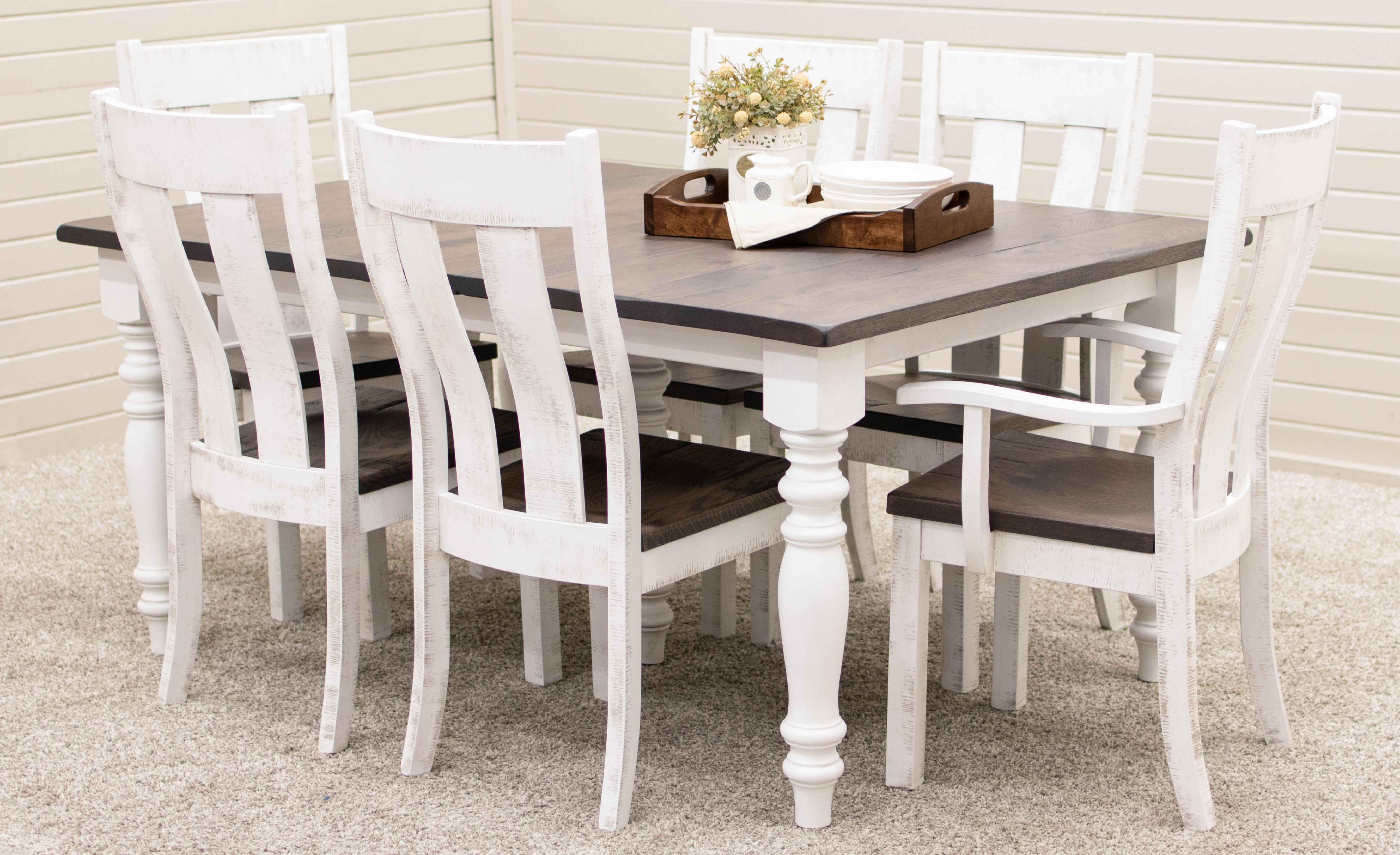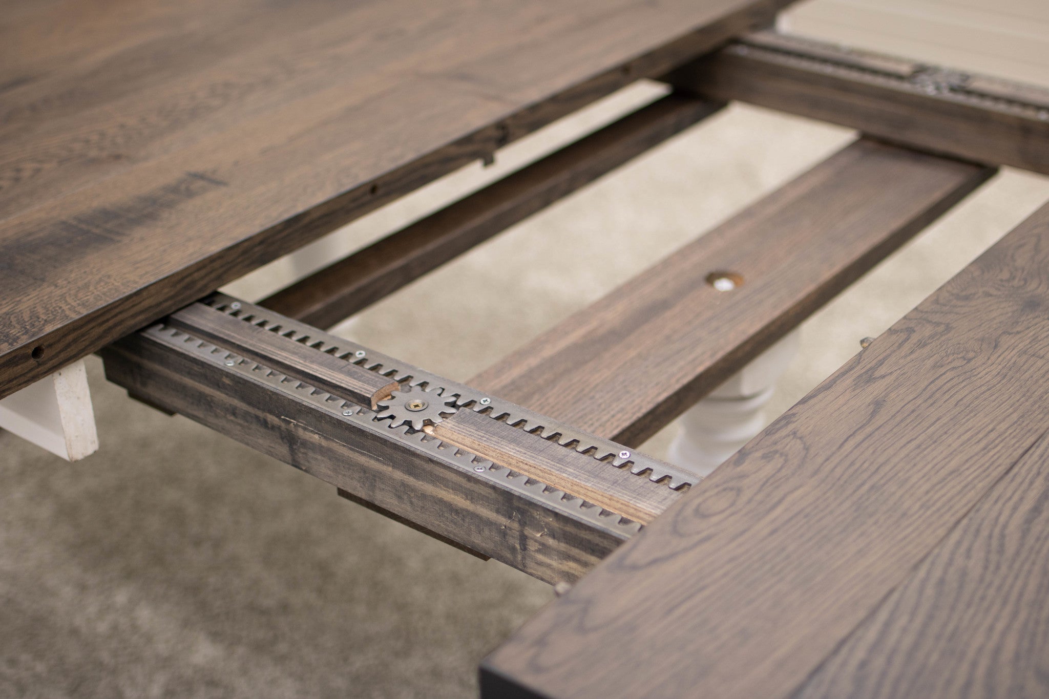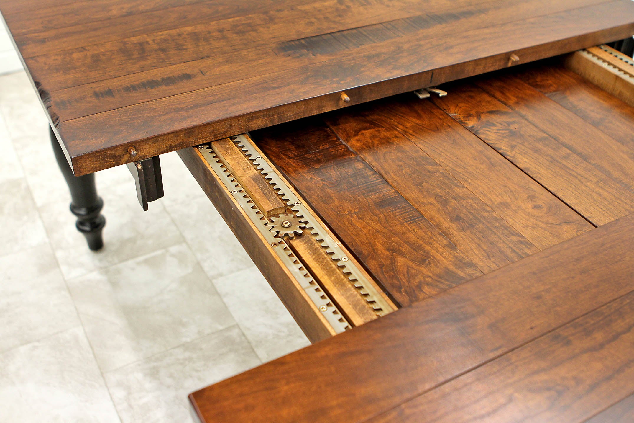 The Settler's Farm Leg Extending Dining Table features a 1" thick, Sawmill top made with solid wood. The Amish dining table has self-storing leaves and it extends easily with gear slides. The planks run lengthwise on a table without leaves. The planks run widthwise on a table with leaves. For more info, contact us at Dutch Craft Furniture.