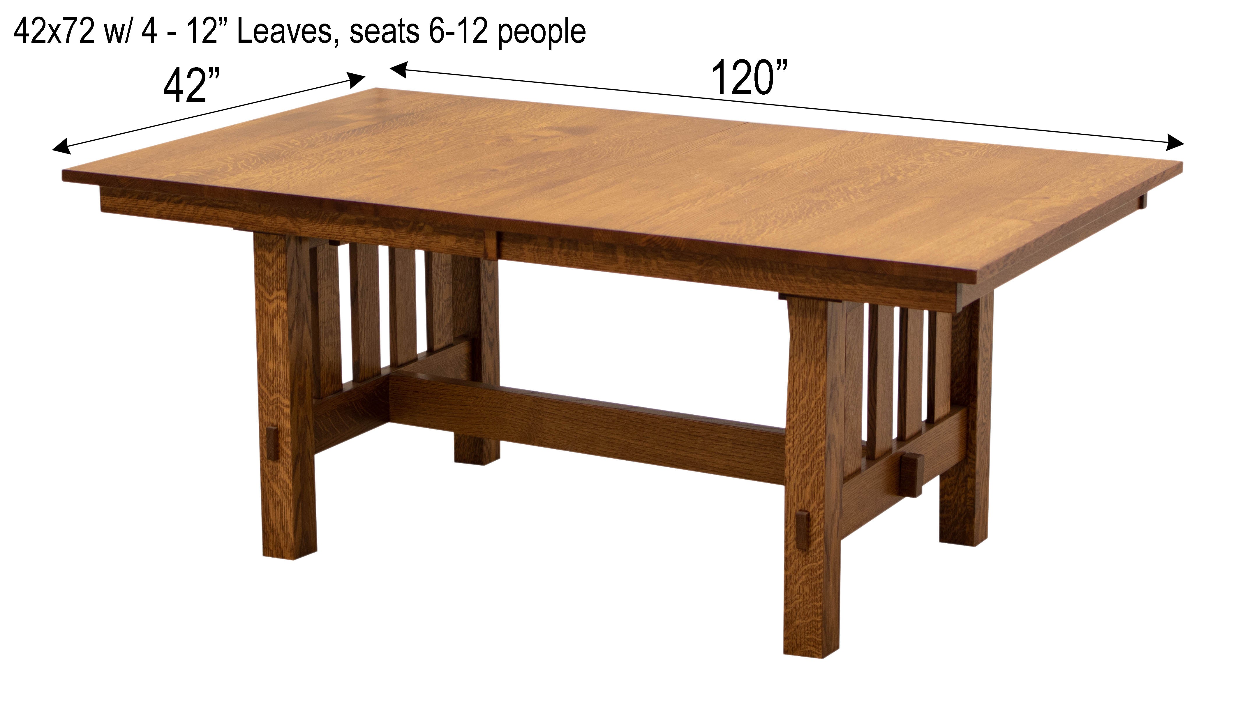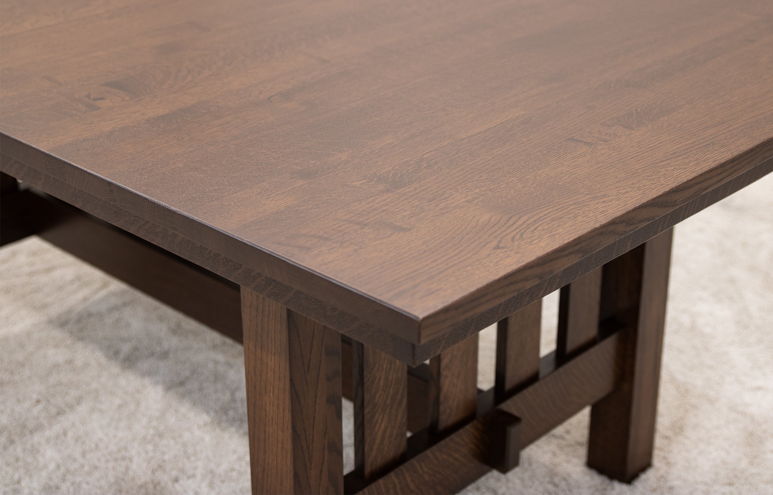 A classic Mission trestle extendable dining table in solid quarter sawn White Oak wood by Amish furniture makers
