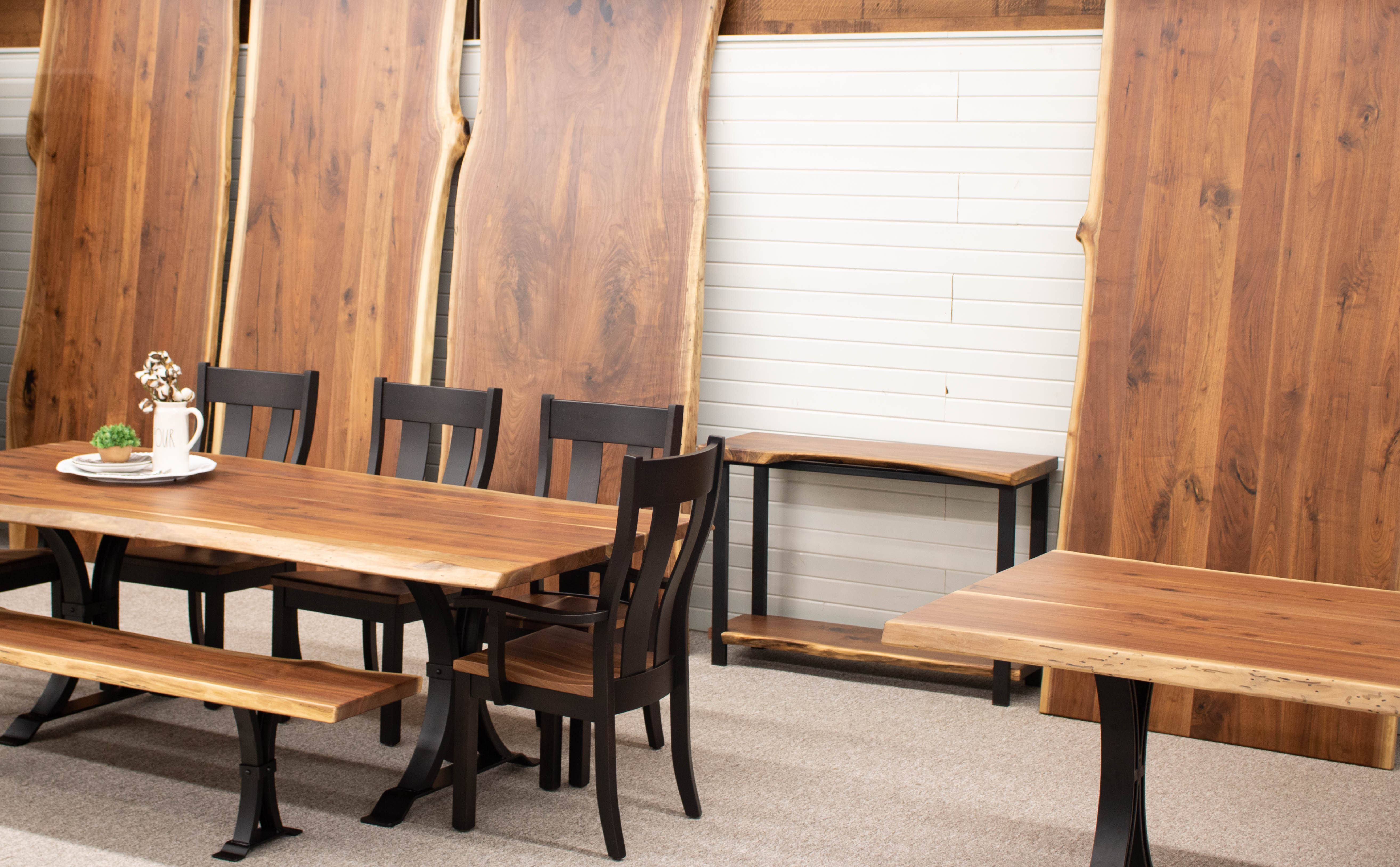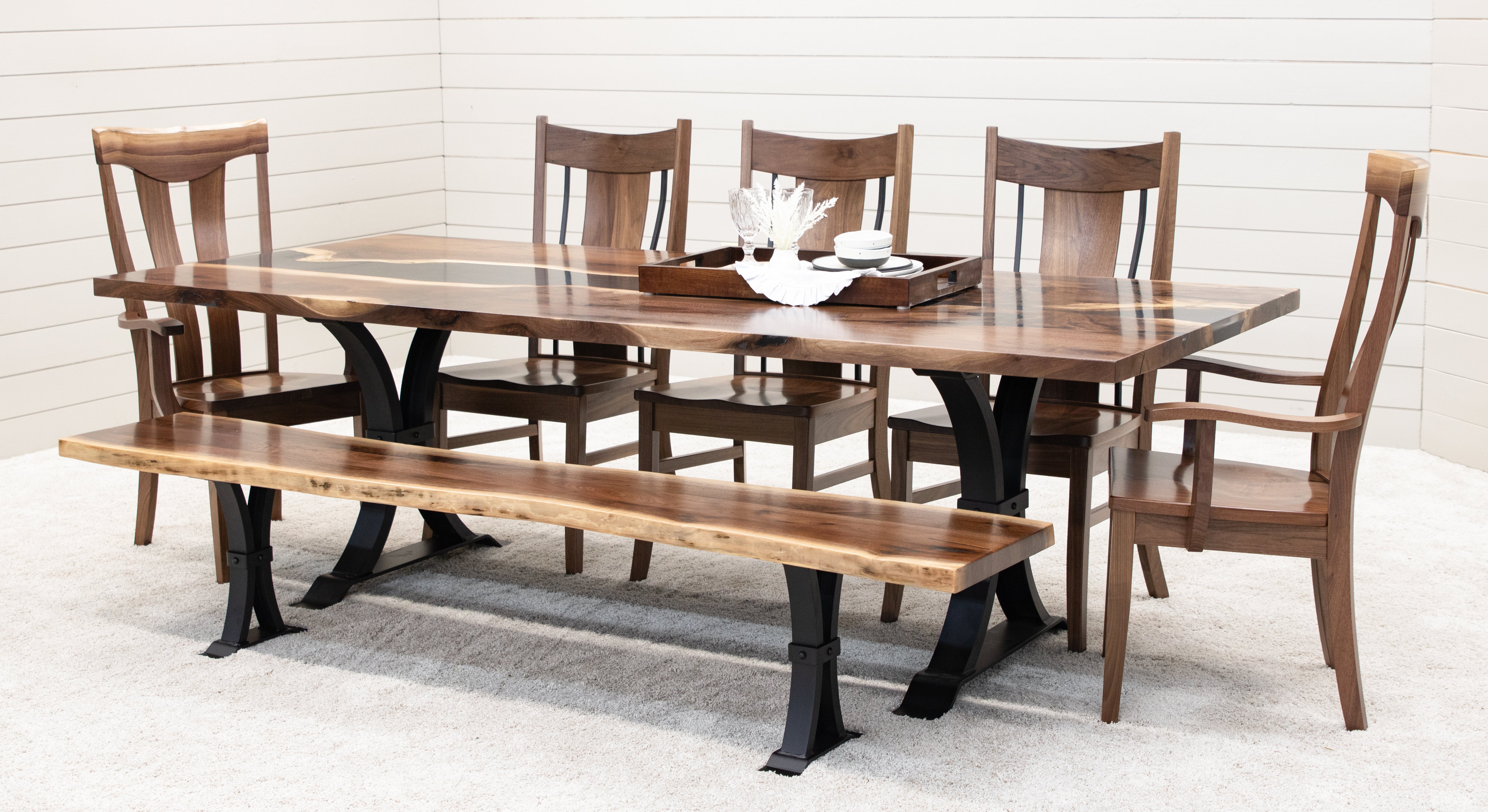 Black Walnut wood live edge slabs create a stunning focal point in your dining room or office. Visit our Berlin, Ohio showroom to choose your live edge slab dining table in person. Our ever-changing display features solid one-piece tops, slabs that we glue together, and epoxy river slab tables. From Cleveland OH, Columbus OH, Pittsburgh PA and Wheeling WV, we are within a 2-hour drive.