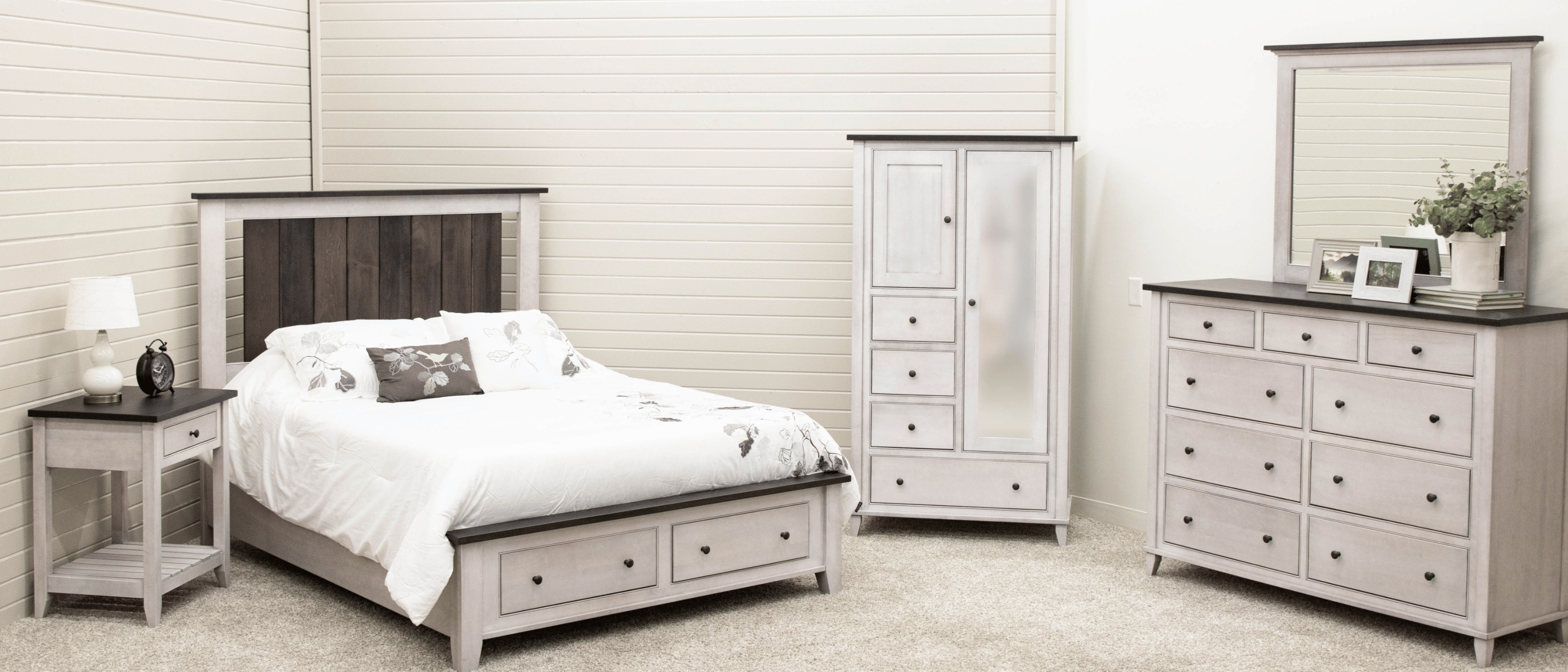 Maple is our top recommendation for gray bedroom furniture. The light wood color and smooth texture of the grain create a beautiful gray stained finish. Popular light gray stains for bedroom sets include Sandy Point, shown on the Savannah style, our classic Farmhouse bedroom set.