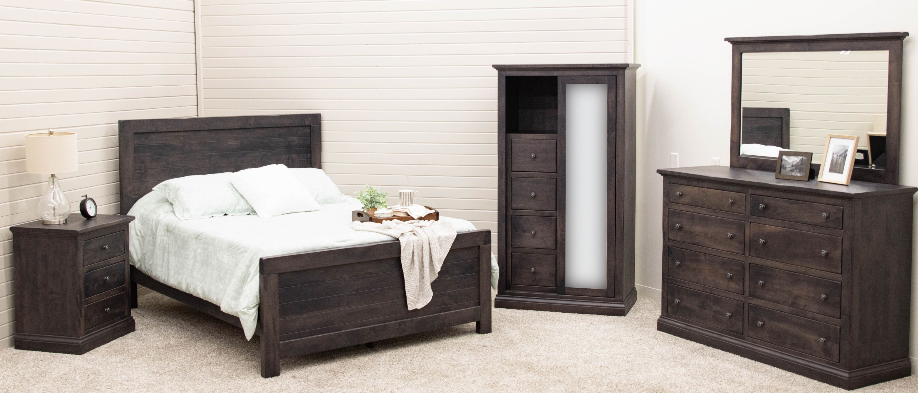 Dark gray bedroom sets transform your bedroom with sleek, modern finishes. Gunsmoke and Dark Knight stain show little to no wood grain on Maple wood. Choose a modern bedroom style like the Weston collection to add a contemporary edge to traditional Amish bedroom furniture.
