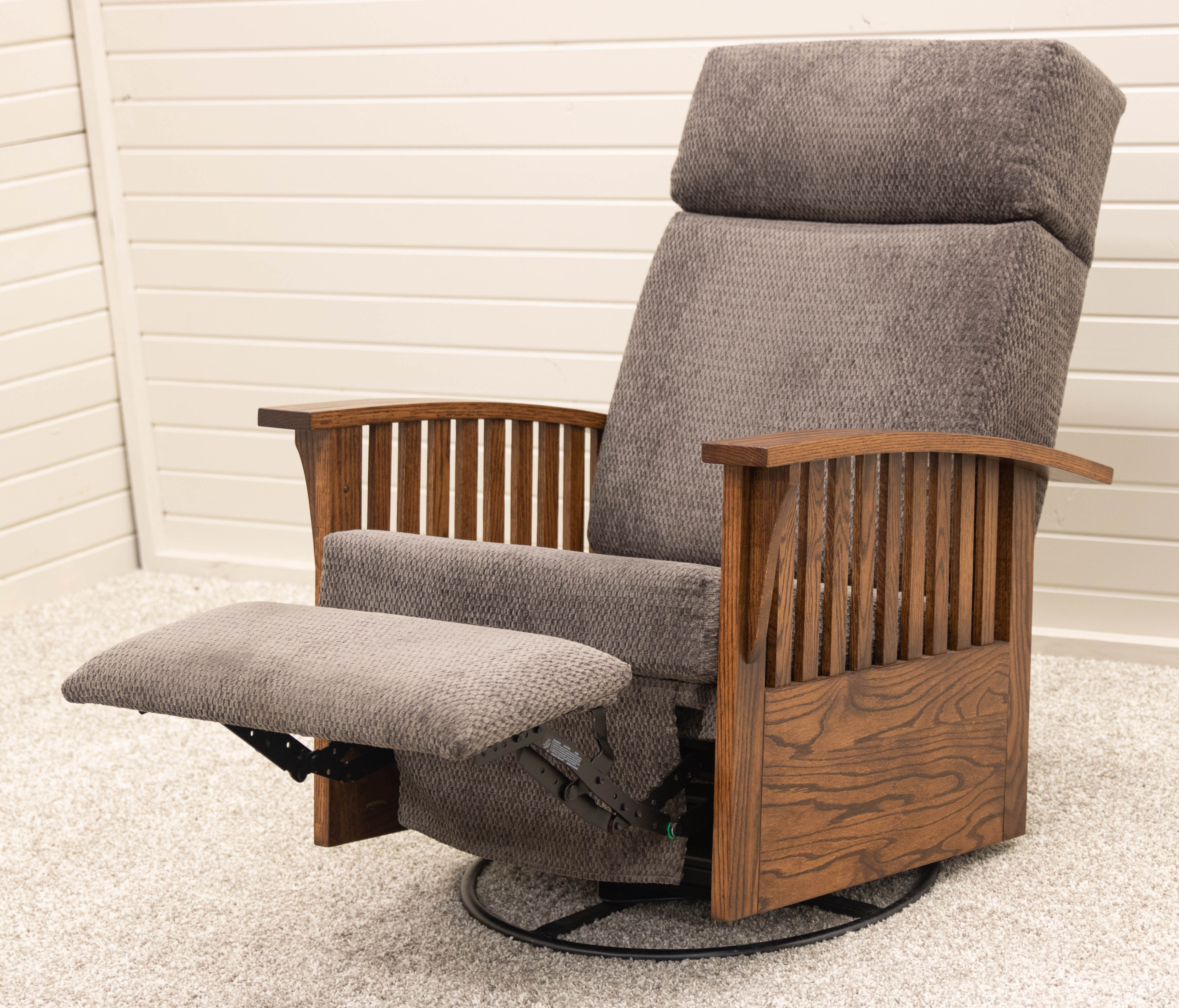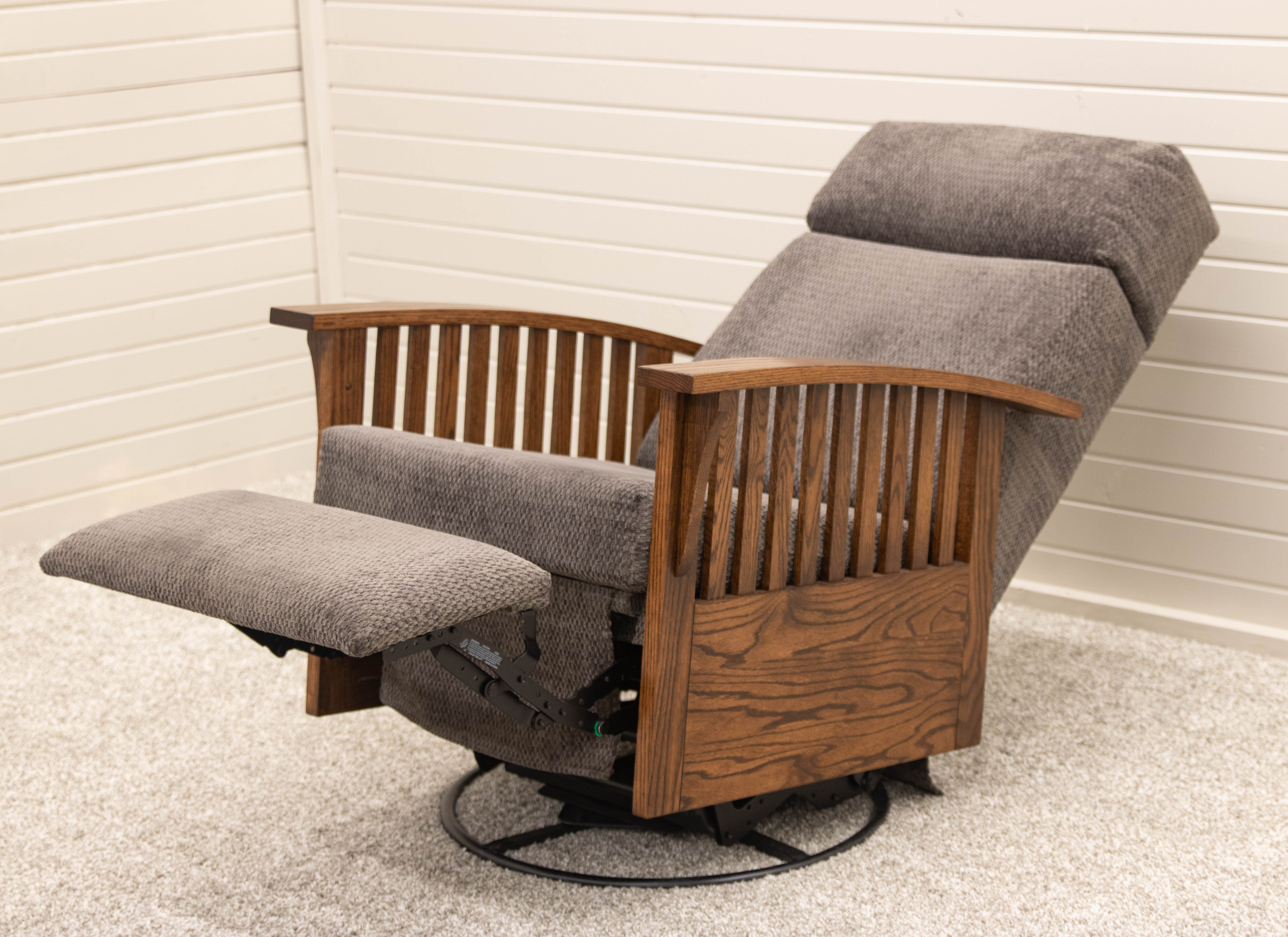 Our mission swivel glider recliners are space saving as well, with no need for a separate ottoman. These reclining mission chairs feature a slim arm style.