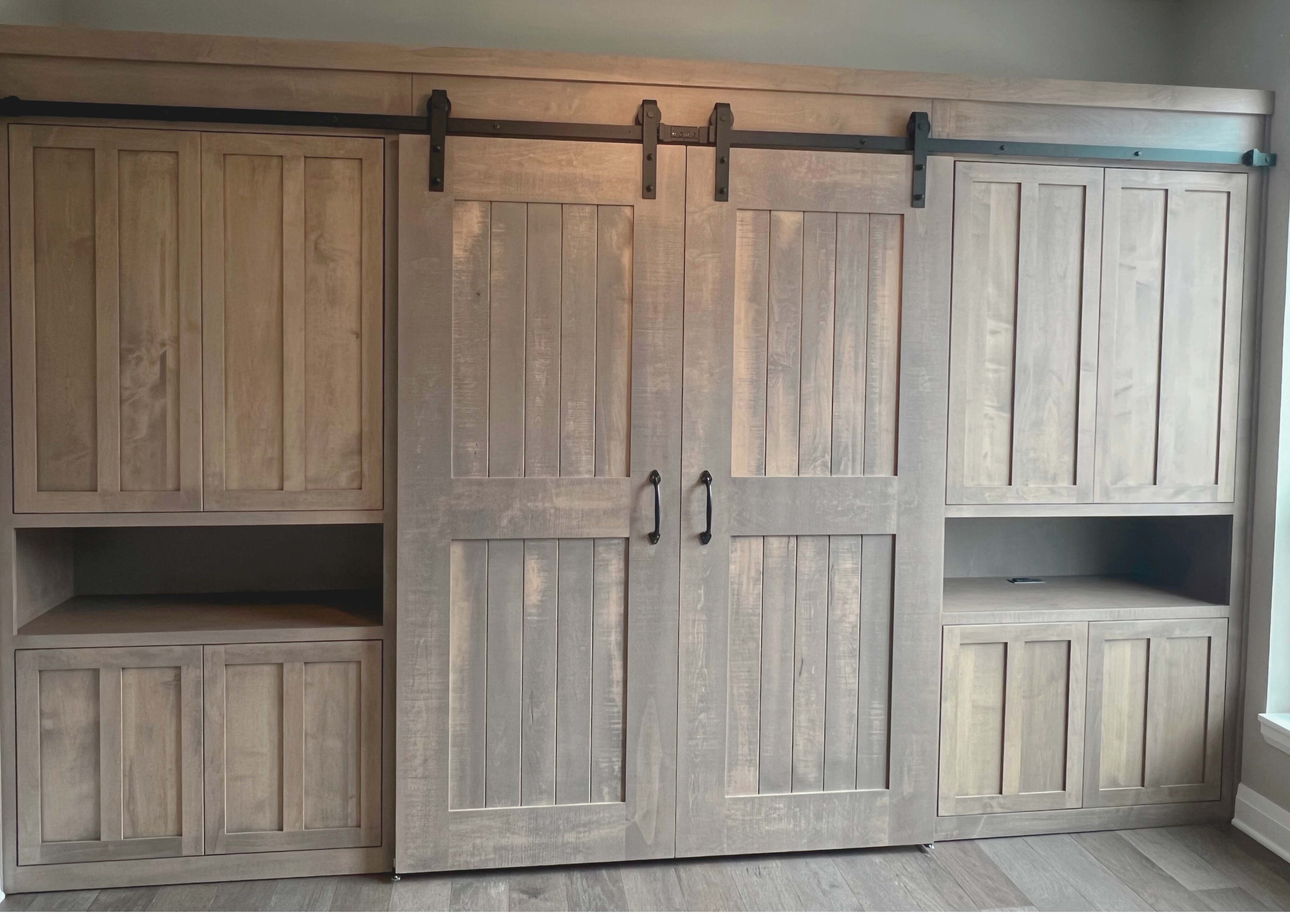 Make the most of your space with a wall-to-wall built in Barn Door Murphy Bed that adds storage and style, displayed here in solid Maple wood.