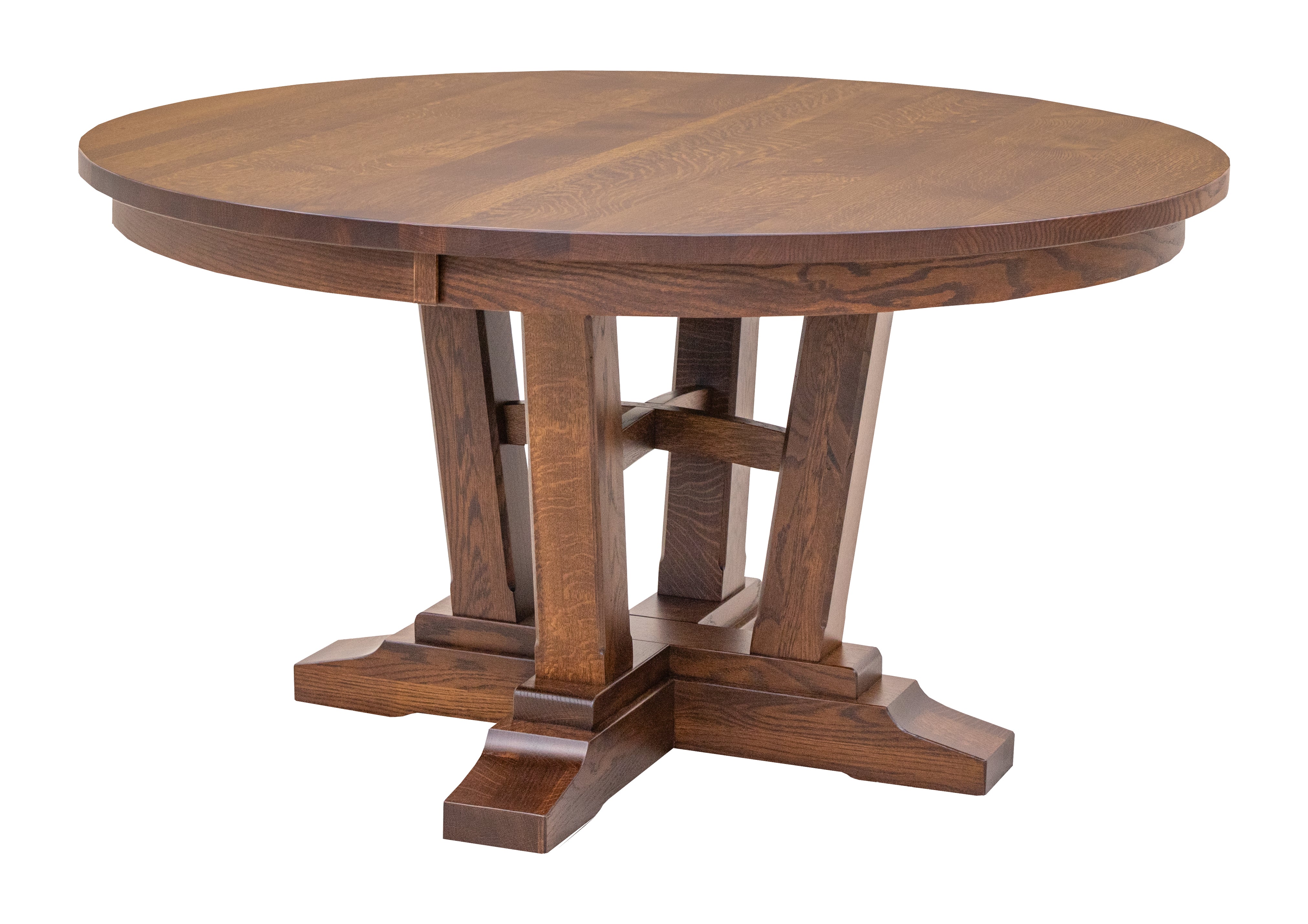 Solid wood quarter sawn White Oak tables have a traditional Mission style. Round Amish dining tables like the Newport and Alberta feature craftsman pedestal bases perfect for quarter sawn White Oak. Popular stain colors for a round Mission white oak dining table include Michael's Cherry, Golden Brown and Asbury.