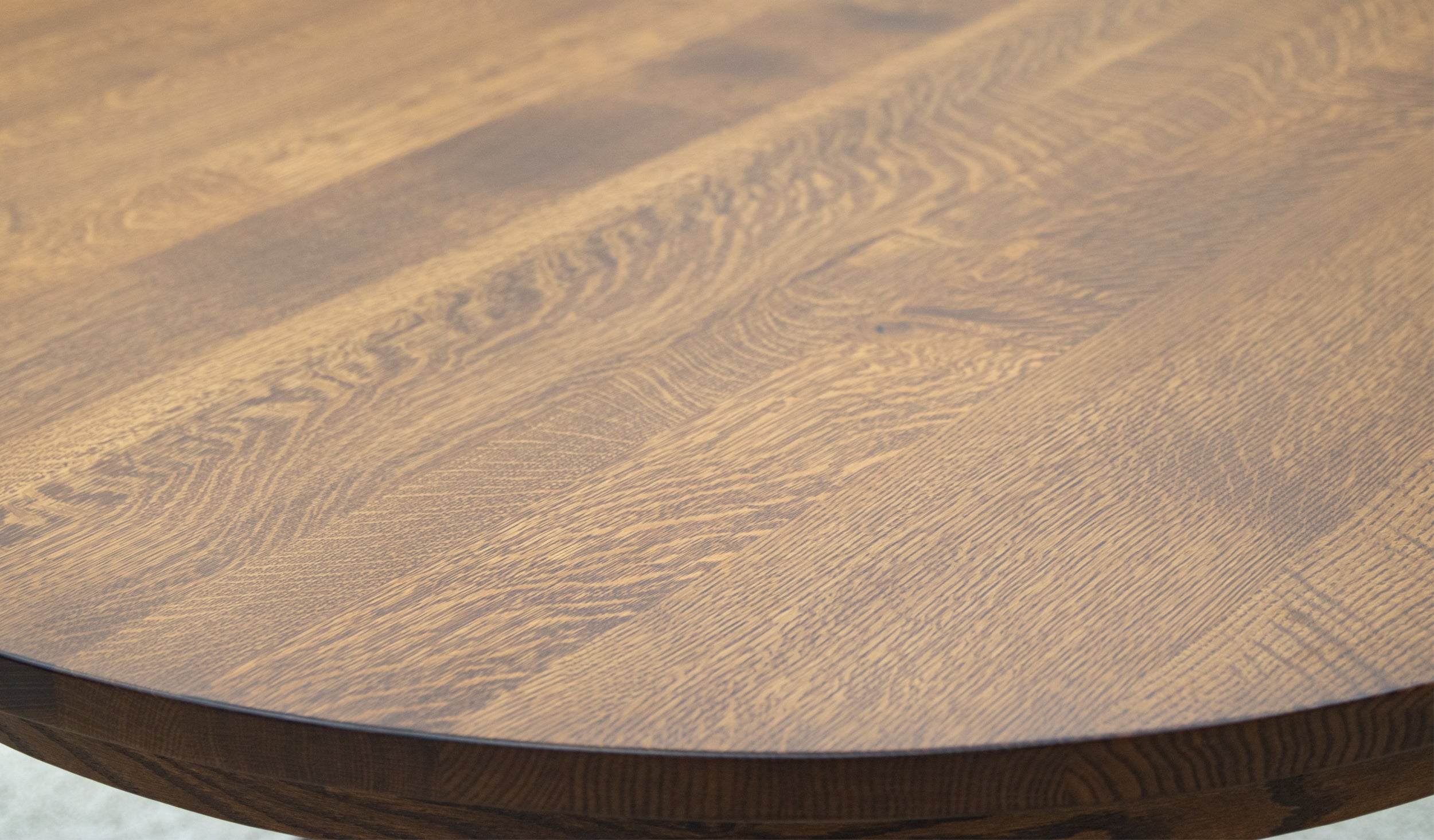 White Oak round dining tables are available with quarter sawn or rift sawn wood. These specialty cuts create an angled view of the grain texture. A rift sawn White Oak wood round table offers a muted grain texture ideal for mid-century modern home styles. Rift sawn round tables shine in light stain colors like DCF Sand and Willowbend.