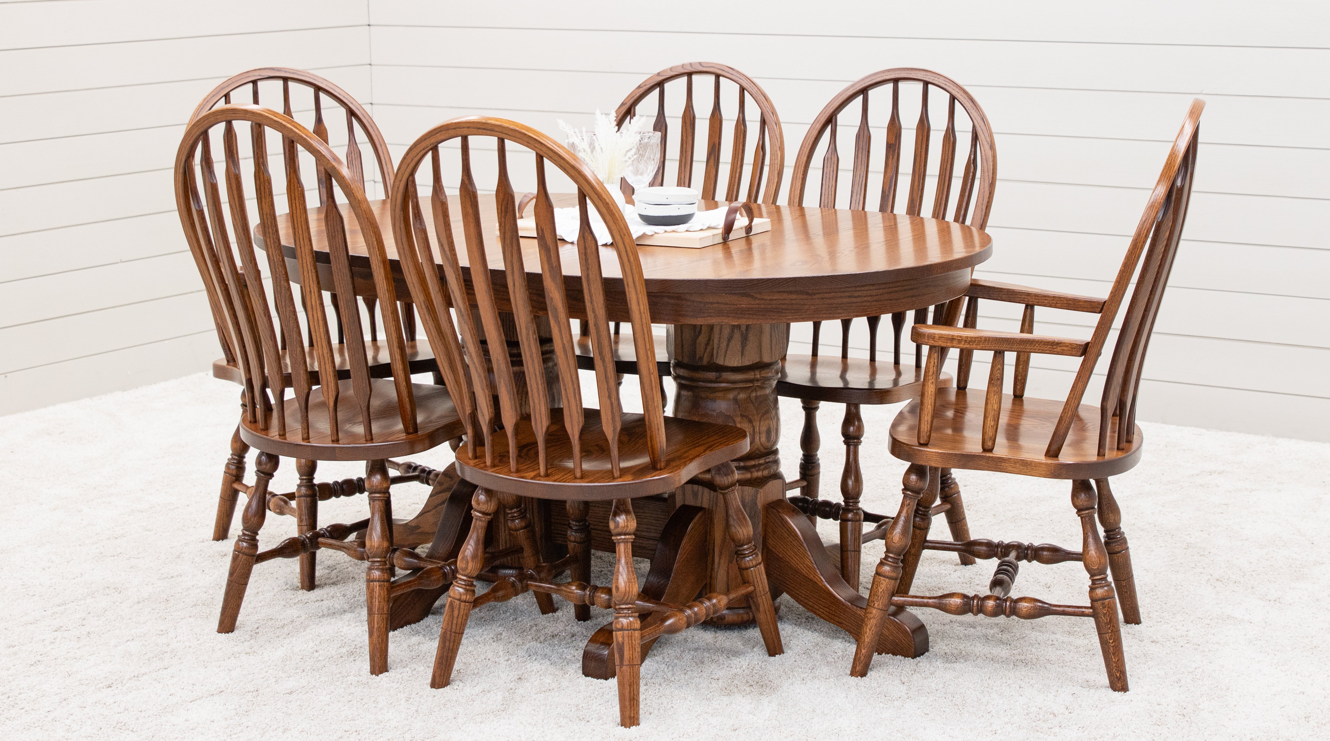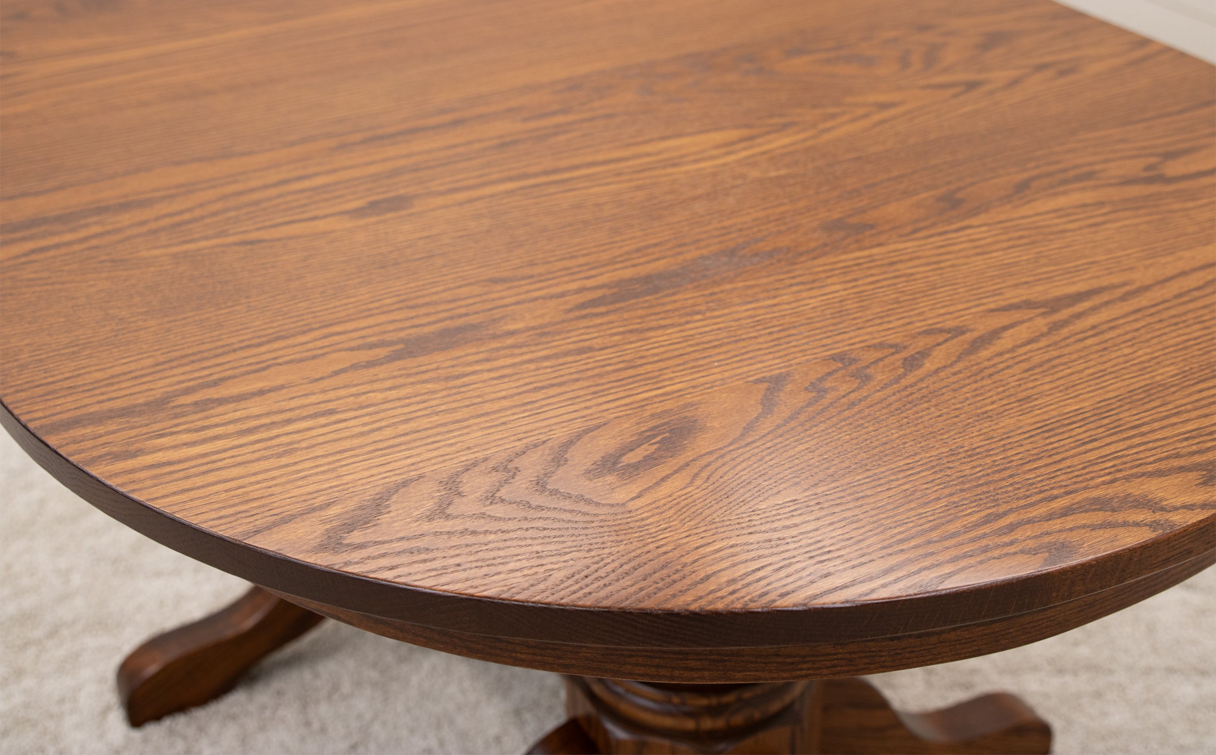 Every dining table is available in your choice of wood type and stain color. Wood options include Red or White Oak, Maple, Cherry, Hickory, Elm, and Walnut wood.