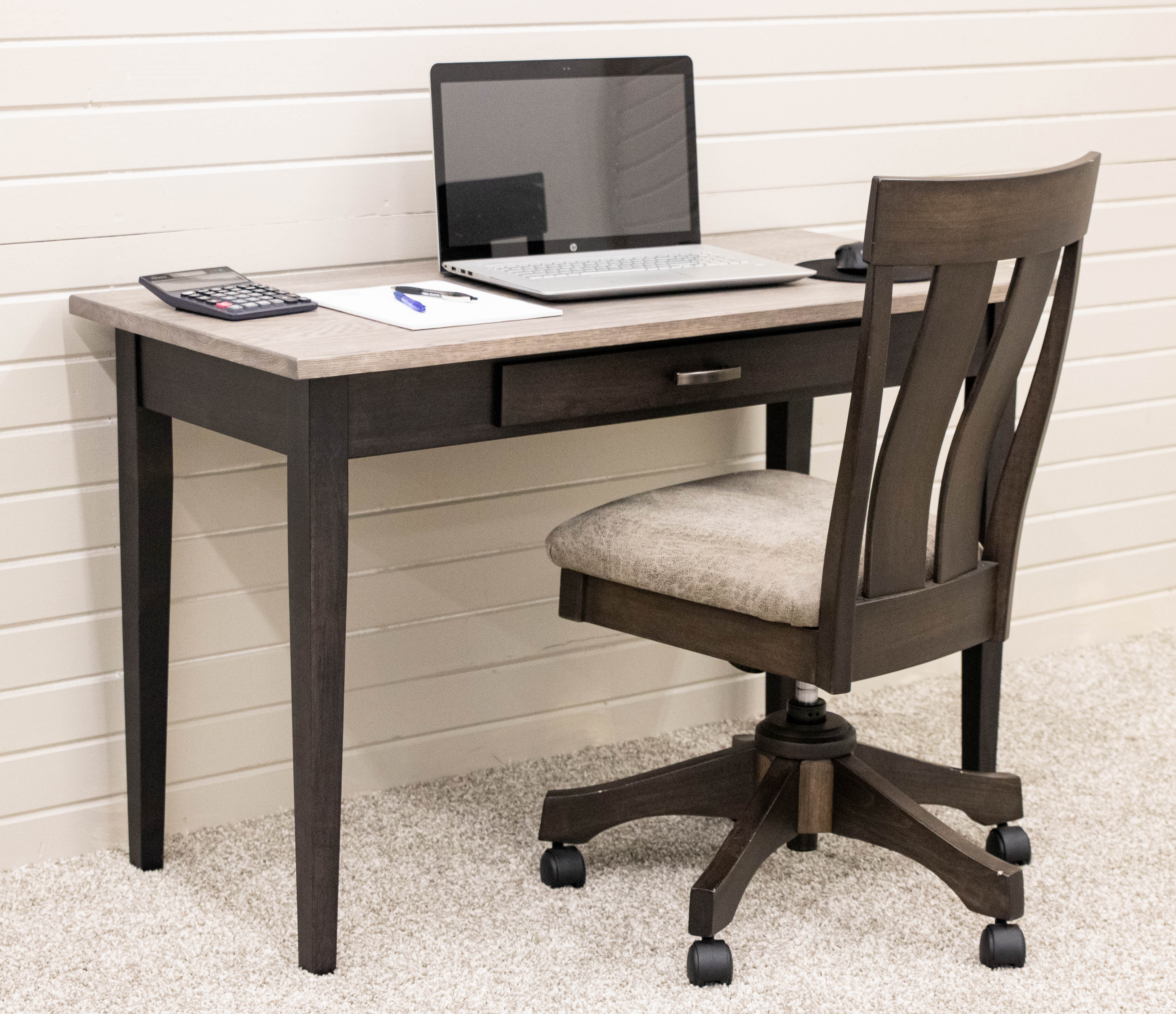 A small space desk that has a desktop perfect for a laptop or notepad, along with a pencil drawer to store pens and other small essentials...