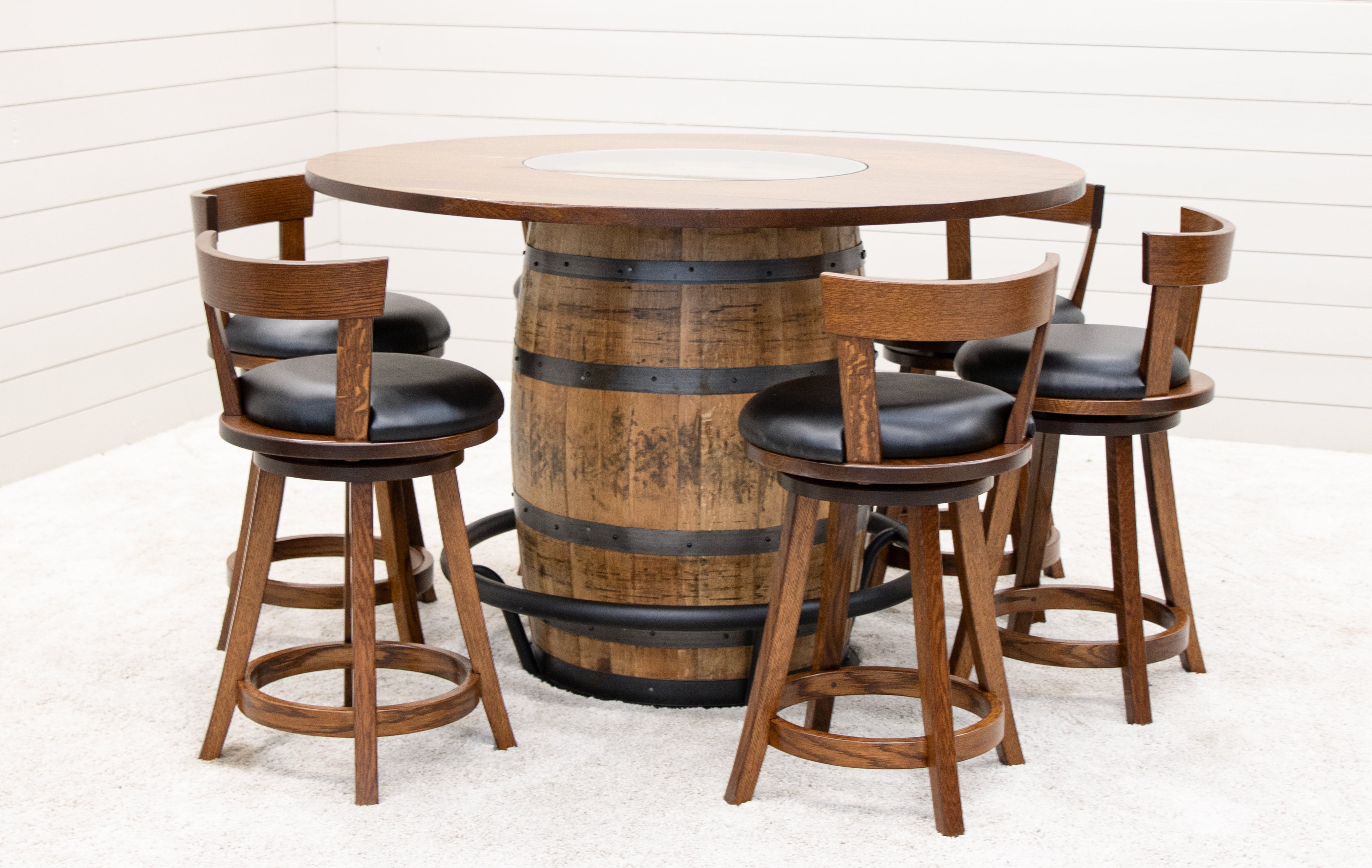 Single barrel tables are also available with 60-inch round tops for large spaces. Smaller sizes are limited, as chairs and stools will not fit neatly under the top without bumping the barrel or the footrail. Single barrel tables make great game tables and gathering spots when hosting friends.