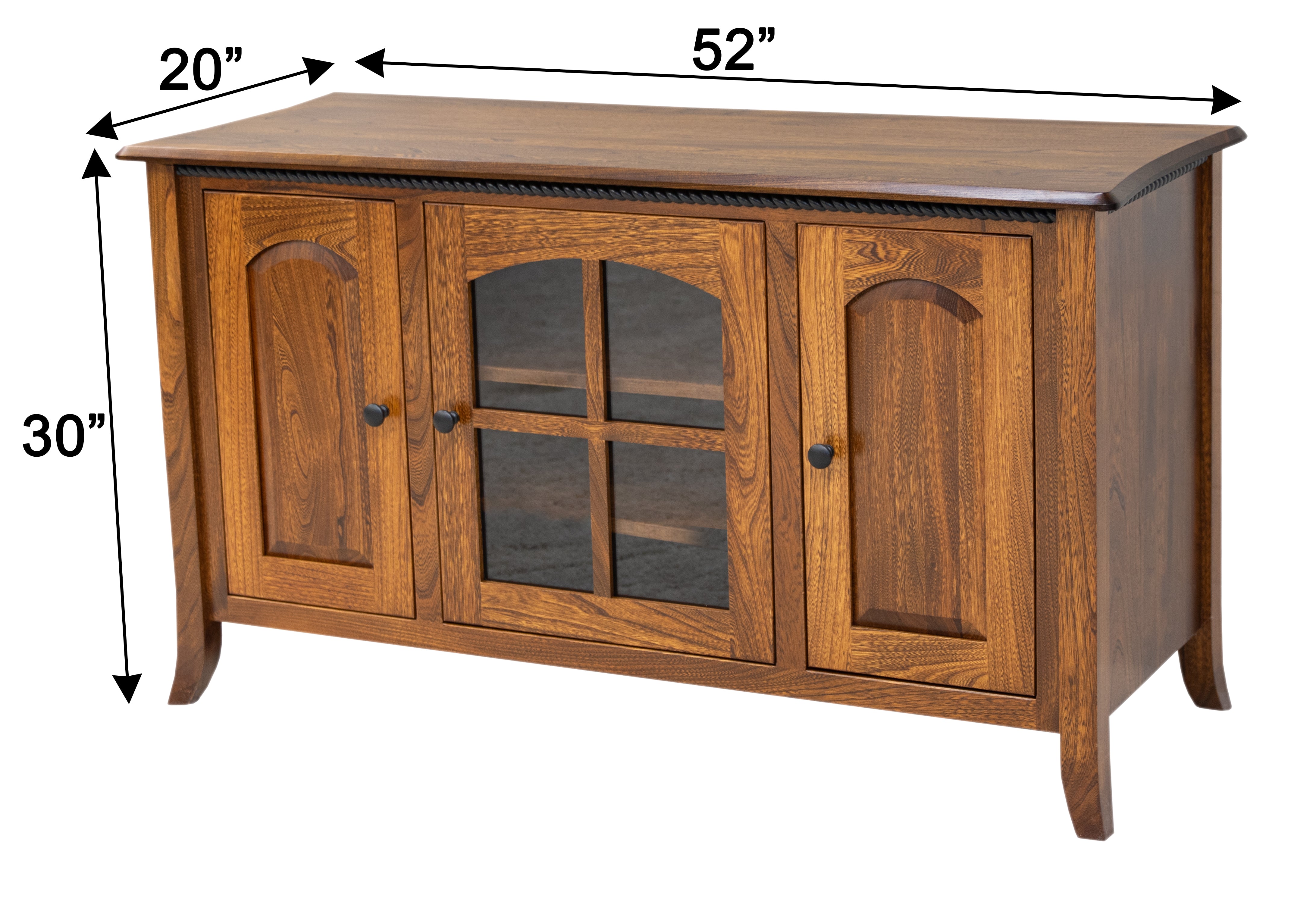 The Plymouth TV Console features flared legs, a beveled top, and black rope trim under the top. The tv console is Amish-made and handcrafted in Ohio. Order this piece in your choice of wood and color. For more details, contact a member of our team.