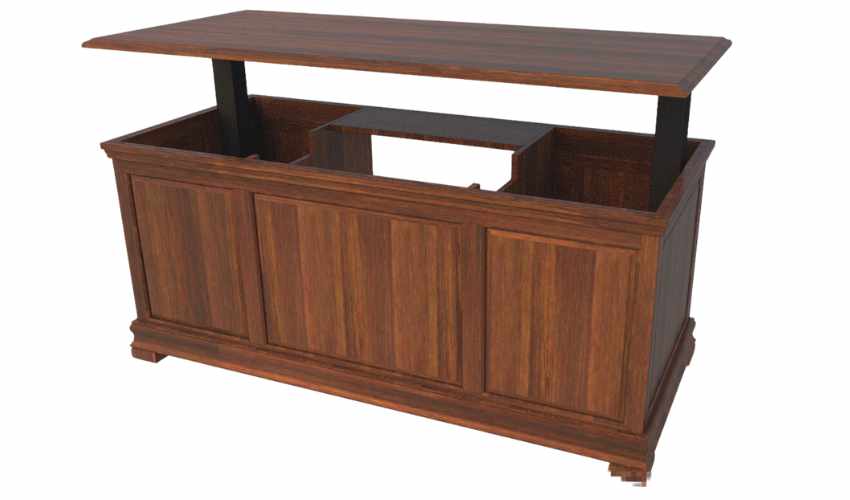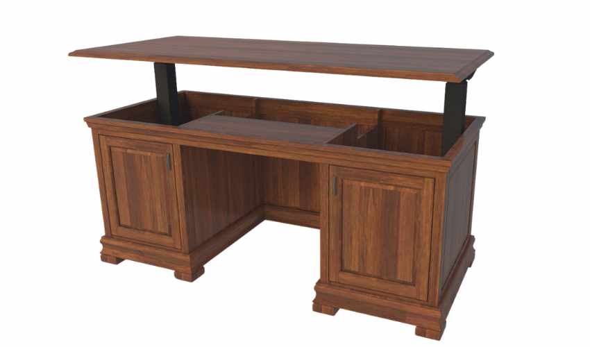 If you need additional office storage, consider adding an uplift desk base to any of our solid wood desks. The Weston Adjustable Standing Desk with Drawers looks like a standard Amish desk style with the top lowered to a sitting position. The solid wood top raises to a comfortable standing height with the push of a button when working. In this option, only the top moves as the drawers of the base stay put.