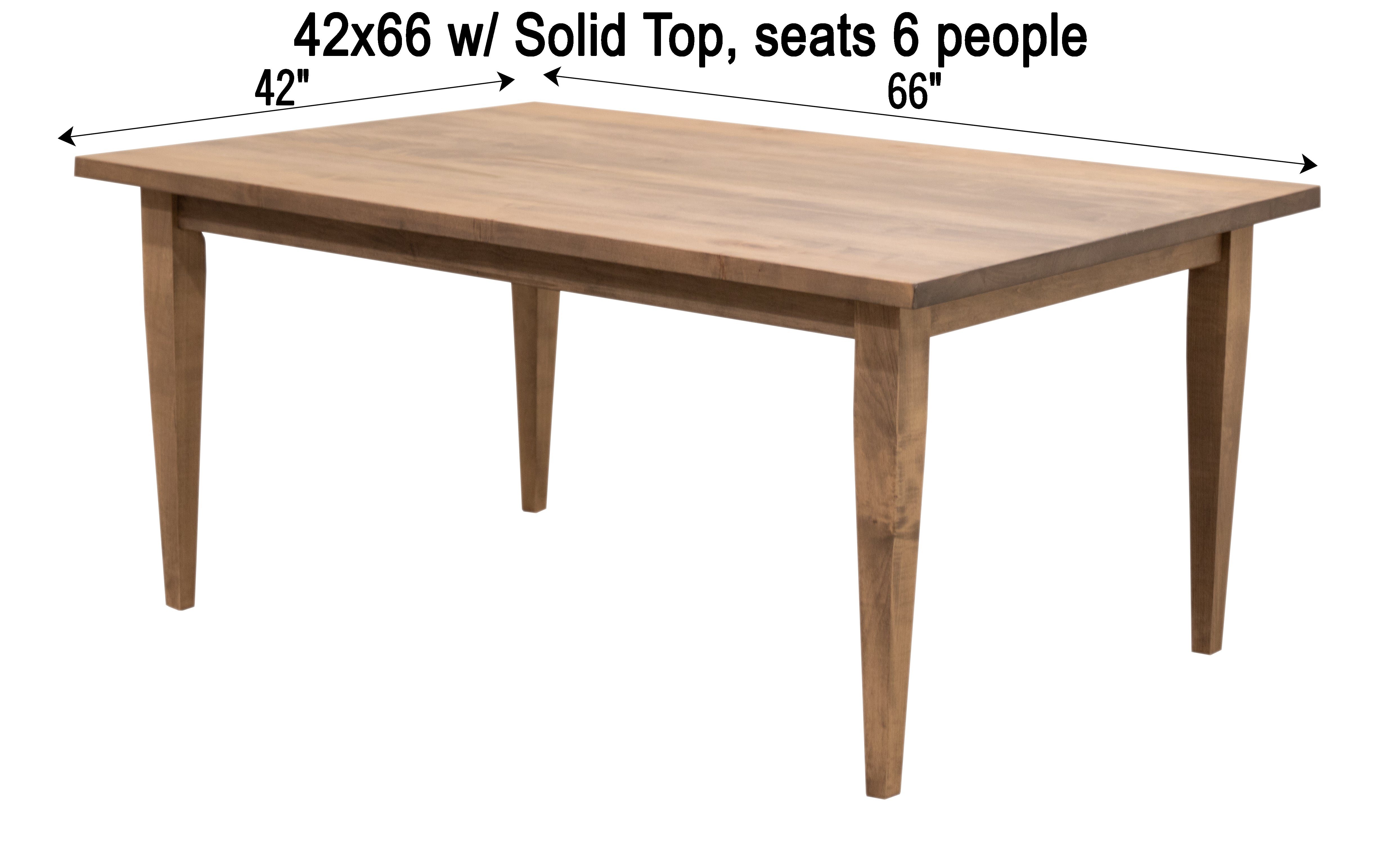Every dining table is available in your choice of wood type and stain color. Wood options include Red or White Oak, Maple, Cherry, Hickory, Elm, and Walnut wood.