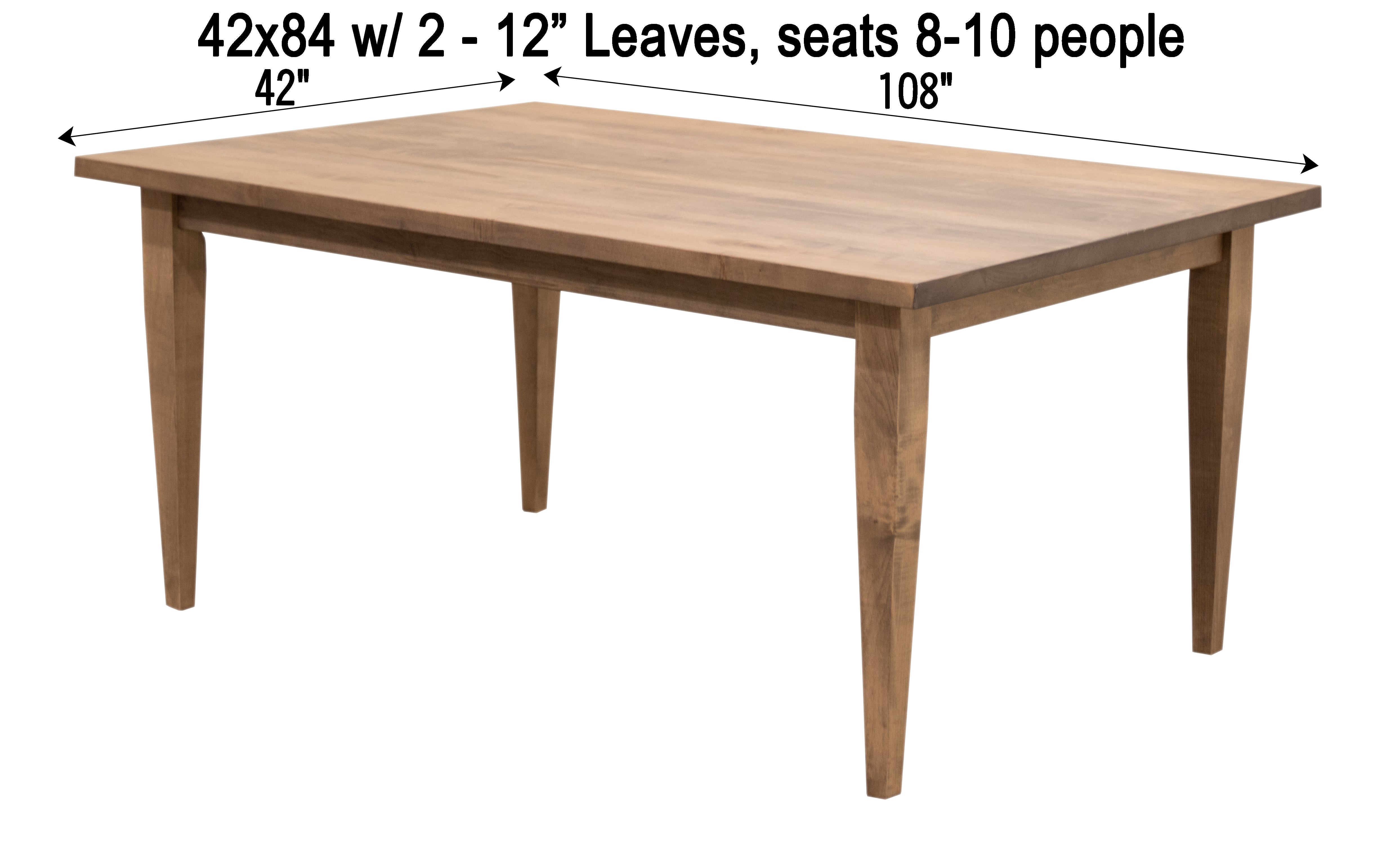 The Shaker Mid Century Dining Table features a 1" thick, solid top made with an eased edge. The Amish dining table has self-storing leaves and it extends easily with gear slides. The grain runs lengthwise on a table without leaves. The grain runs widthwise on a table with leaves. For more info, contact us at Dutch Craft Furniture.