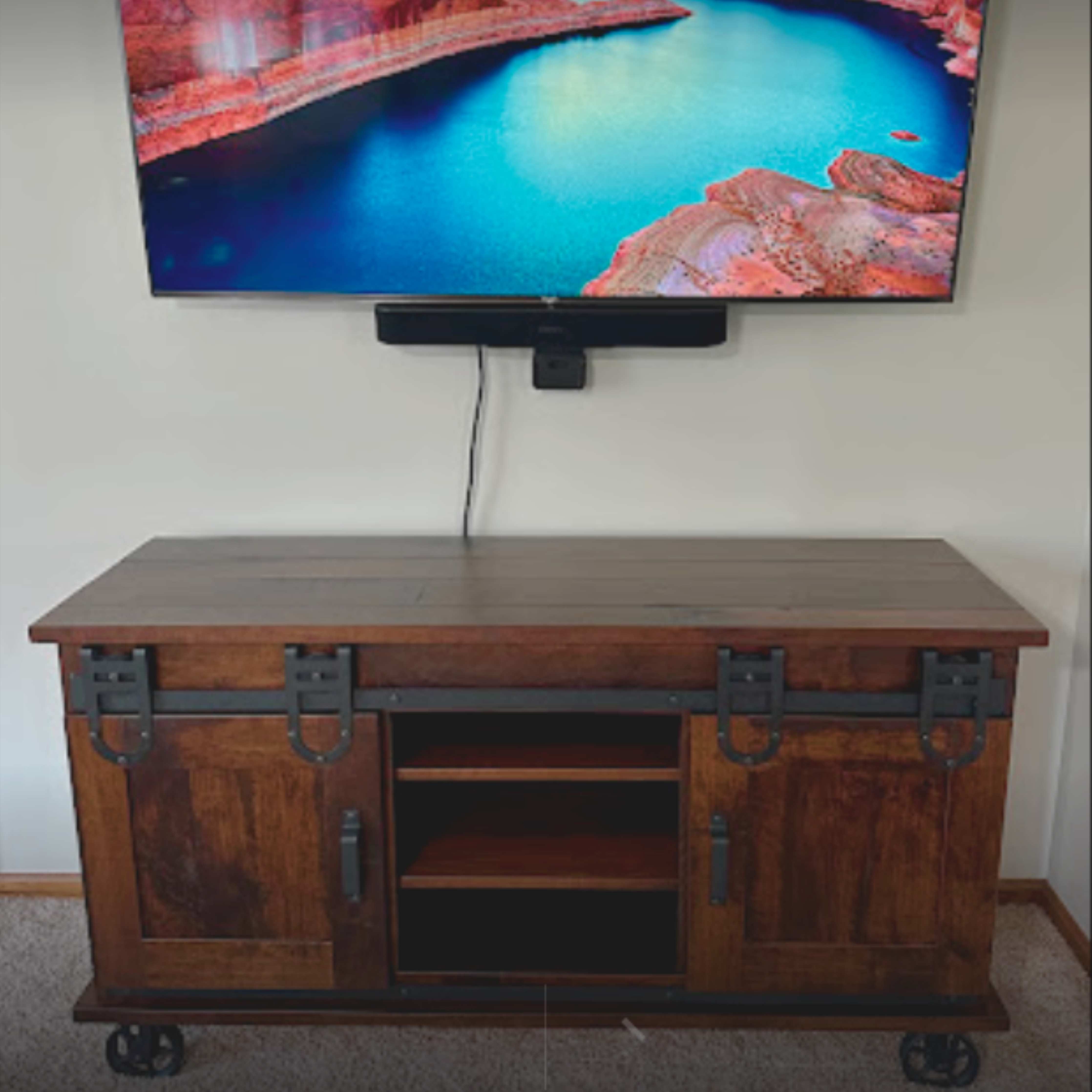 Rustic Cherry wood is another favorite option for the Arcadia collection of TV stands and occasional tables. We display the rustic collection in Cherry wood with Asbury Brown stain.