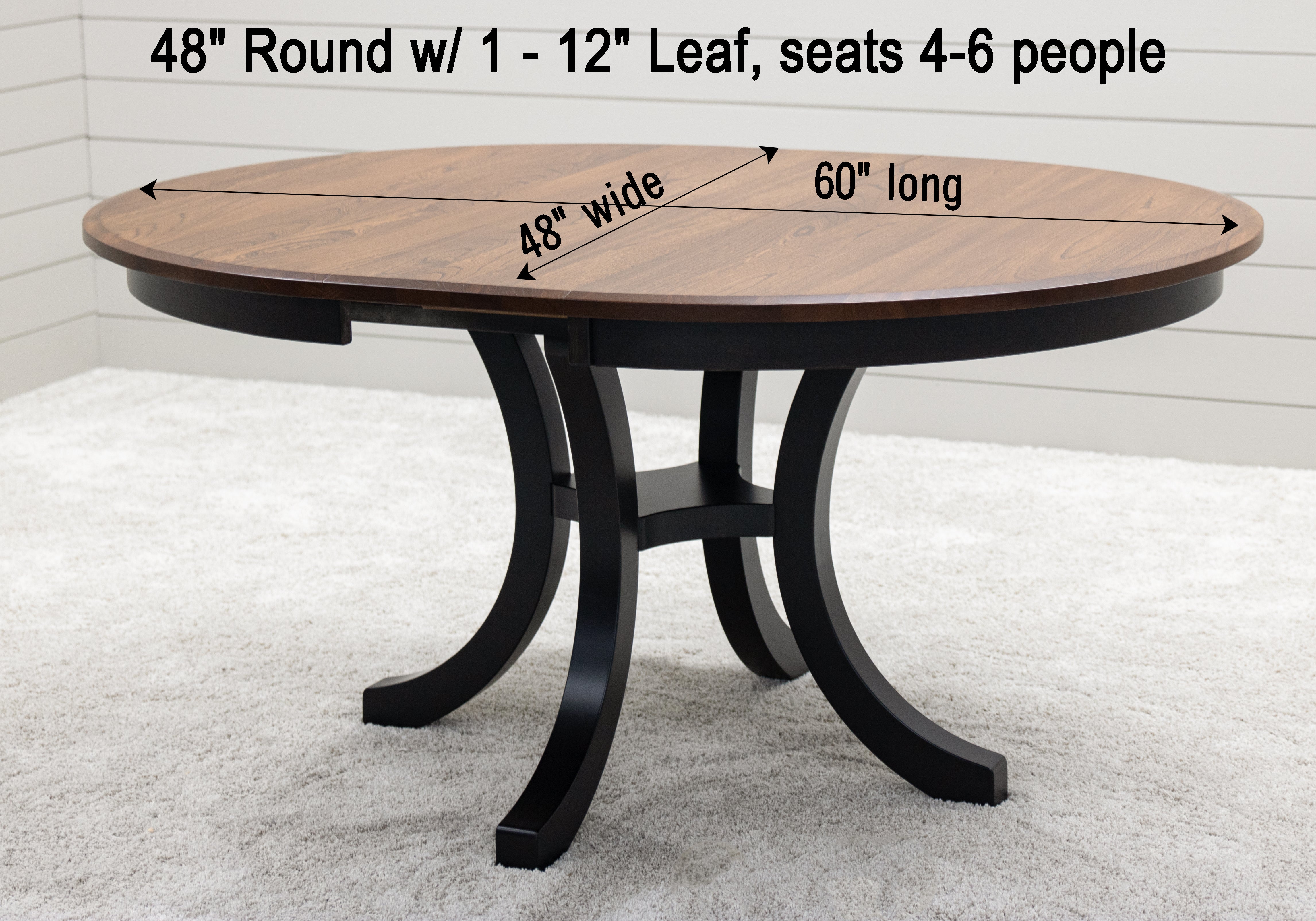 Every dining table is available in your choice of wood type and stain color. Wood options include Red or White Oak, Maple, Cherry, Hickory, Elm, and Walnut wood.