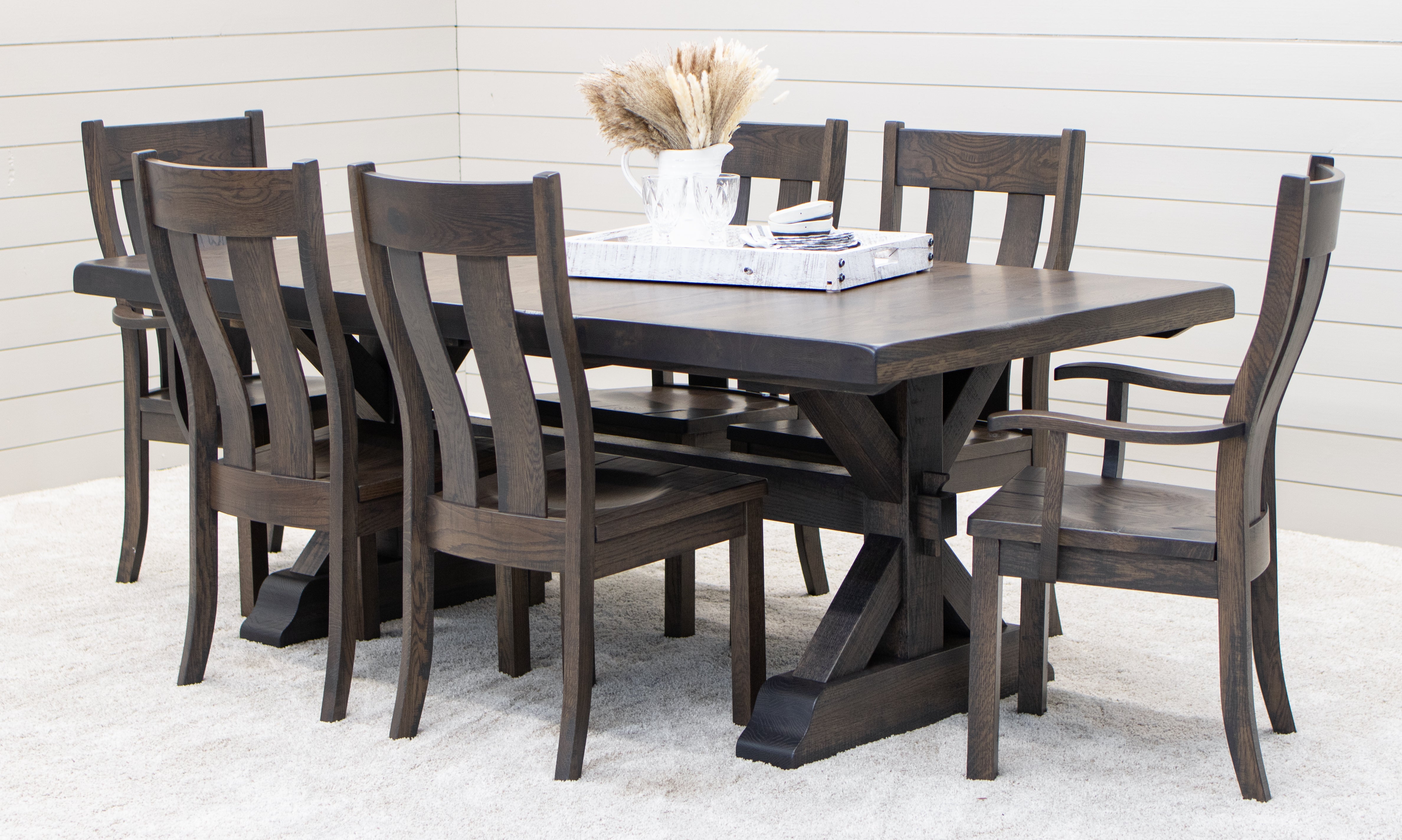 Every dining table is available in your choice of wood type and stain color. Wood options include Red or White Oak, Maple, Cherry, Hickory, Elm, and Walnut wood.