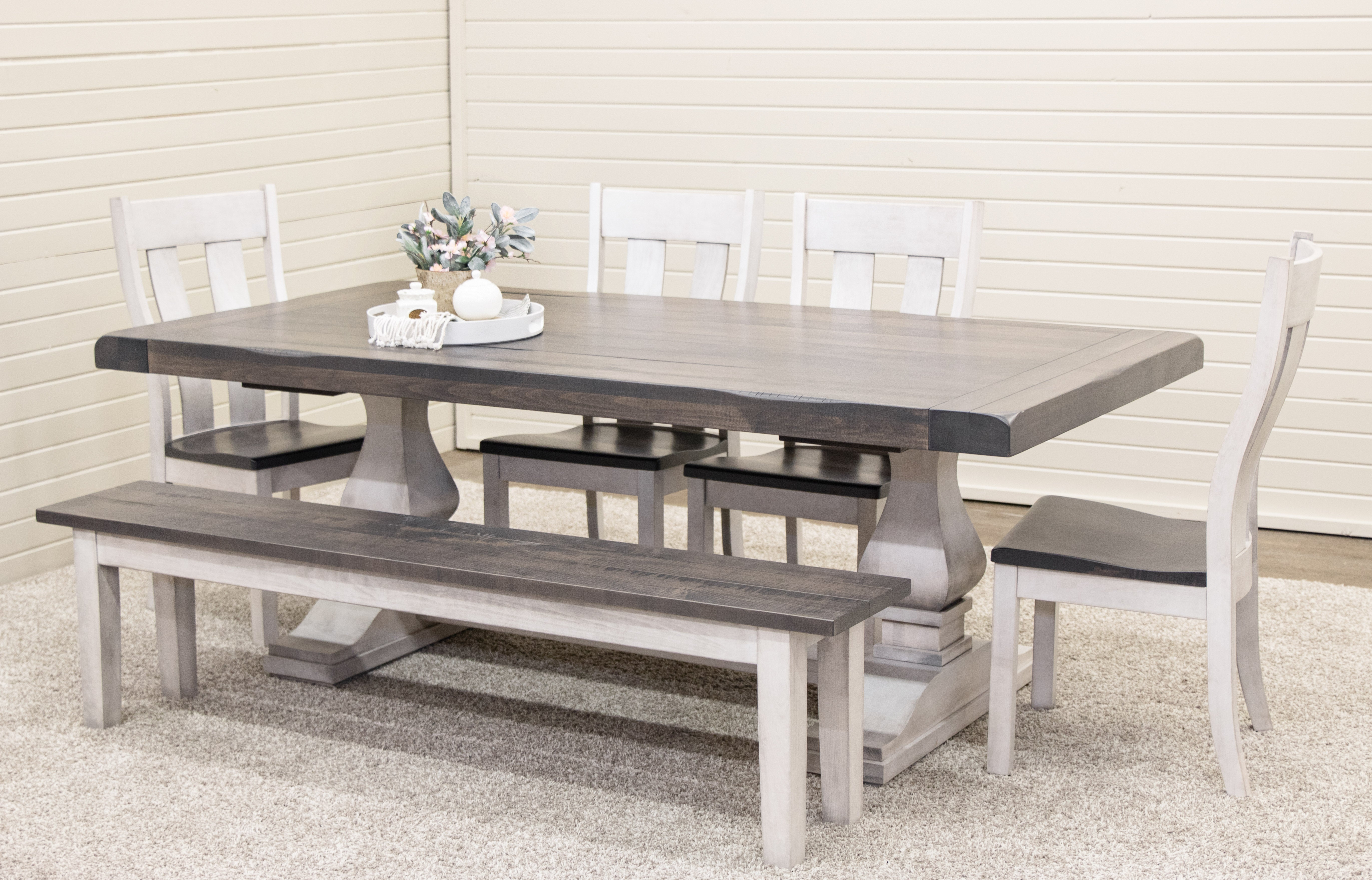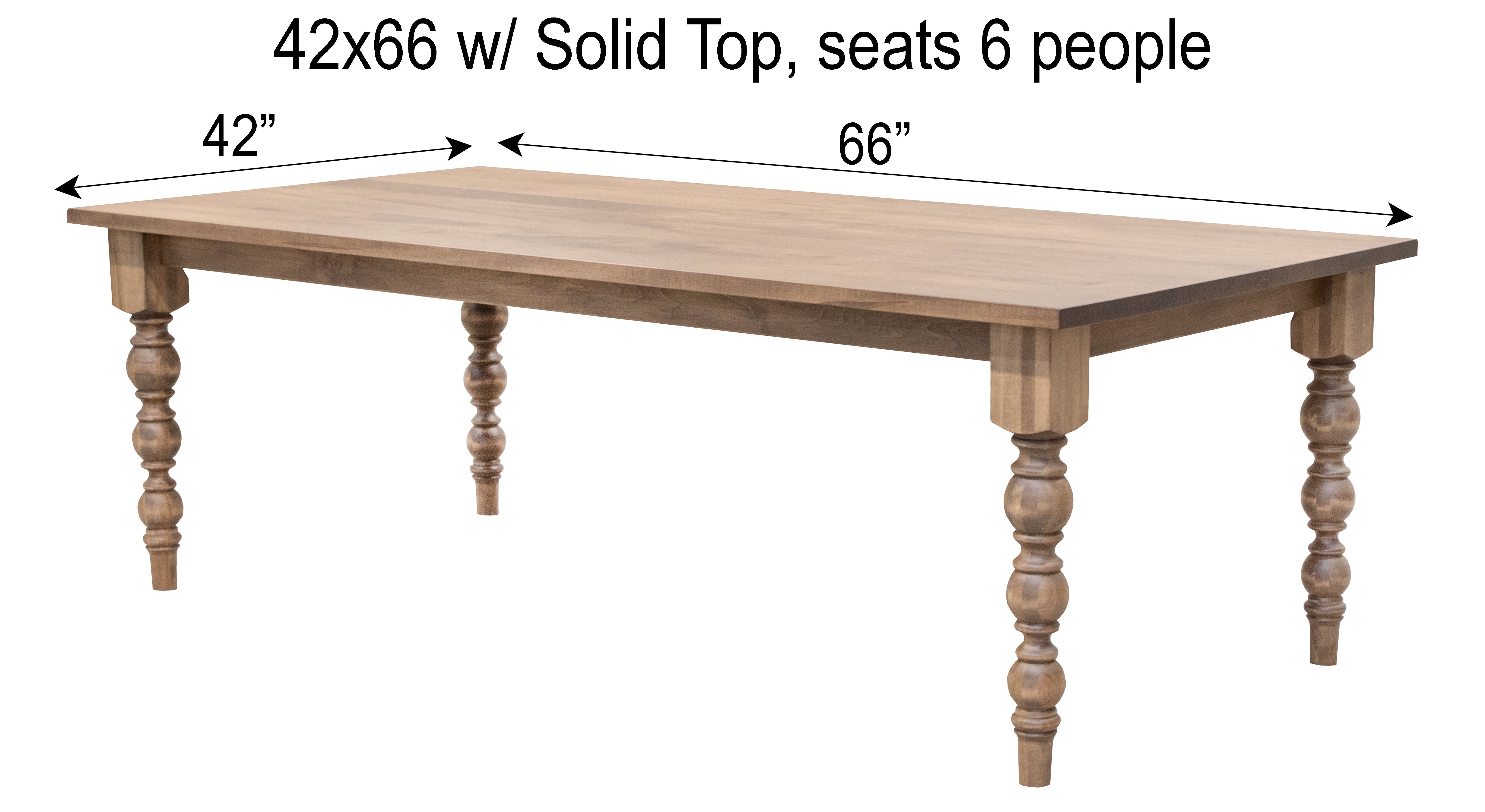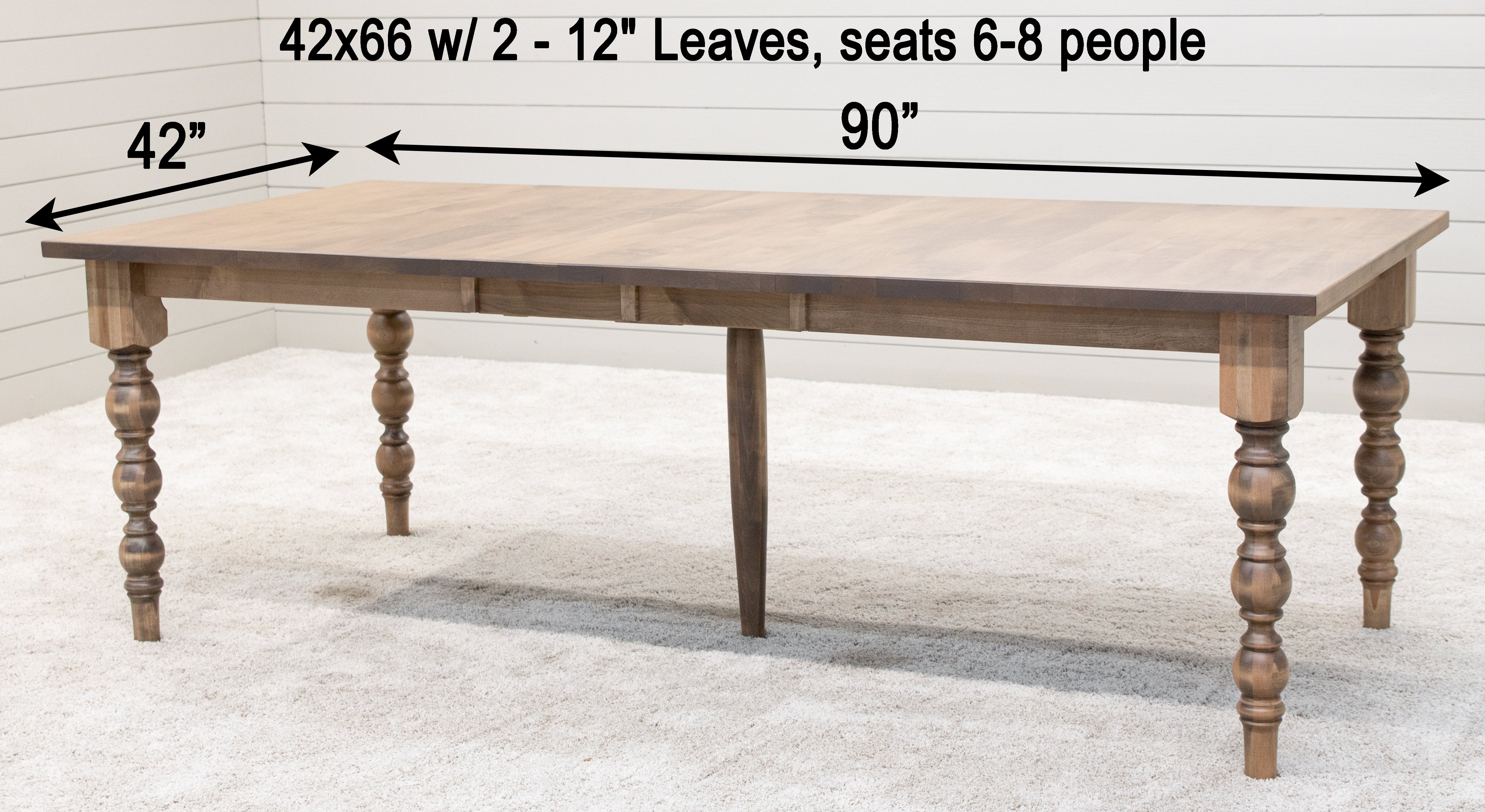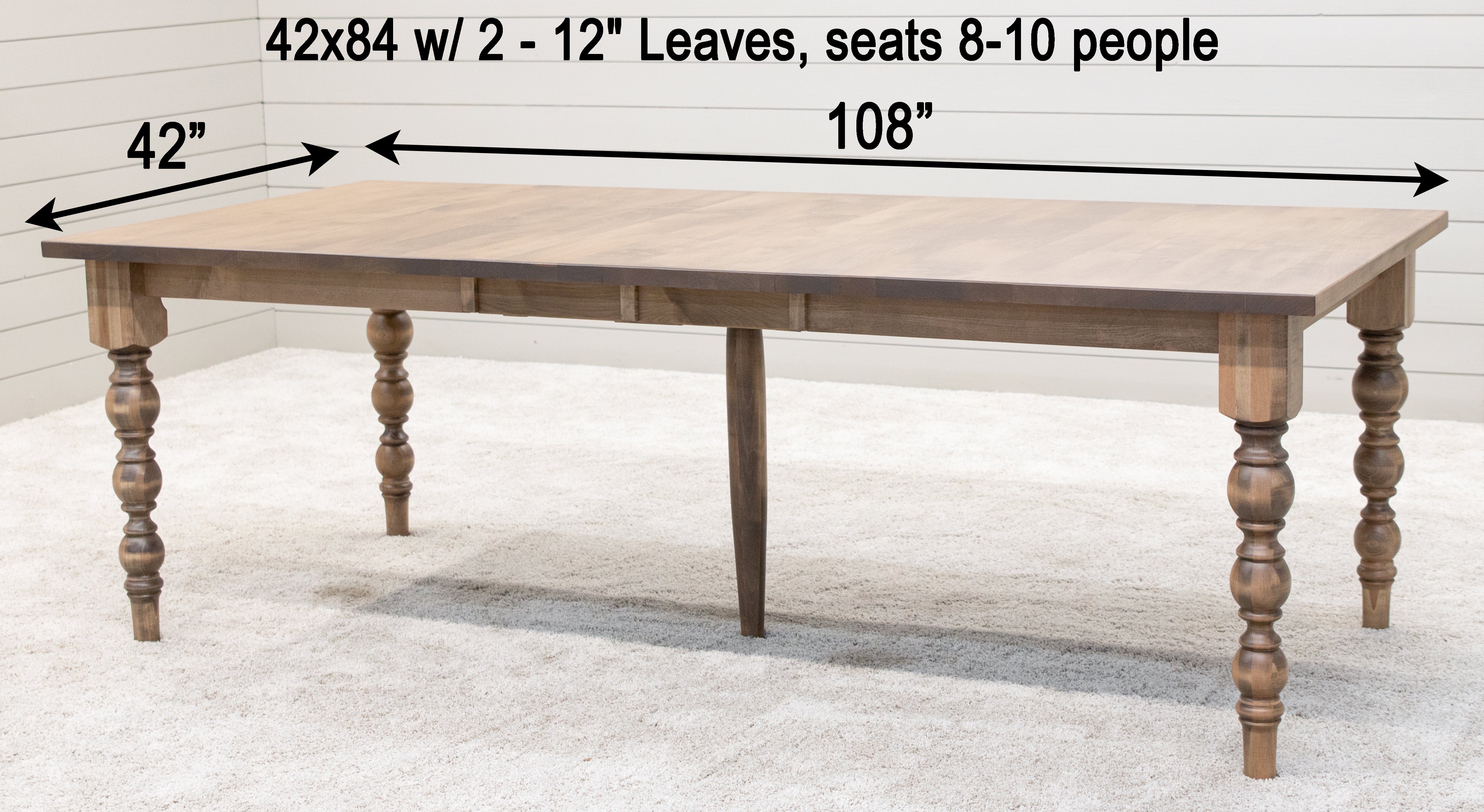 Every dining table is available in your choice of wood type and stain color. Wood options include Red or White Oak, Maple, Cherry, Hickory, Elm, and Walnut wood.