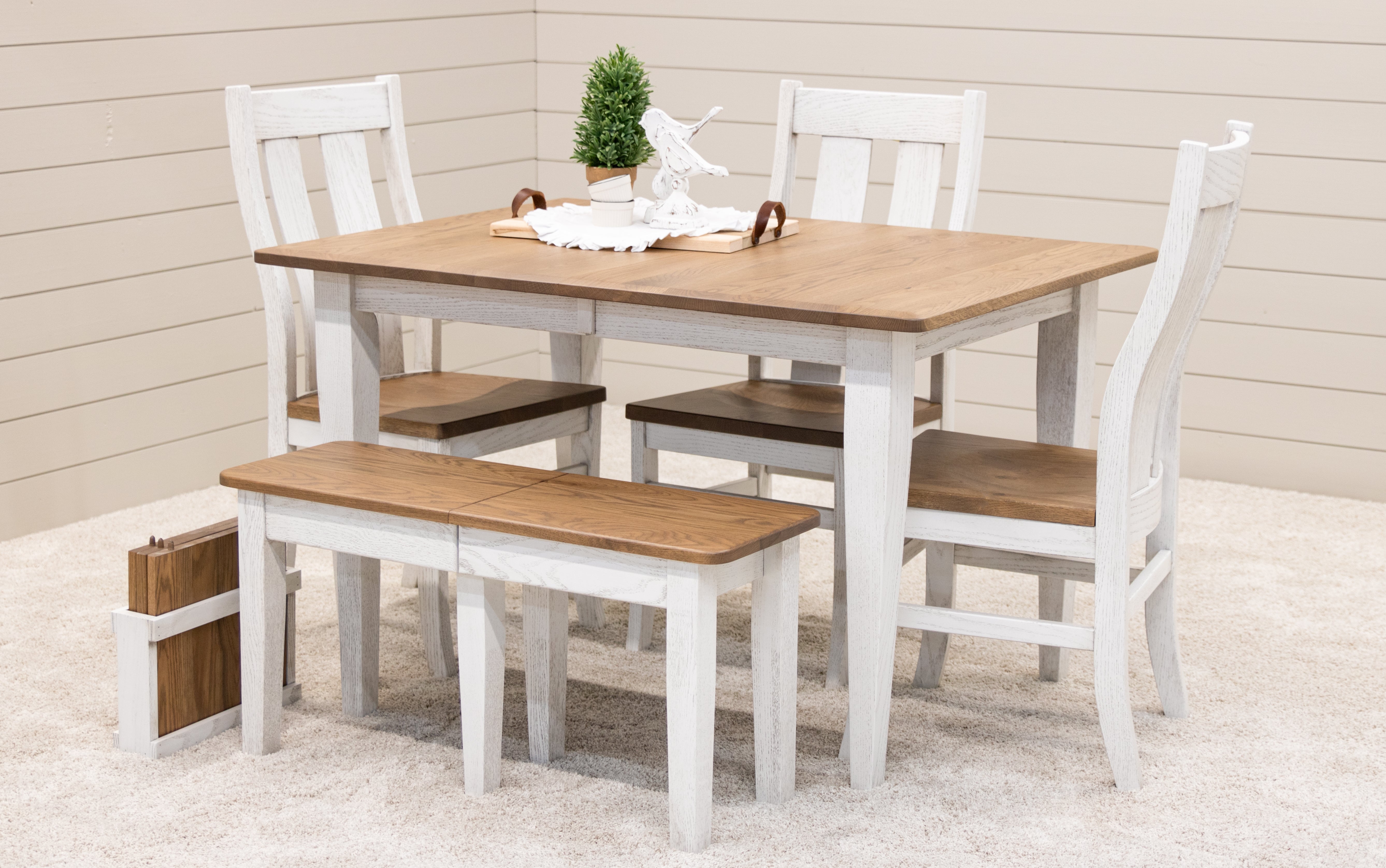 Finally, consider a chunky leg dining table by adding 5" farm table legs, shown on the Arcadia Dining Table. The 5" farm leg style is best suited for medium to large dining tables, at least 42 inches wide by 66" long. The large, 5" legs are perfect for highlighting a rustic, multi-step finish like Coastal White on Red Oak wood.