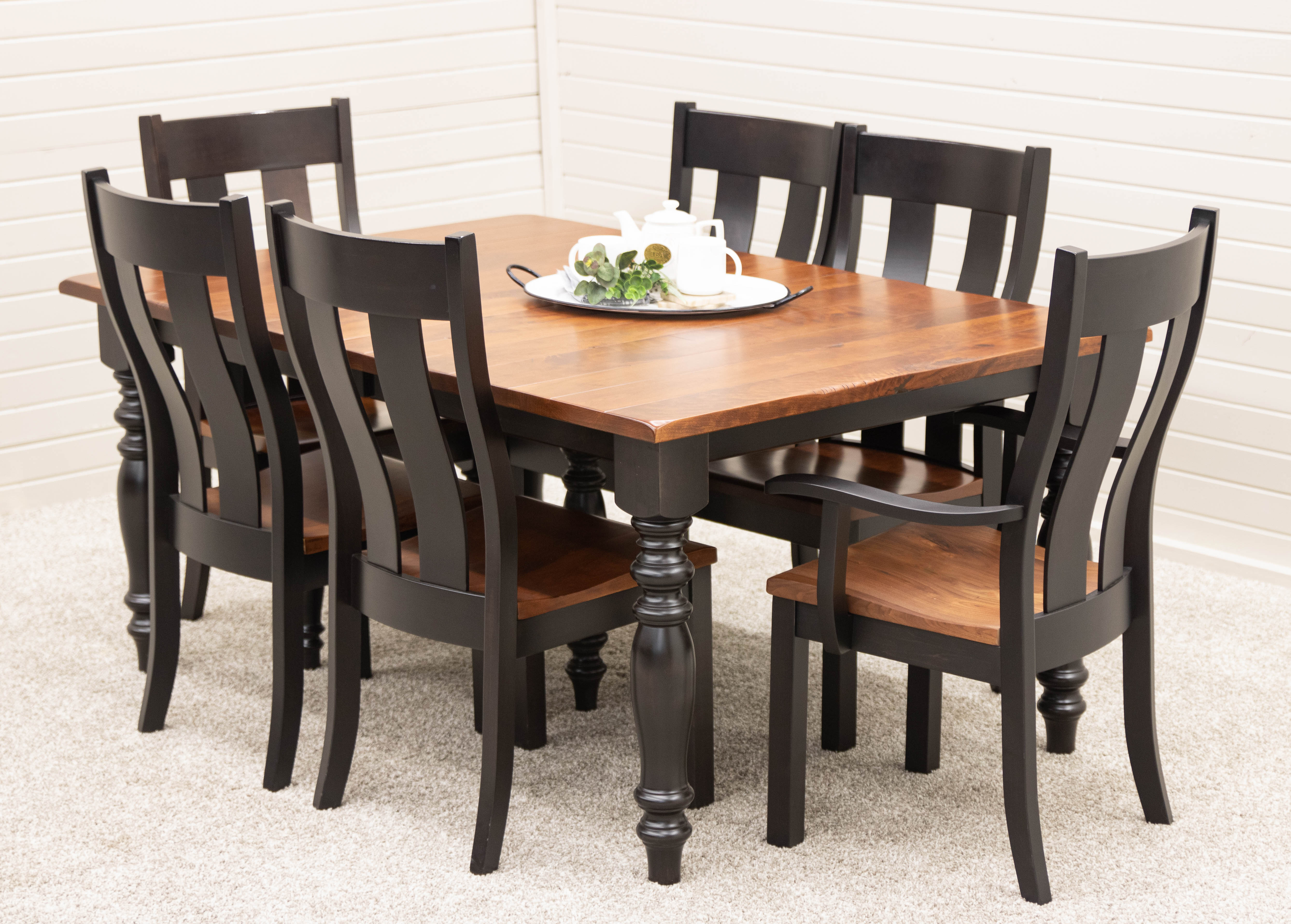 As you browse the dining table styles, you will see many beautiful solid wood dining tables with black legs. This is a timeless furniture style trend that blends well into many homes without completely renovating the kitchen. Notice table tops in Maple, Cherry, Elm, Oak, Hickory and Walnut in a wide range of finish colors, all paired with black table legs.