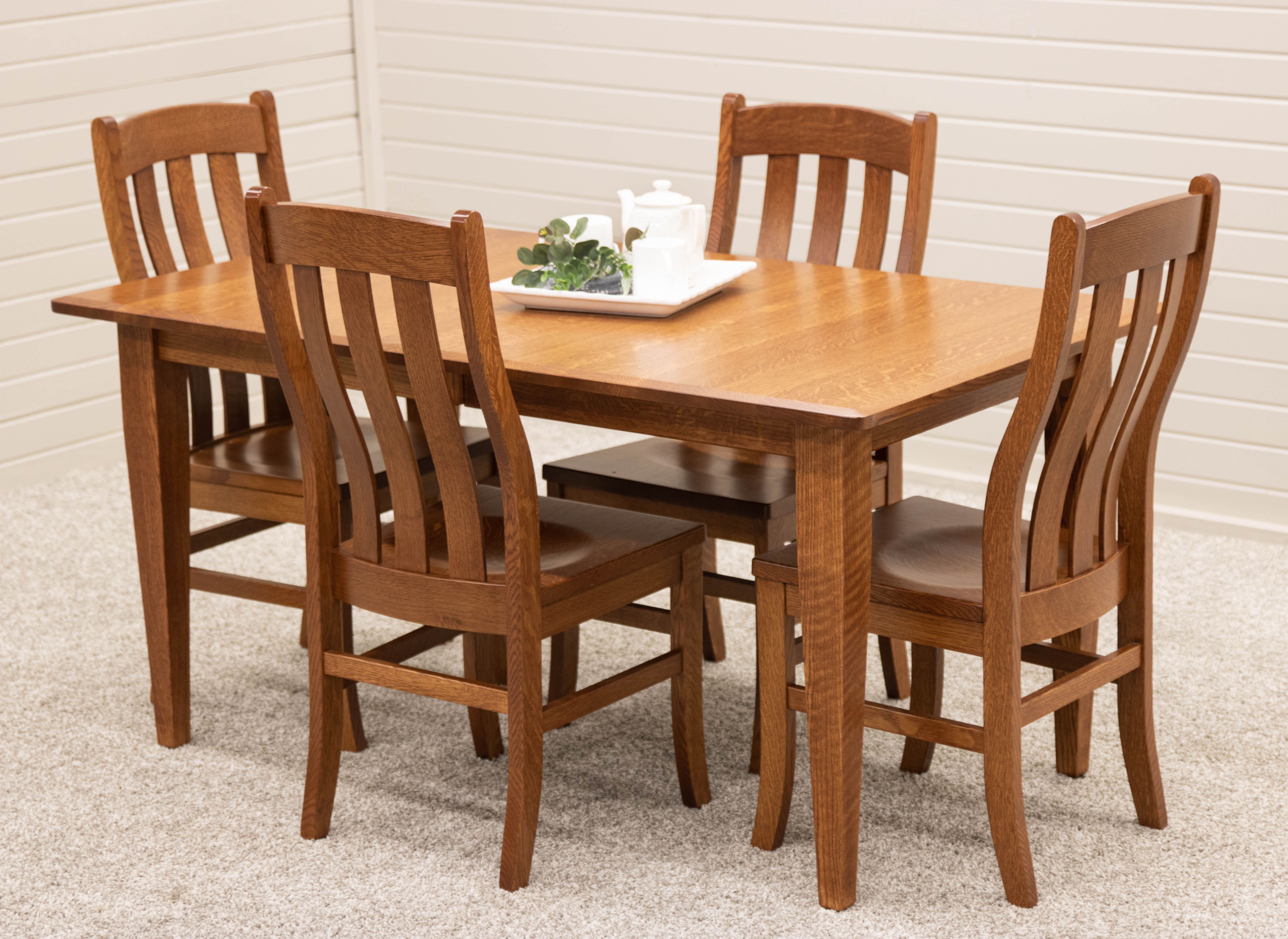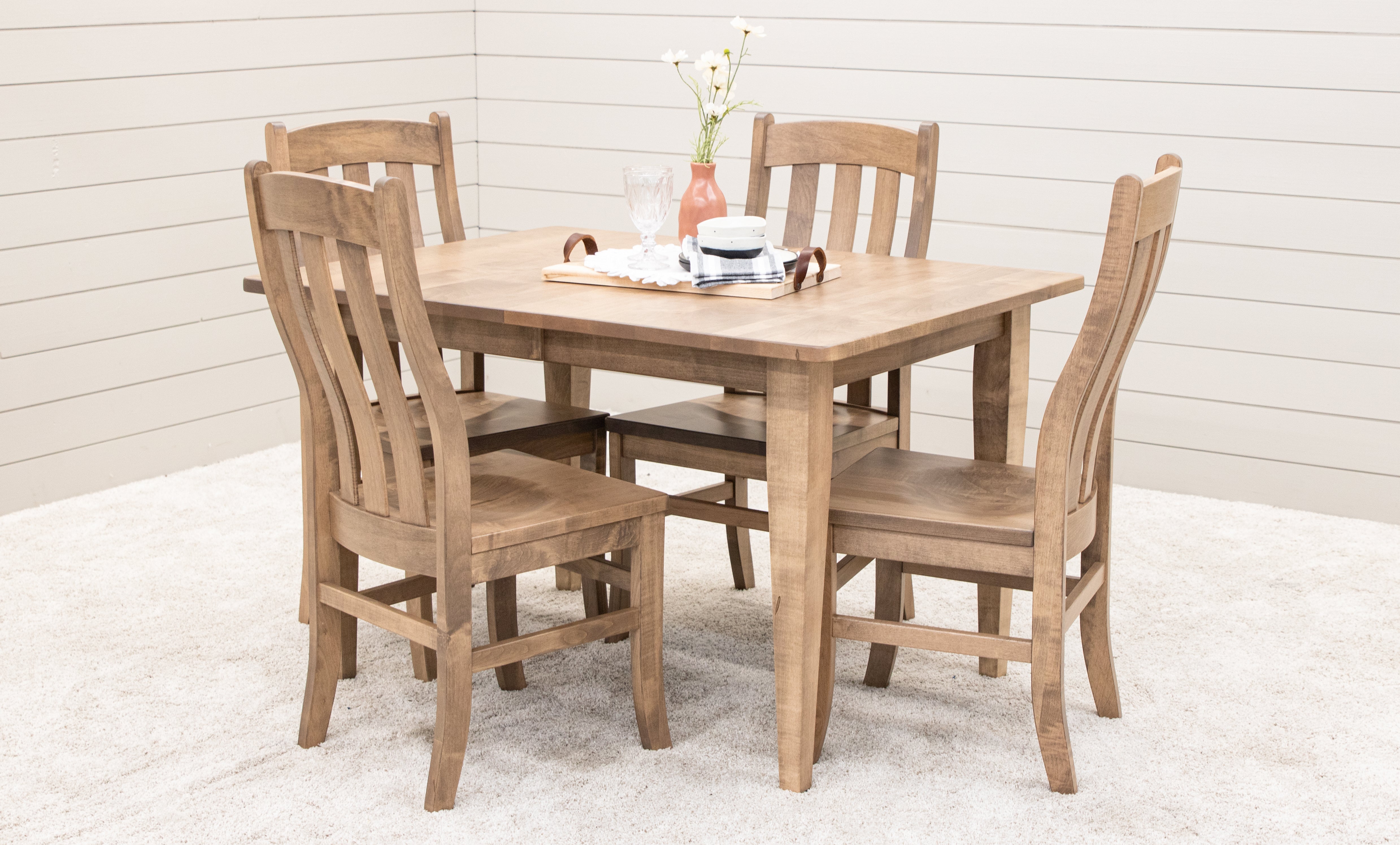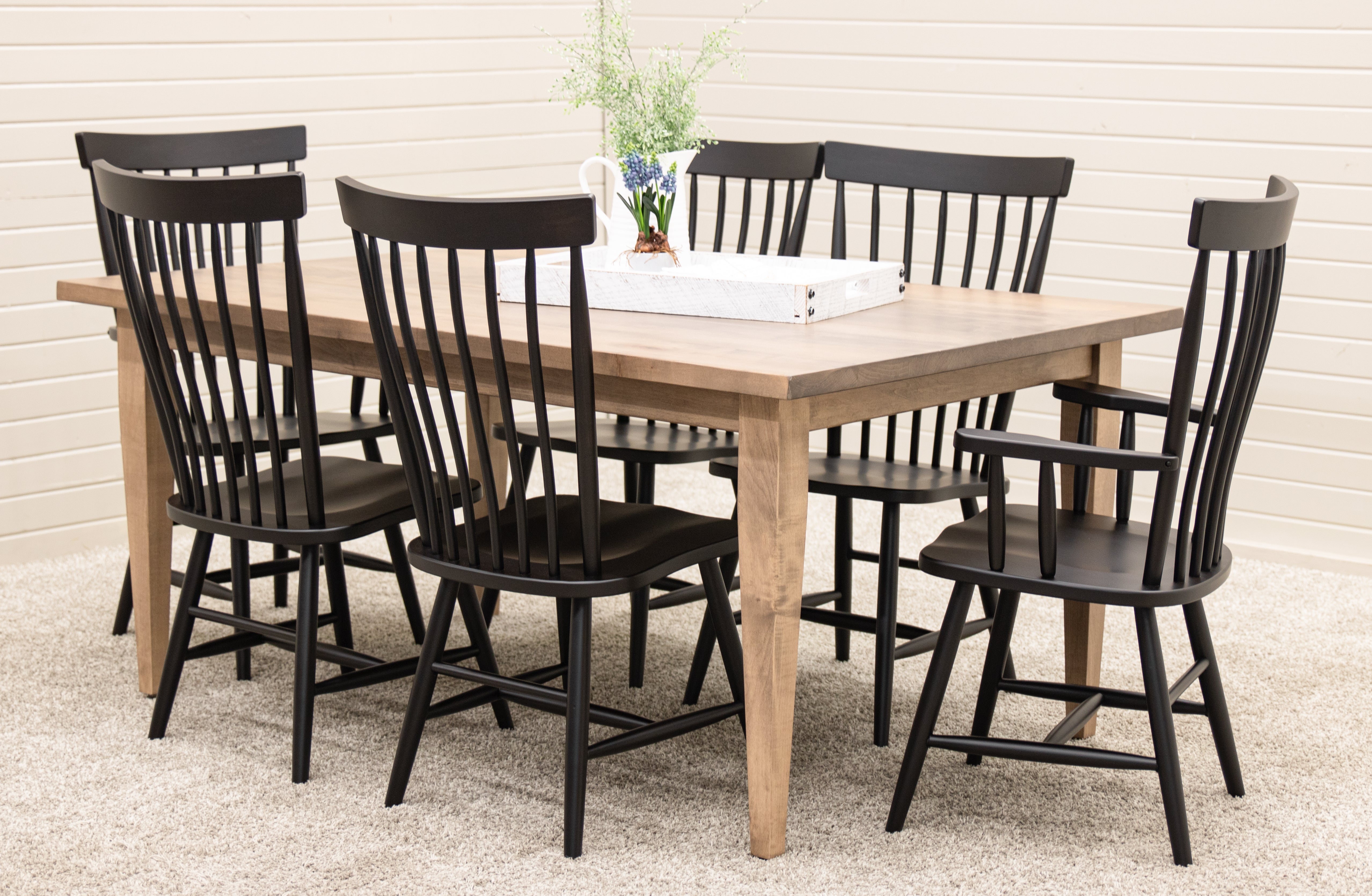 One of our favorite solid wood top tables with shaker legs is the Classic Shaker table. This 42x66 dining table with black legs in Brown Maple and an Elm wood top is a perennial favorite. Complete the Shaker furniture set with a matching Biltmore Corner Hutch and Fostoria dining chairs.