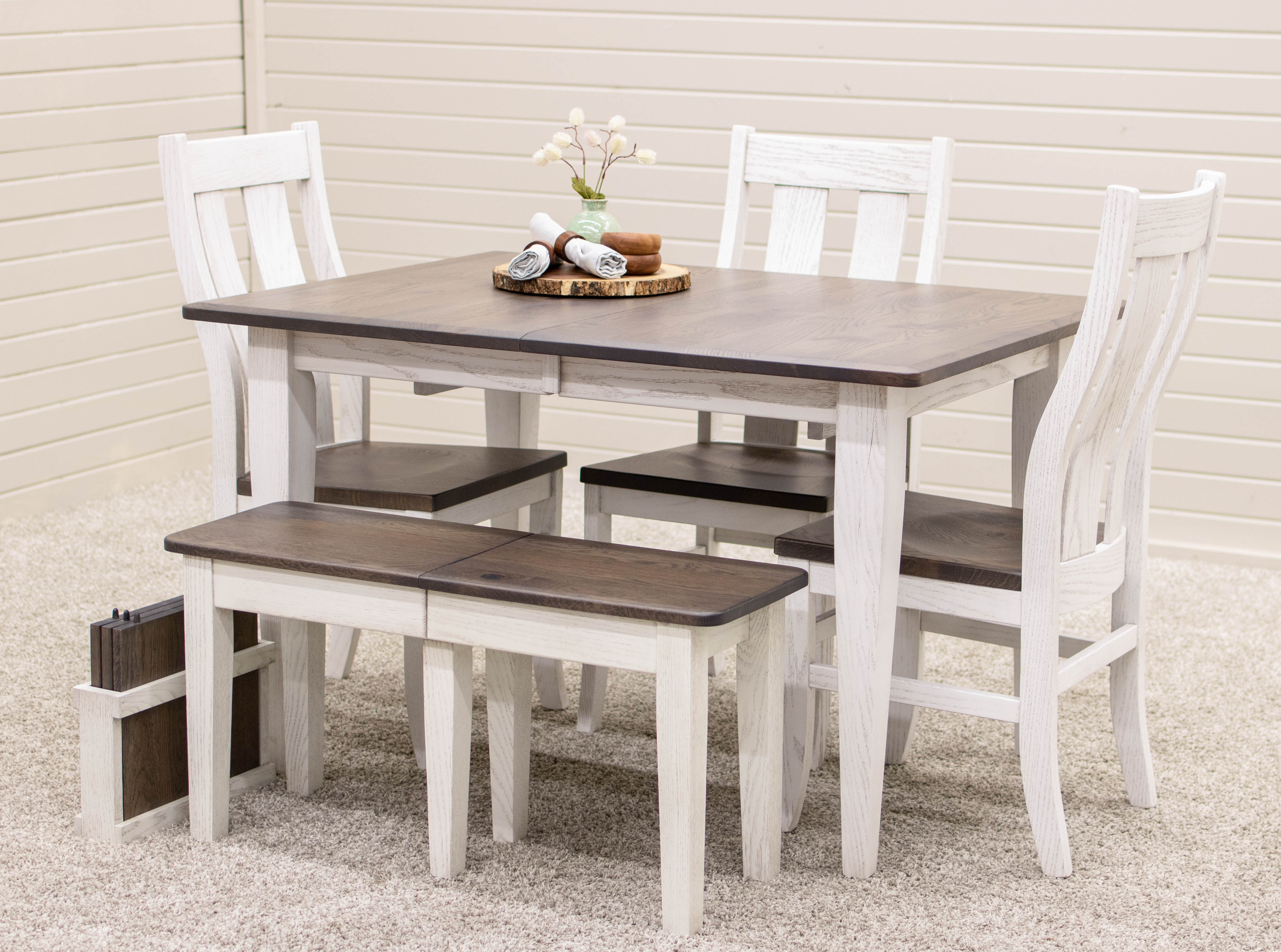 Options for wood type include local hardwoods like Red and White Oak, Maple, Cherry, Elm, Walnut and Hickory. Browse the gallery for a complete list of all the stain and paint color options. This flexibility lets you design the best Shaker dining set or farmhouse table for your home.
