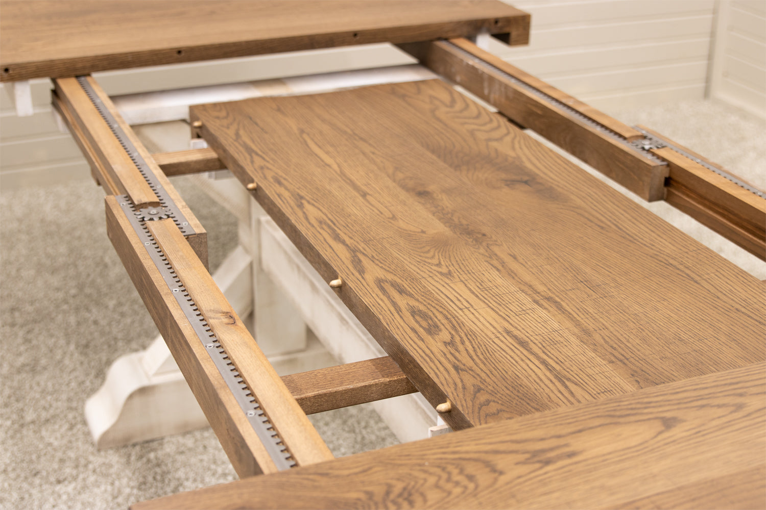 The most common way for a table to extend is the tabletop opening from the center to add leaves. Gear slides make it easy for the table to open smoothly. Most tables can store 1-4 leaves inside the tabletop with this type of extension. The number of leaves stored varies by the thickness of the tabletop.