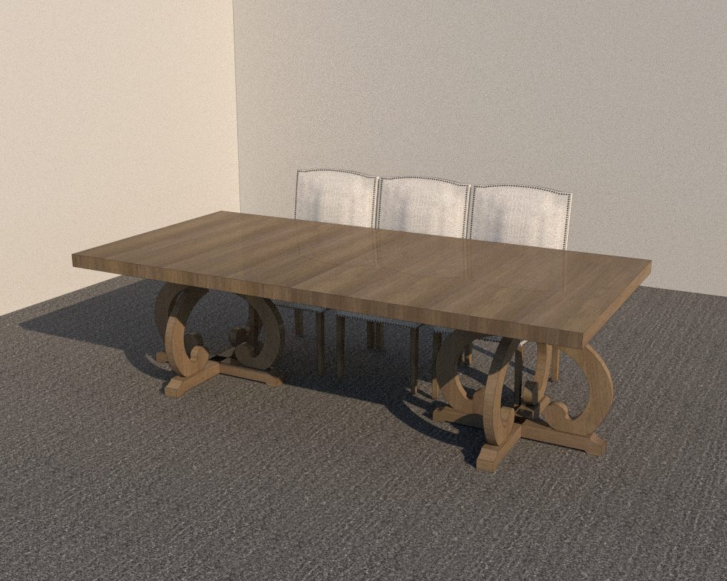 A beautiful custom pedestal vision, shown here for a customer in the requested table size. Notice how the end chairs will have to fit the base.