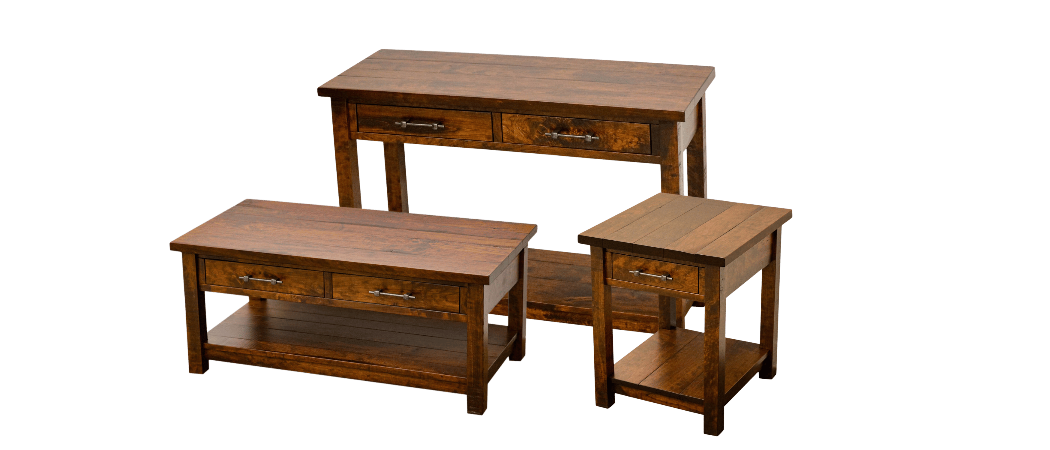The Arcadia Coffee Table Set features plank distressed tops, shown here in Cherry wood.