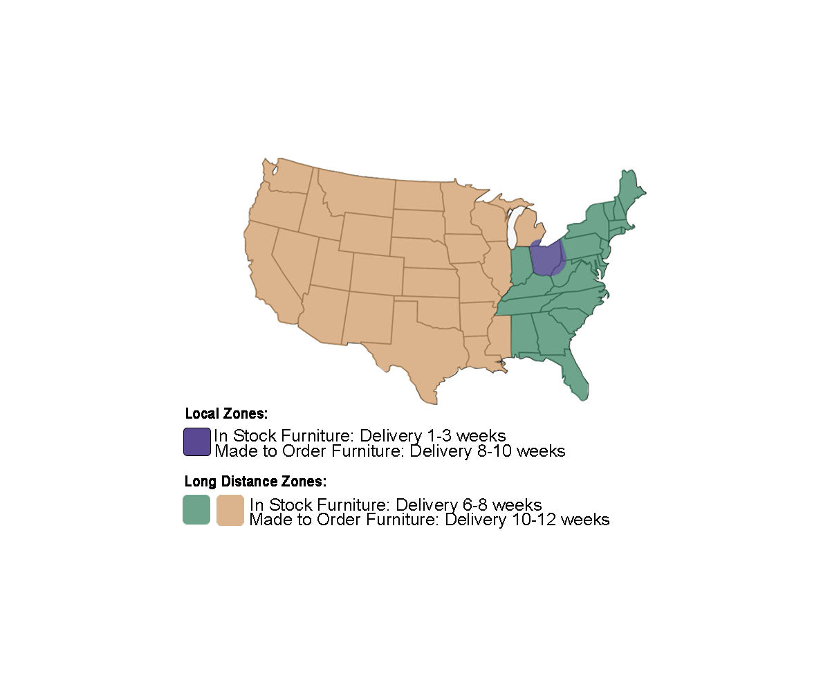 Delivery Timing - The timing of your delivery depends on your location and whether all the furniture ordered is currently in stock or will have to be custom built. All items purchased will be delivered at the same time. See map for approximate time frames.