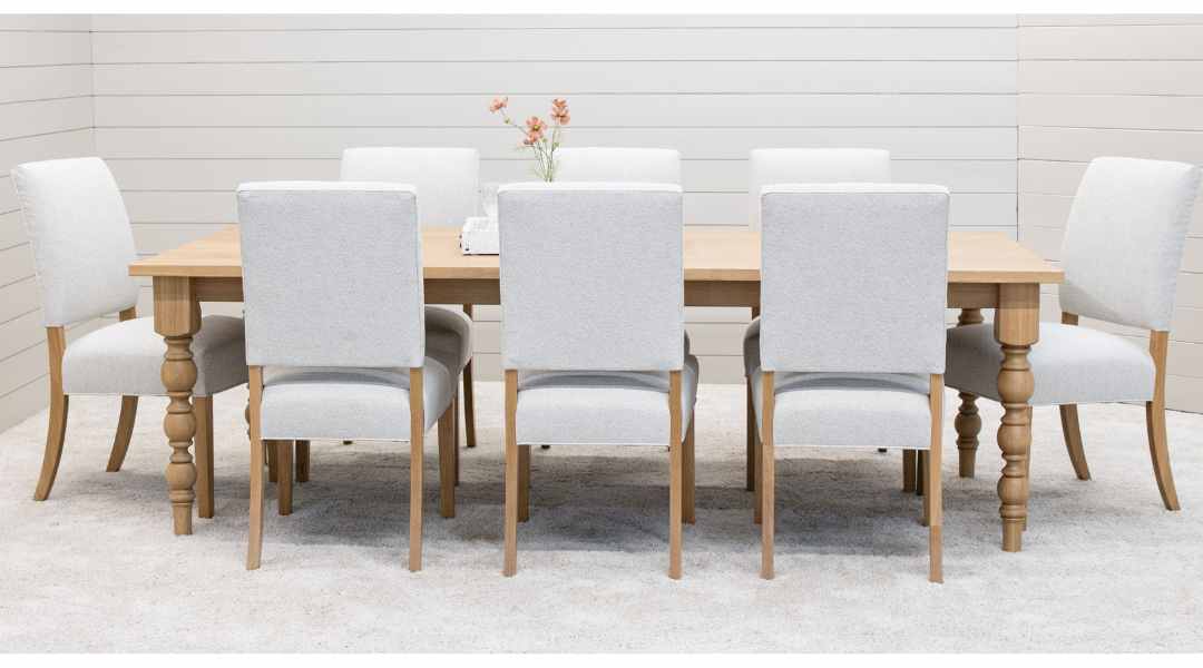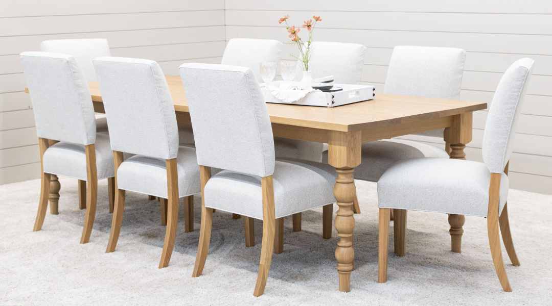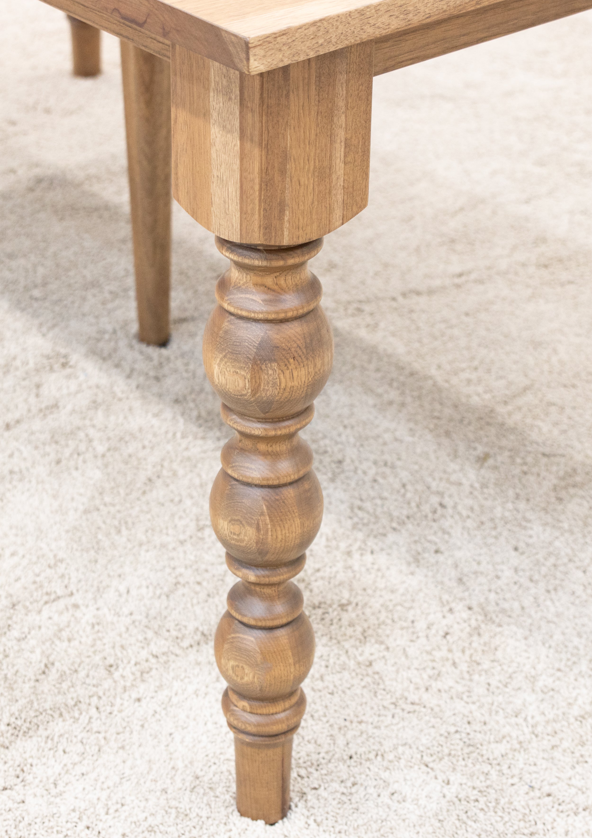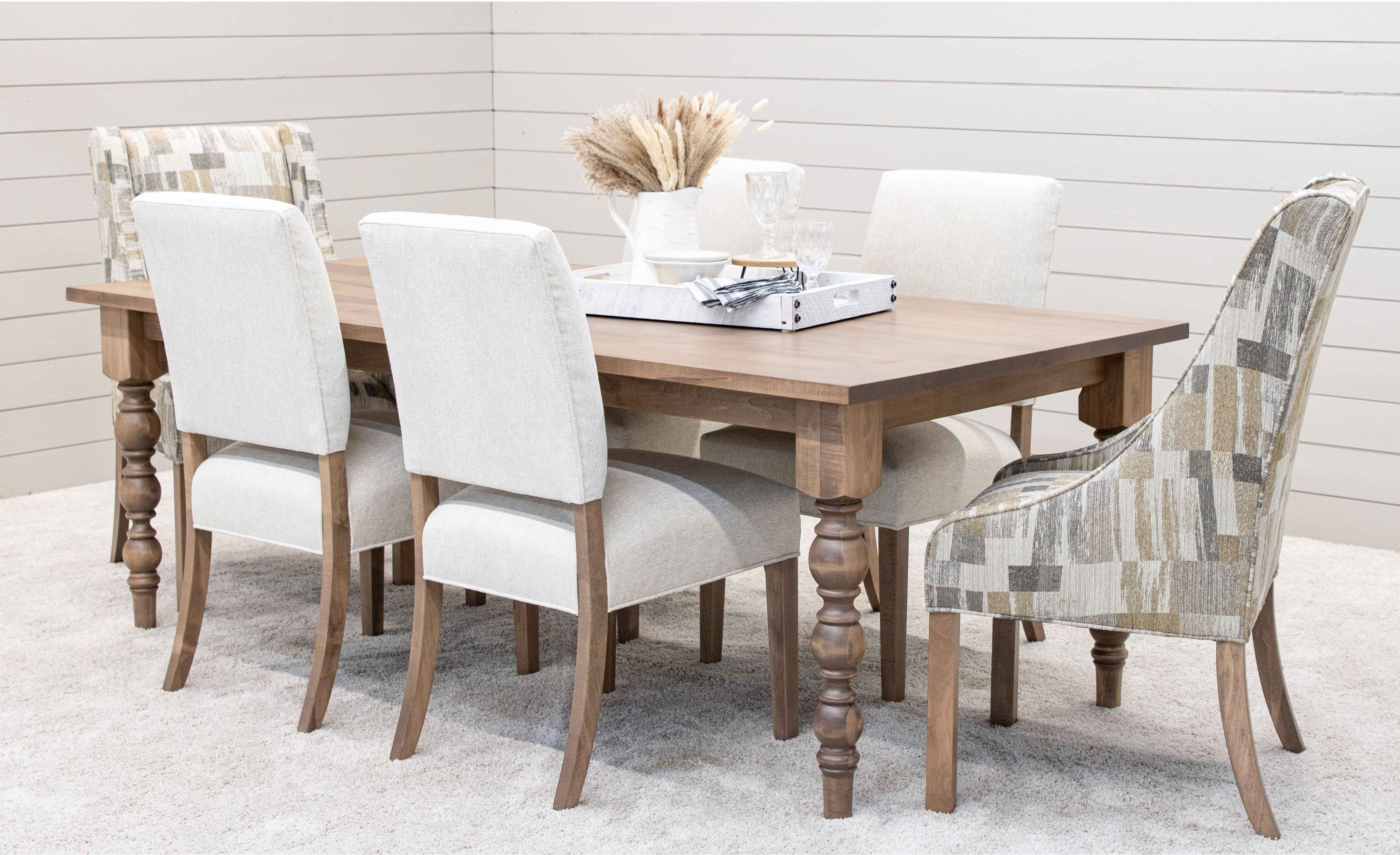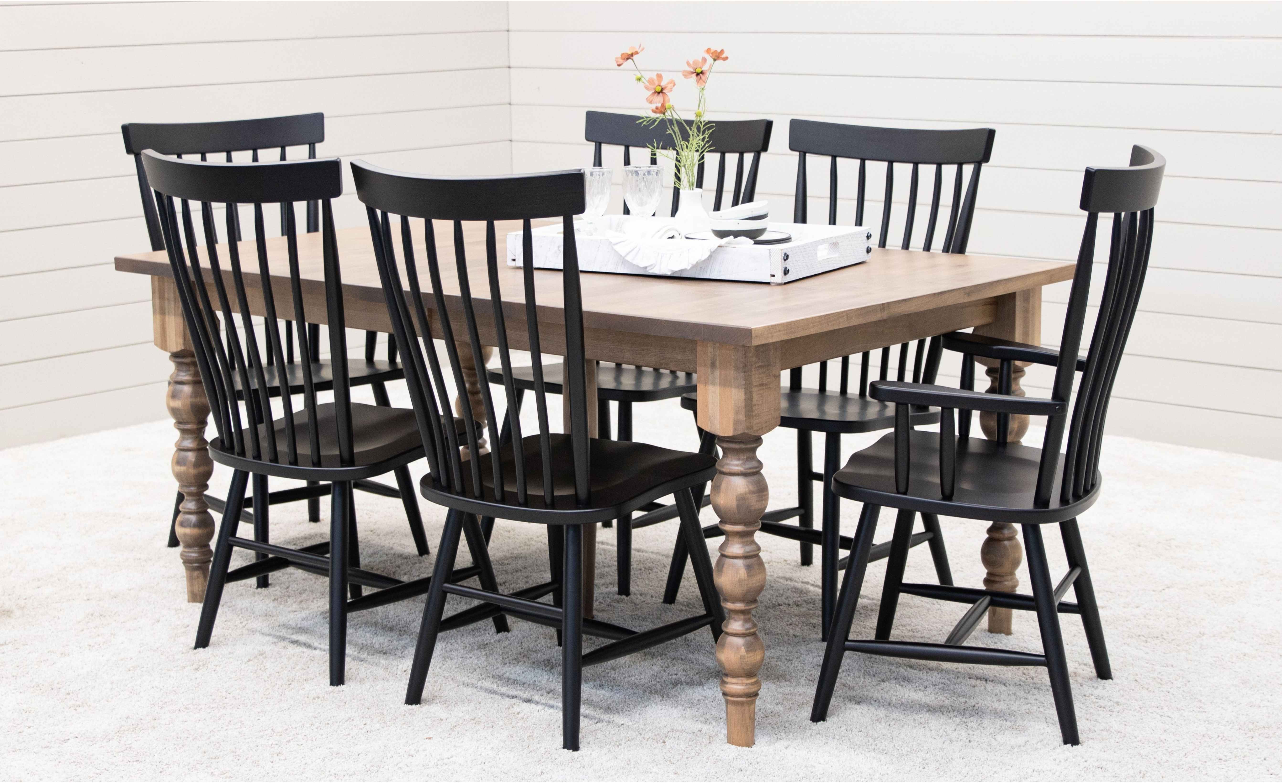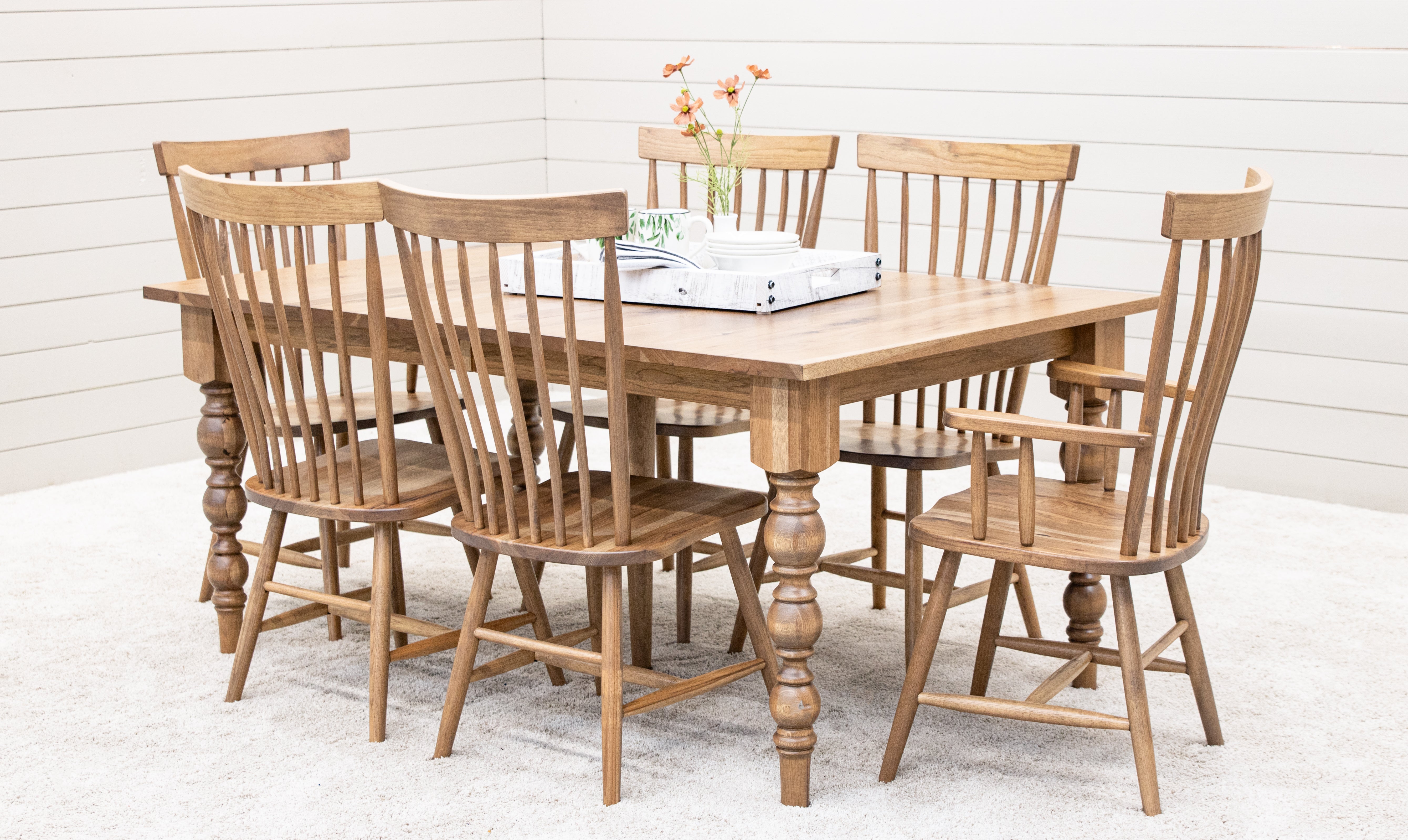Every dining table is available in your choice of wood type and stain color. Wood options include Red or White Oak, Maple, Cherry, Hickory, Elm, and Walnut wood.