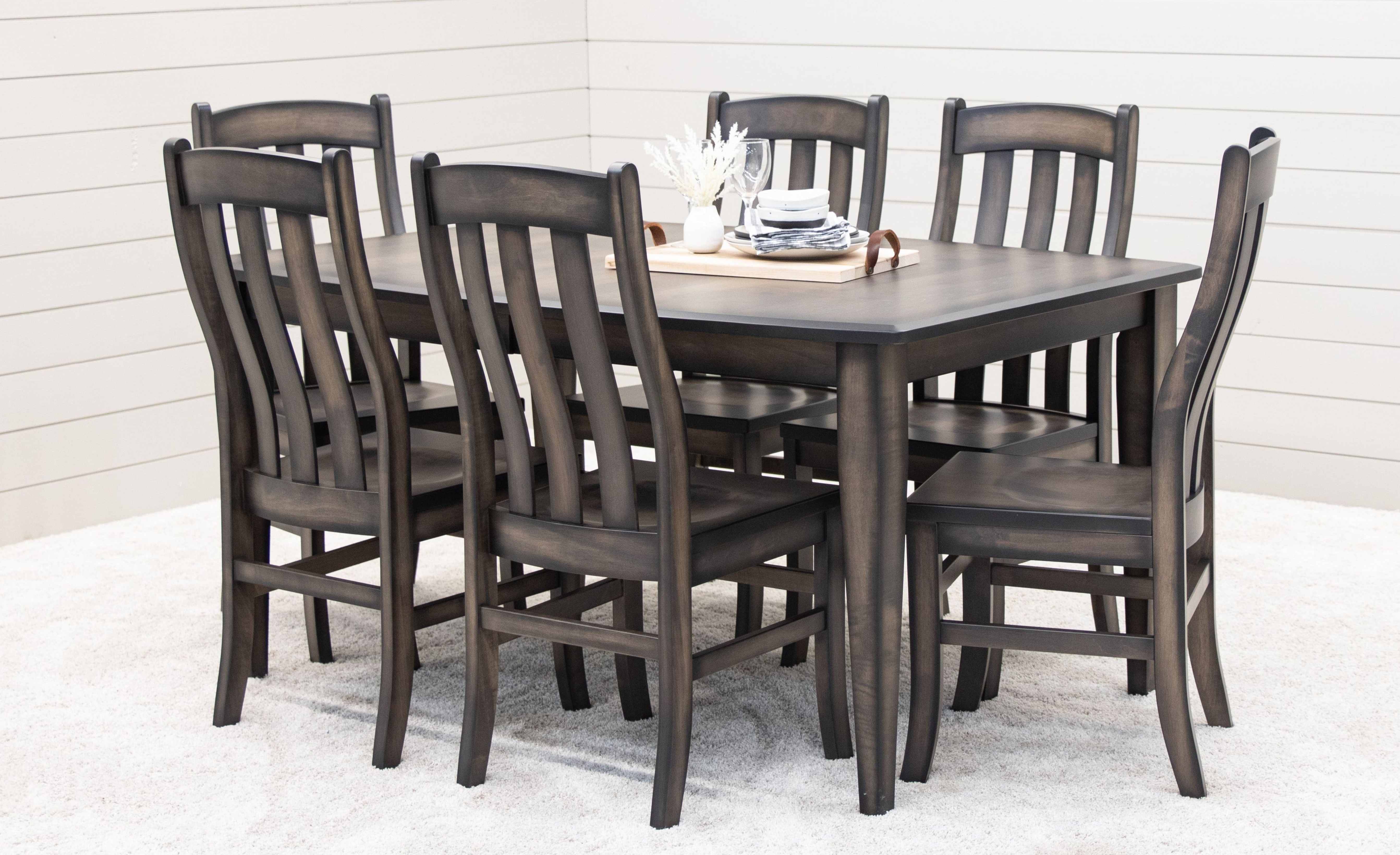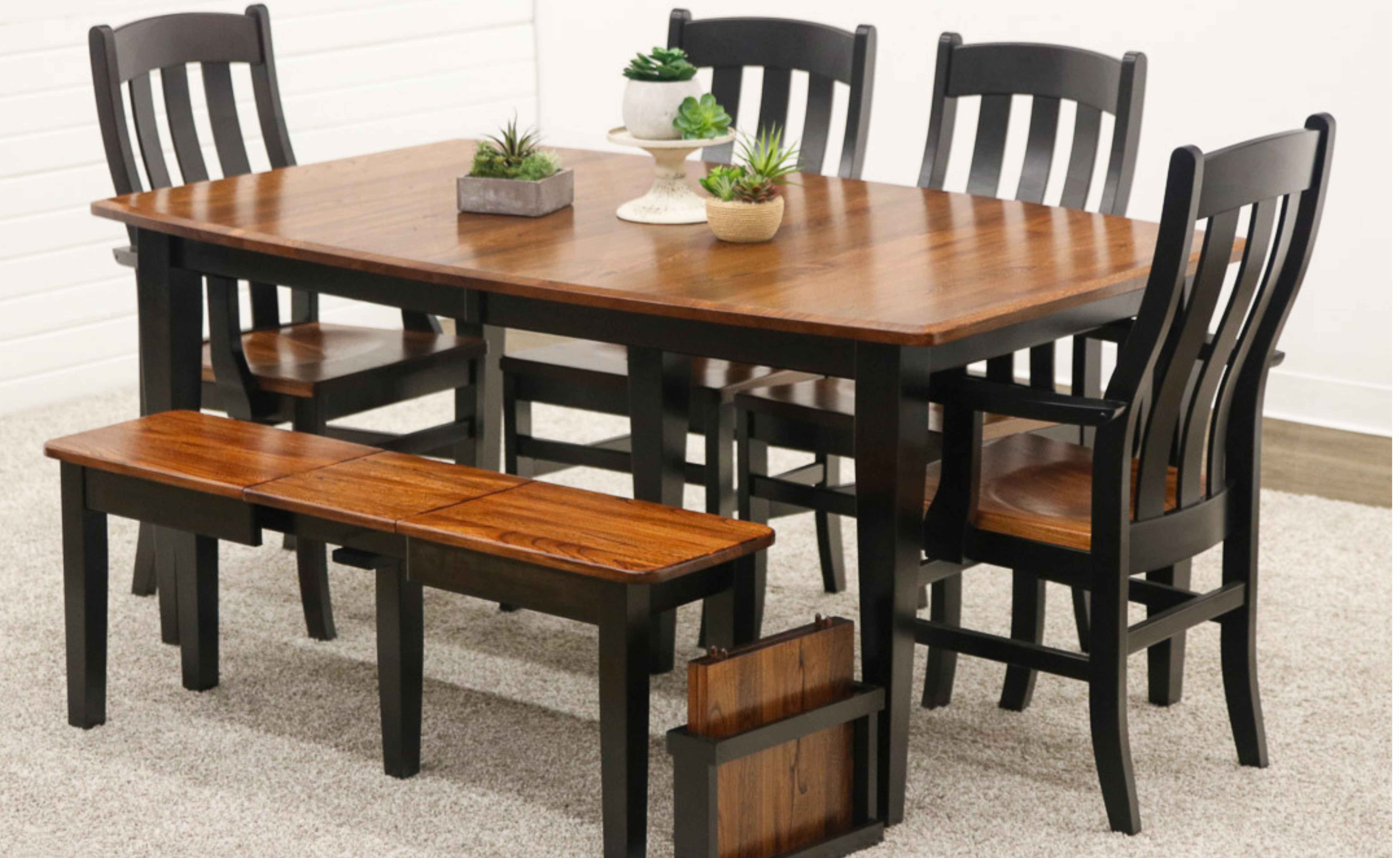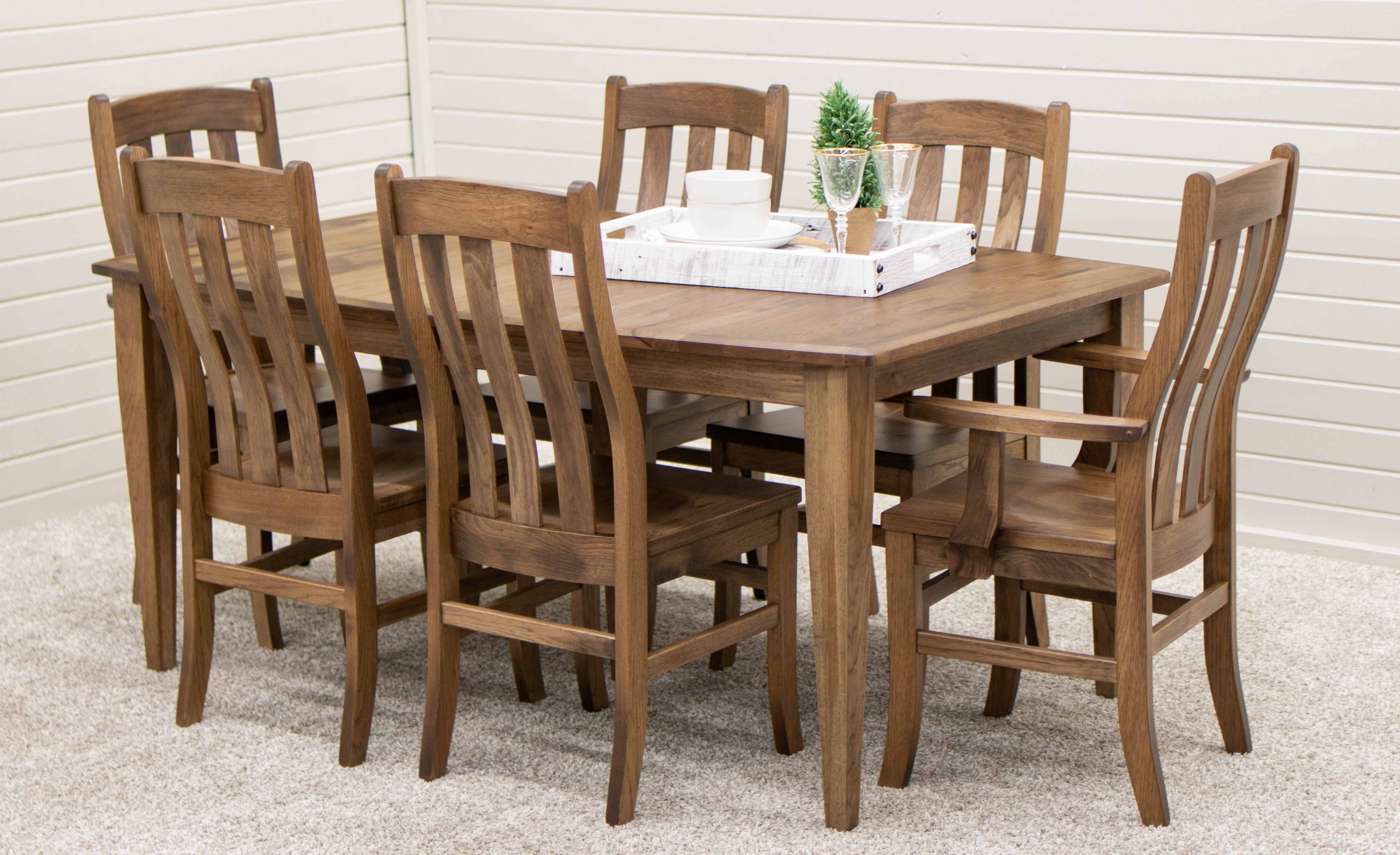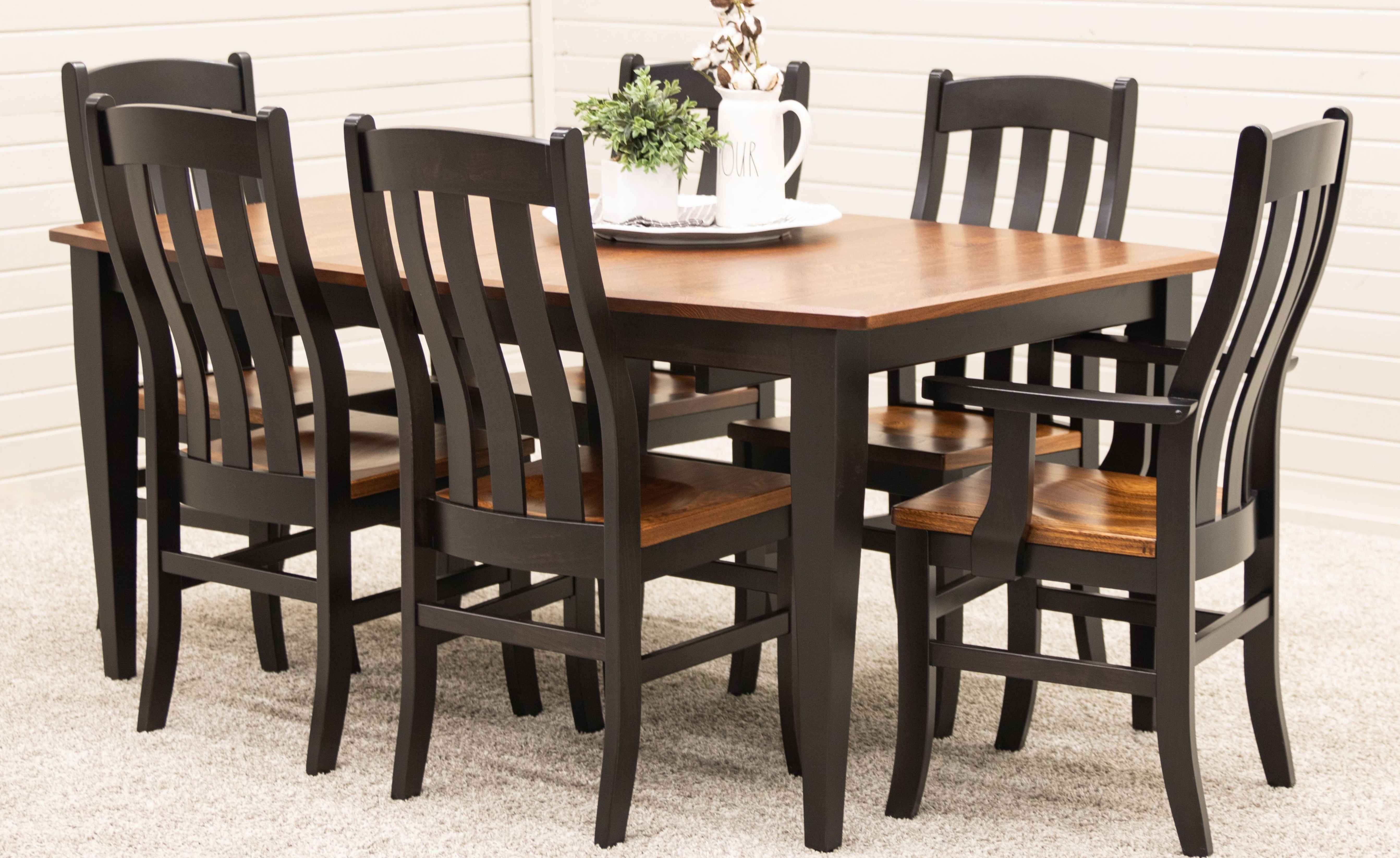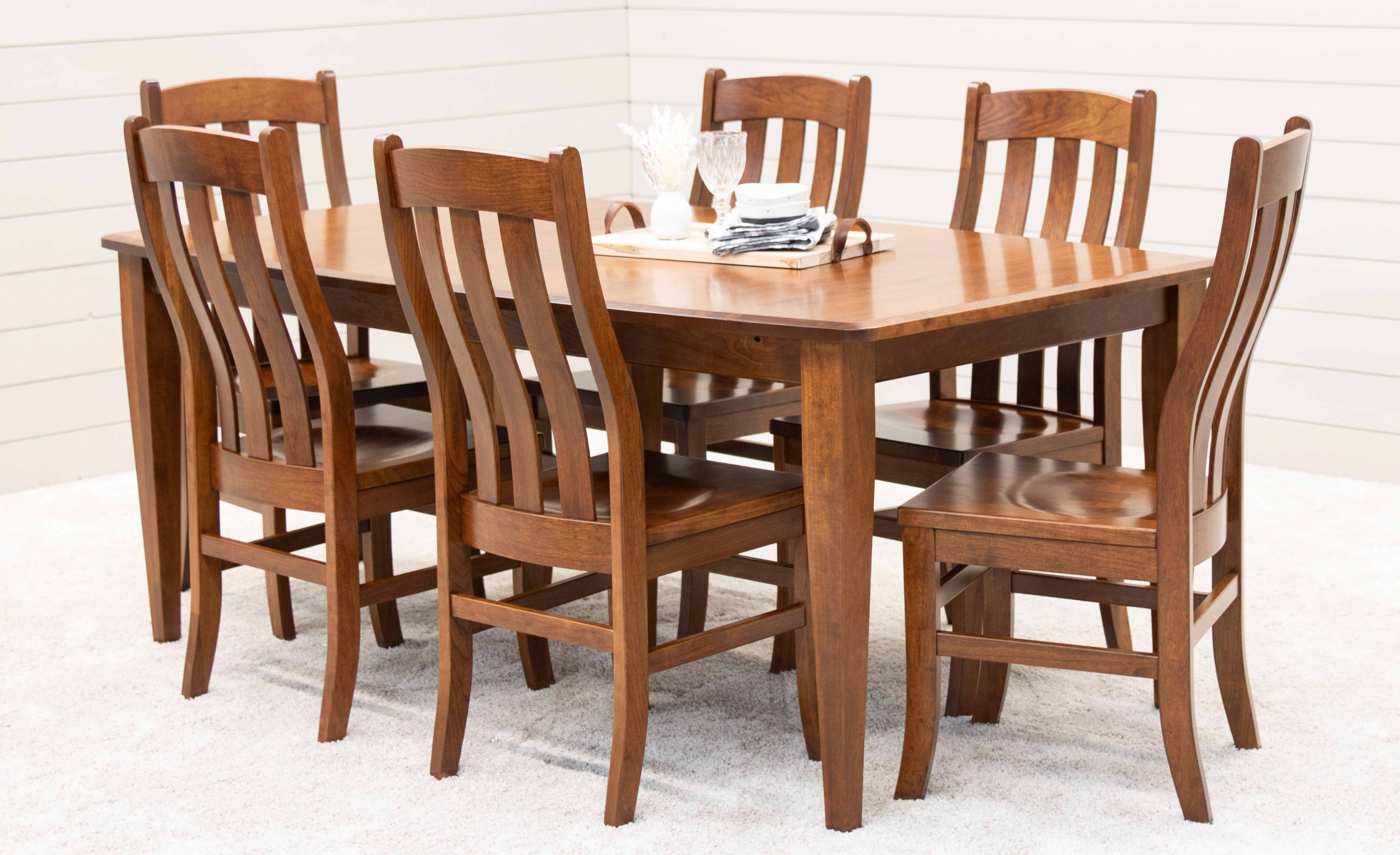 Every dining table is available in your choice of wood type and stain color. Wood options include Red or White Oak, Maple, Cherry, Hickory, Elm, and Walnut wood.