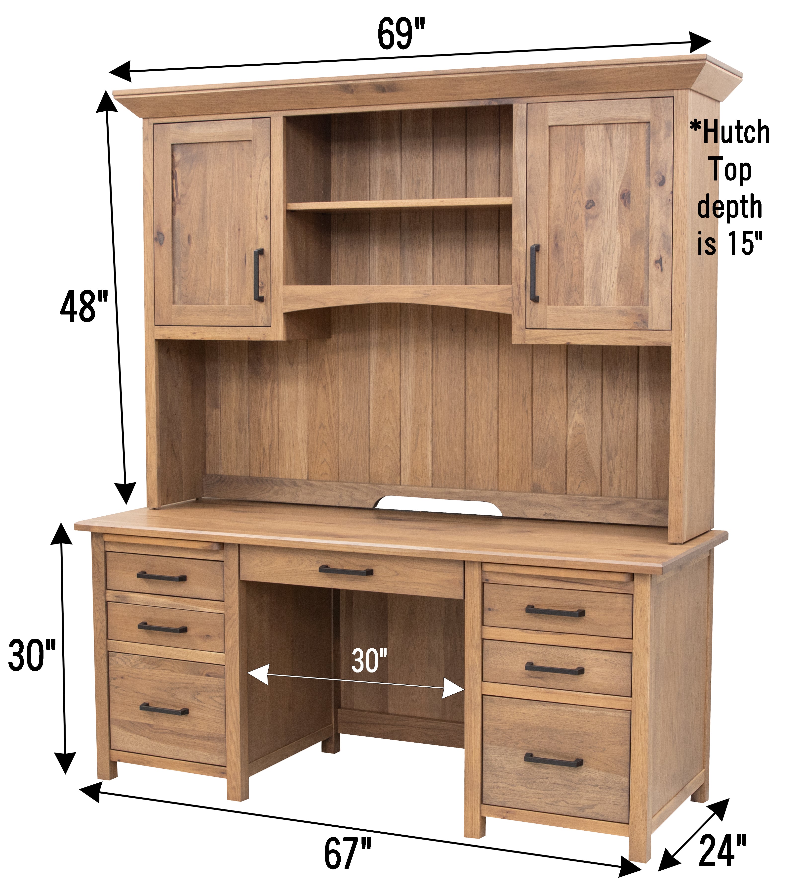 The Jackson Desk with Hutch Top features a shiplap back and pullout boards within the desk. Each side has a file drawer at the bottom and regular drawers above that. The hutch top offers extra storage space, making the desk spacious and functional for any office. The Amish made desk can be ordered in your choice of wood and color. For more details, contact us at Dutch Craft Furniture.