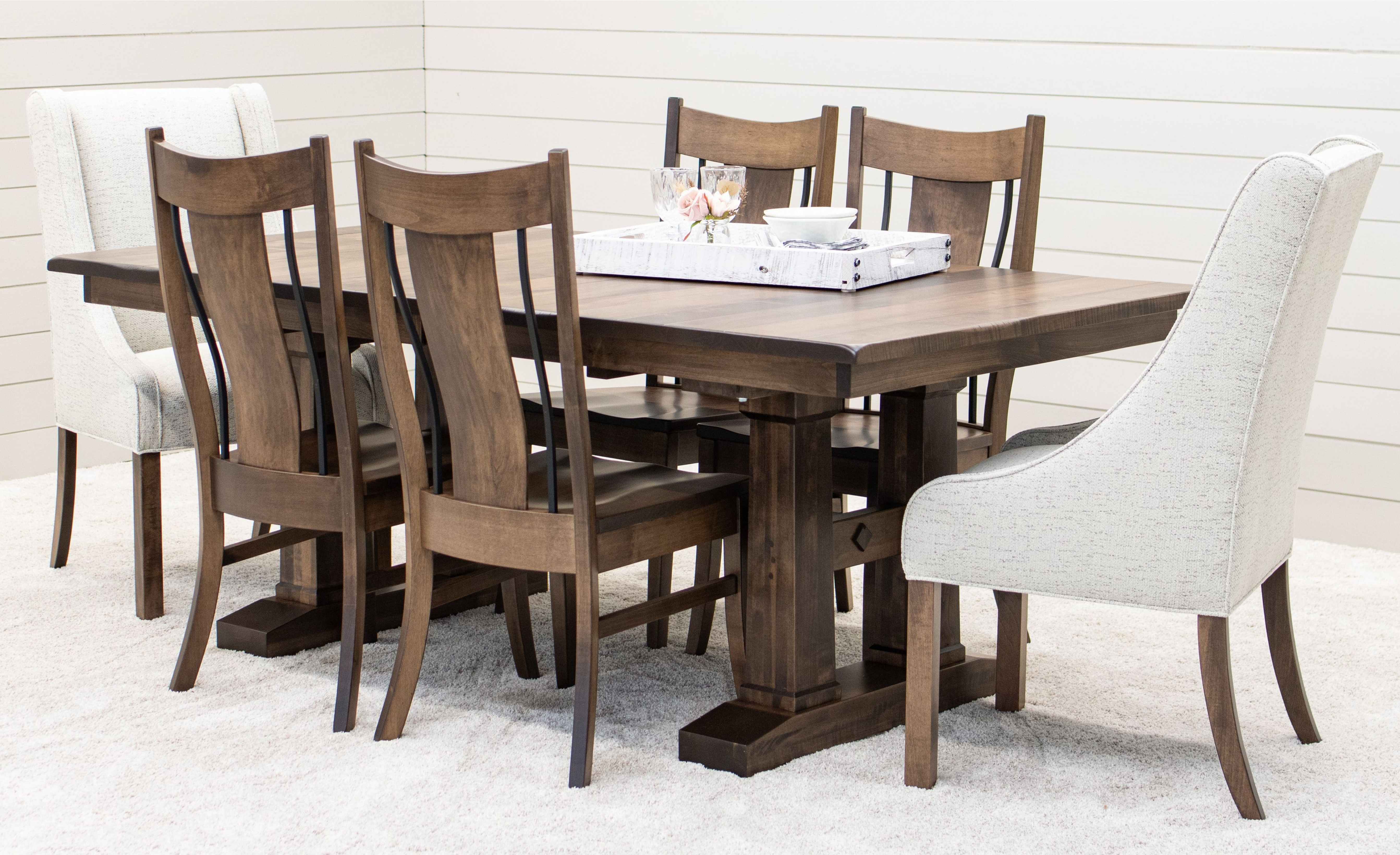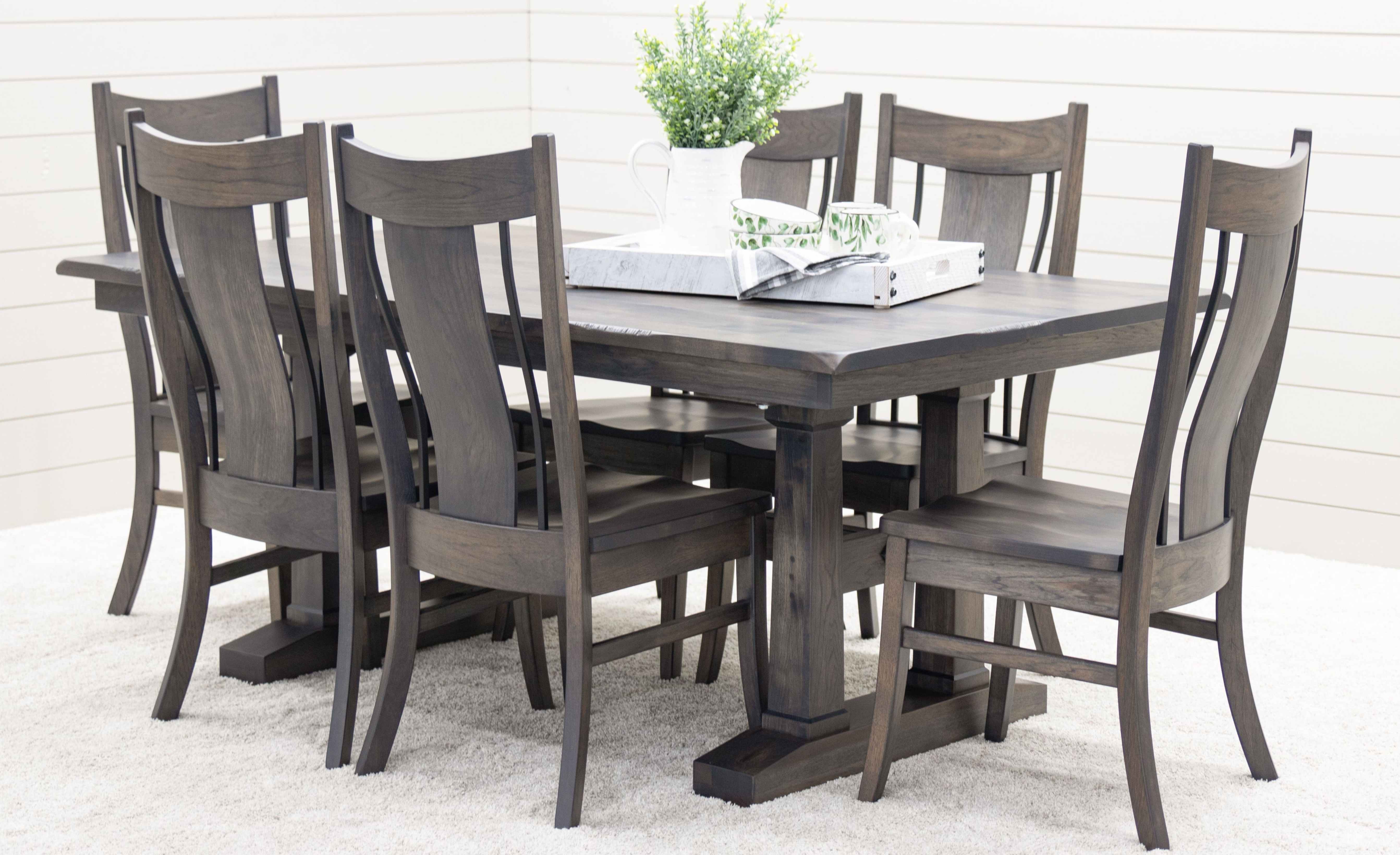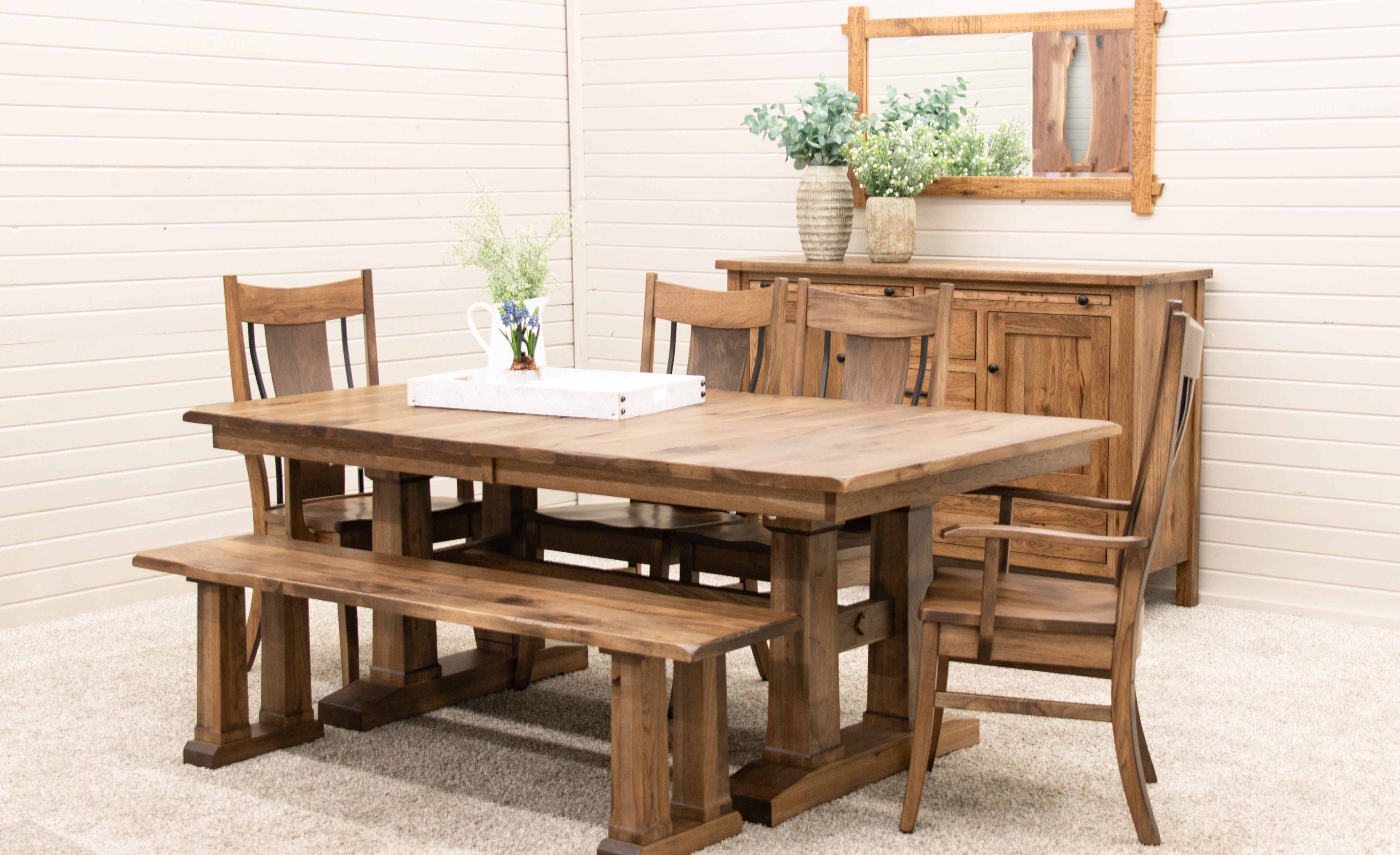 Every dining table is available in your choice of wood type and stain color. Wood options include Red or White Oak, Maple, Cherry, Hickory, Elm, and Walnut wood.