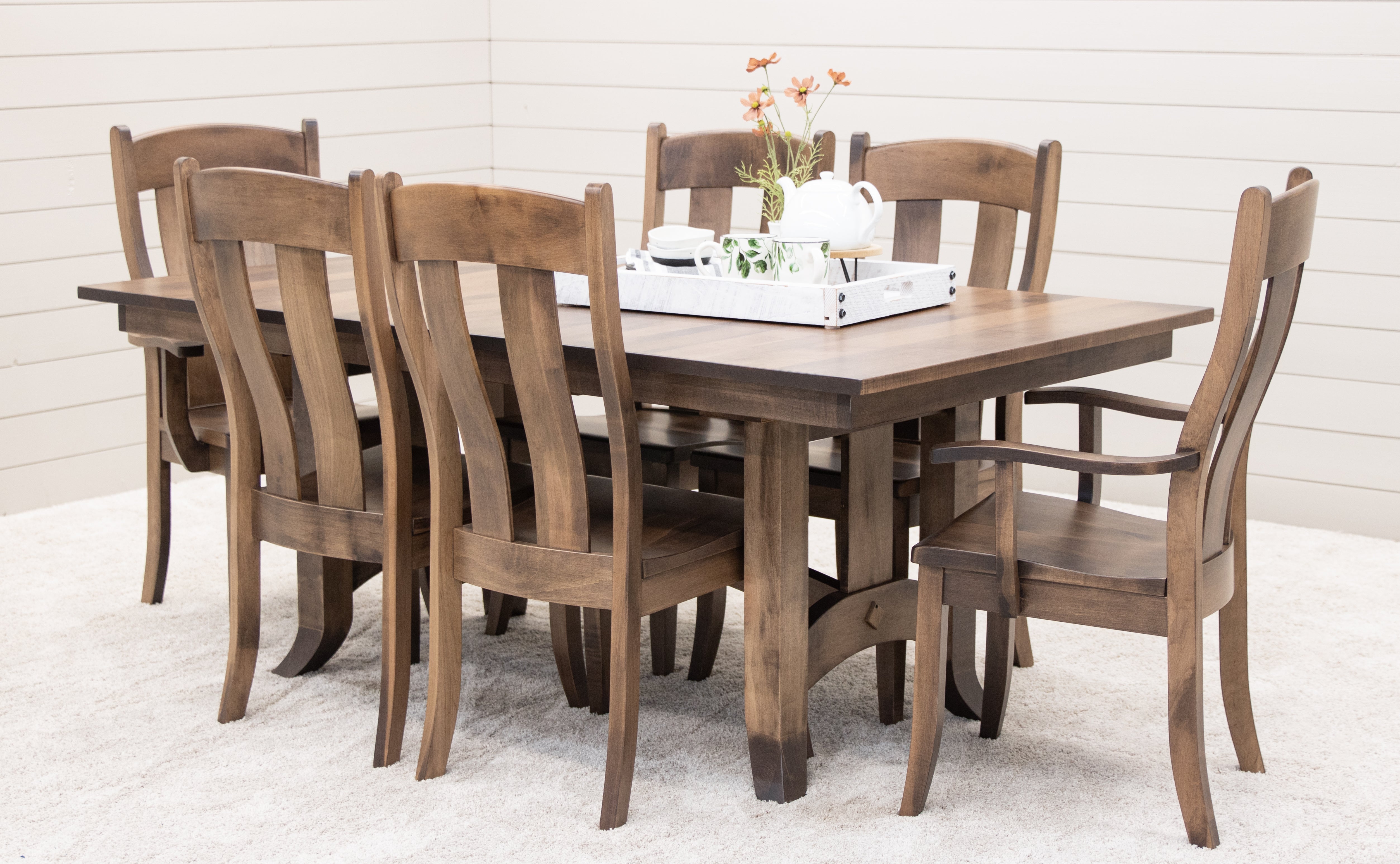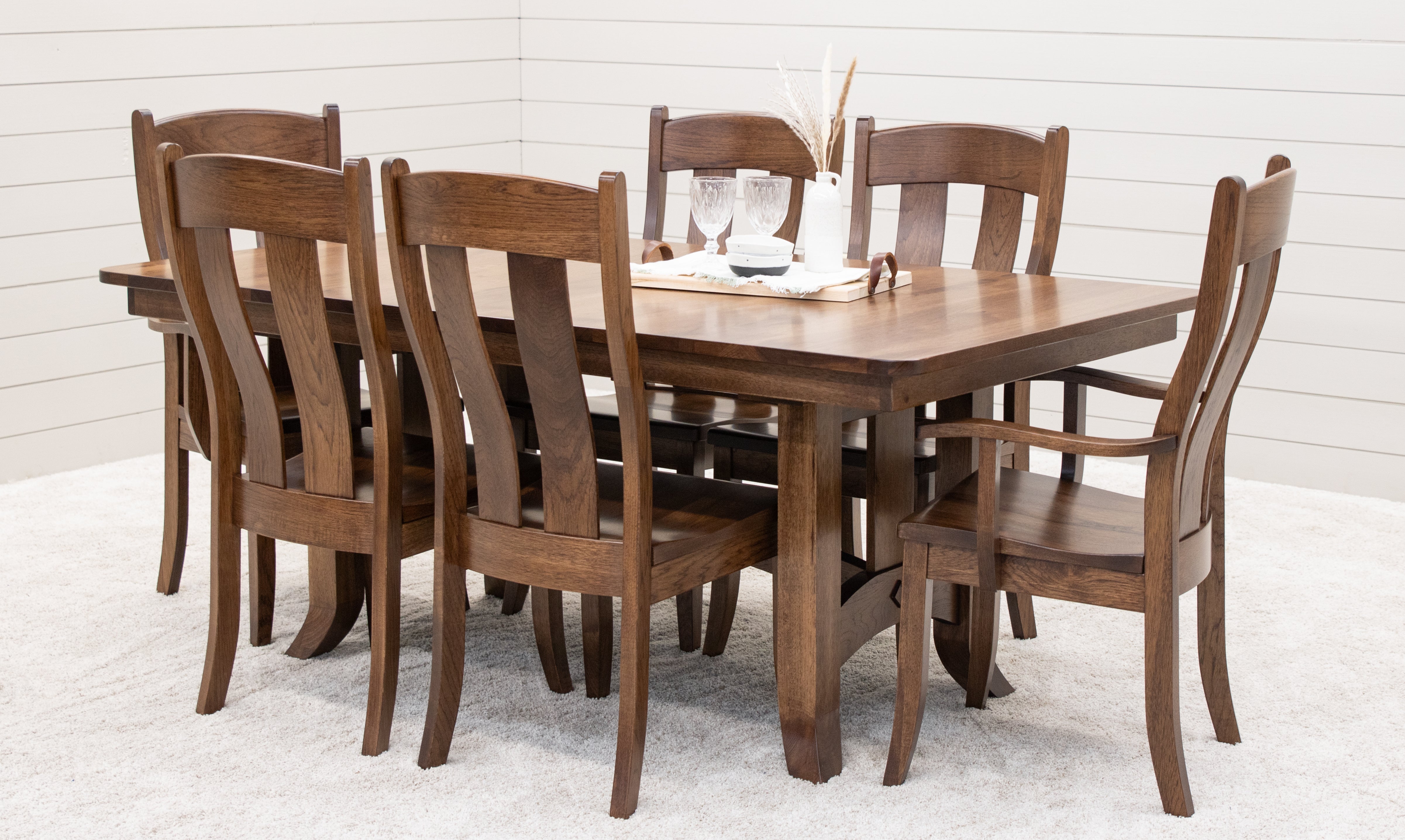 Every dining table is available in your choice of wood type and stain color. Wood options include Red or White Oak, Maple, Cherry, Hickory, Elm, and Walnut wood.