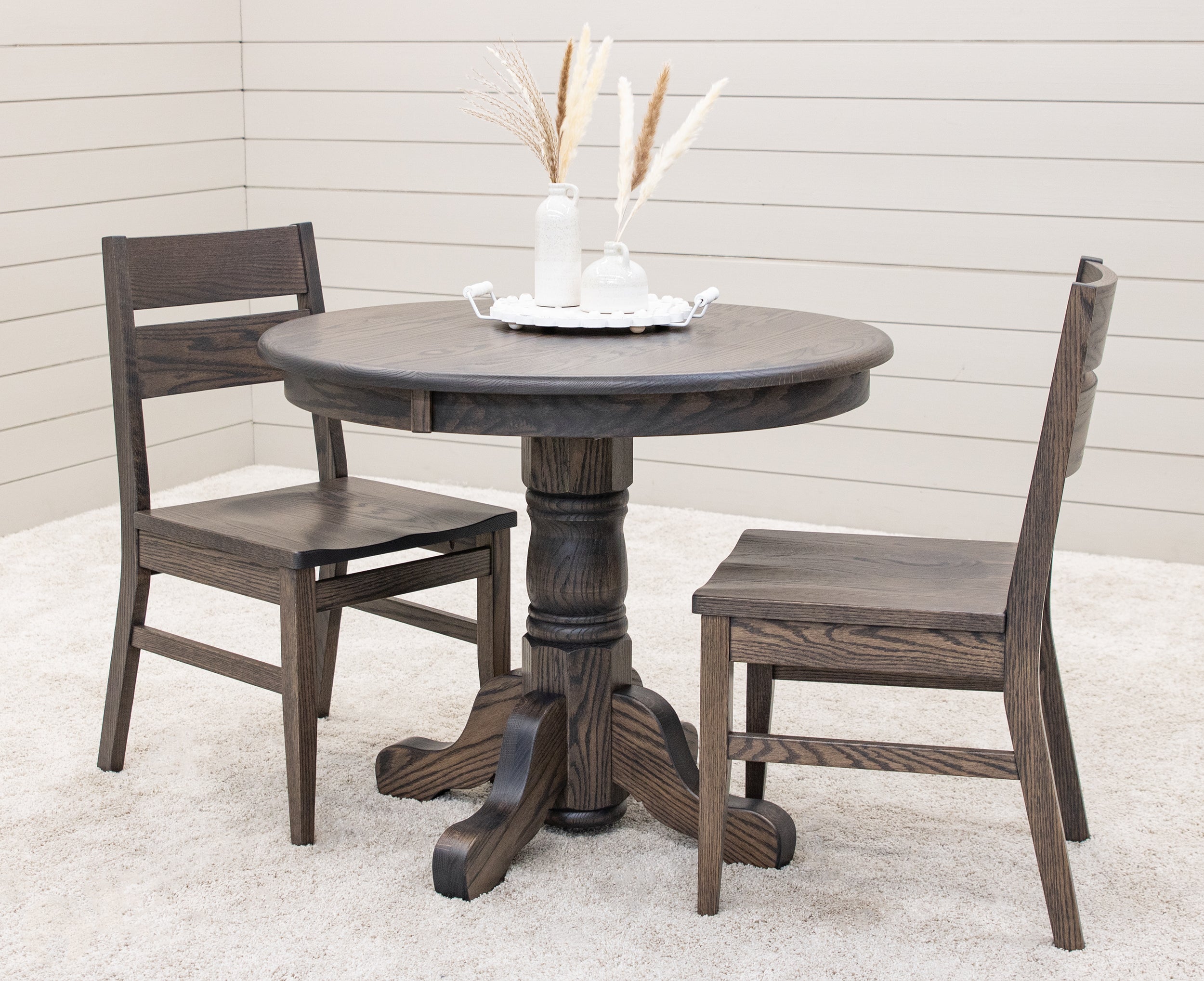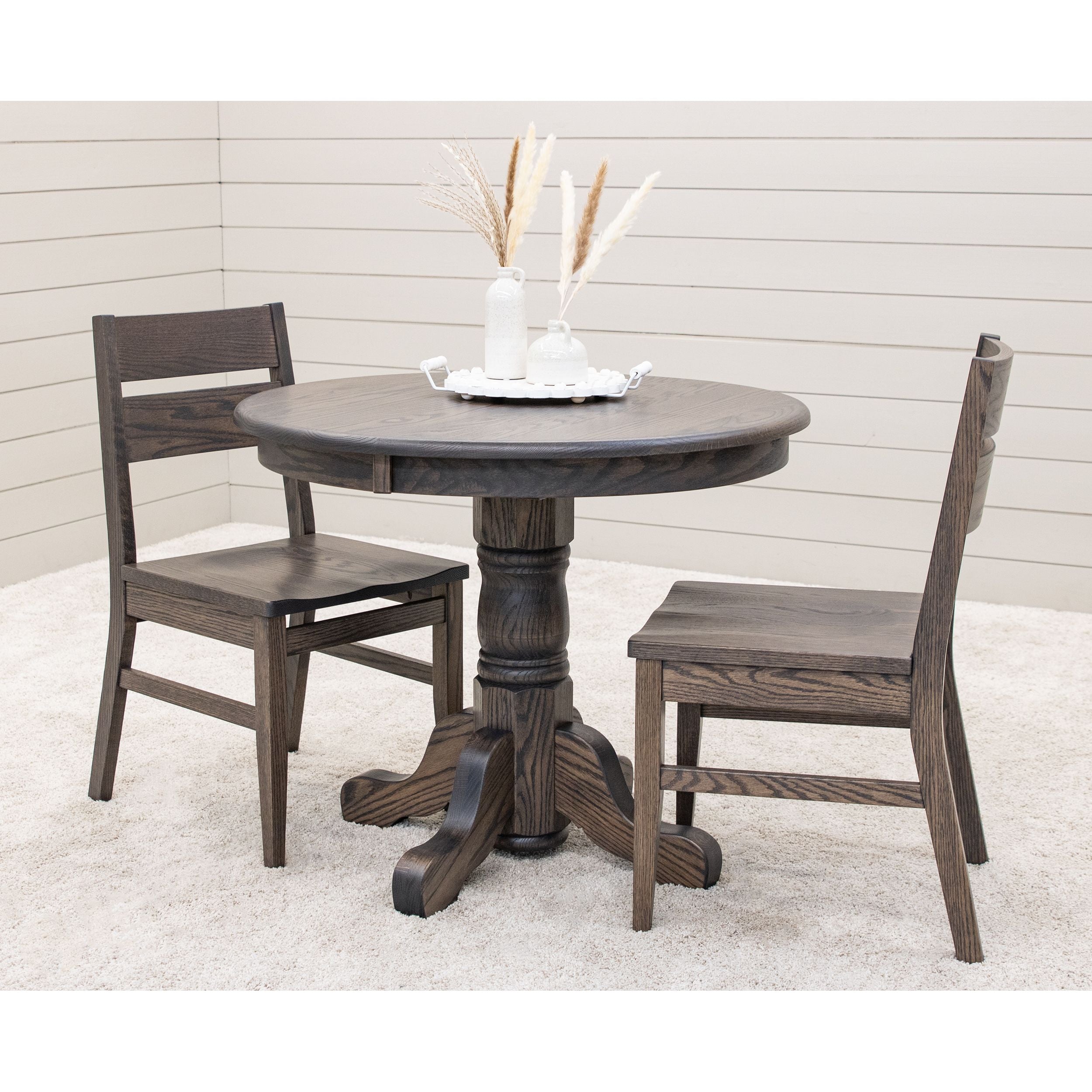 Every dining table is available in your choice of wood type and stain color. Wood options include Red or White Oak, Maple, Cherry, Hickory, Elm, and Walnut wood.